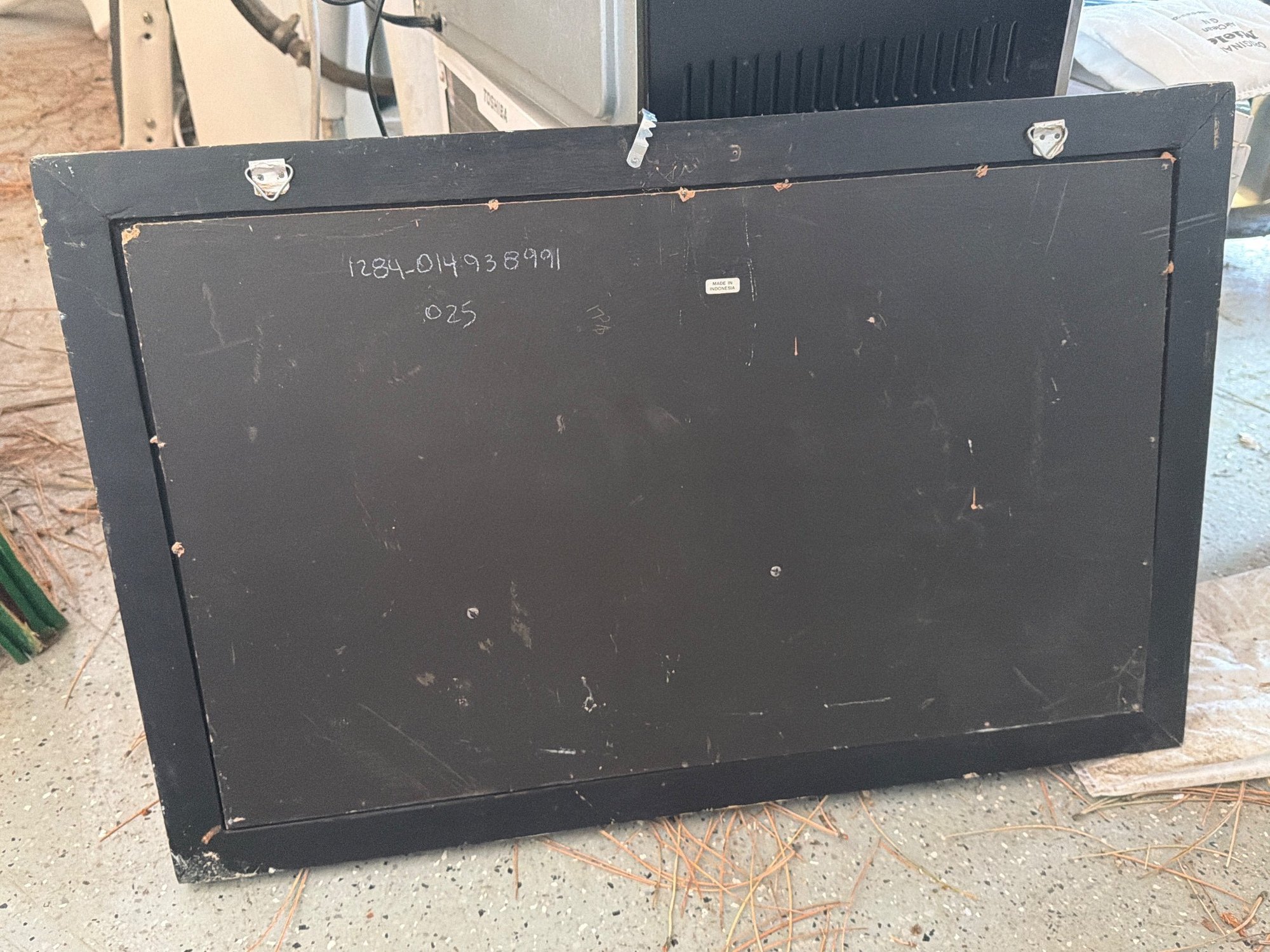 This wooden plaque features a hand-carved and painted rooster with intricate detailing on its body and tail. The rooster is set within a rectangular wooden frame coated in a distressed black finish, showcasing traditional craftsmanship. The visible hardware on the back indicates its readiness for wall mounting. Overall dimensions are approximately 24 inches wide by 16 inches tall.