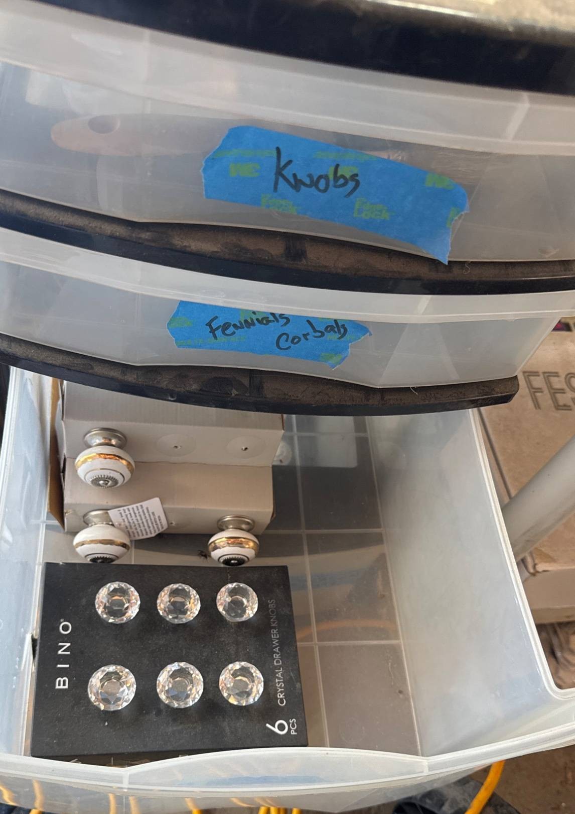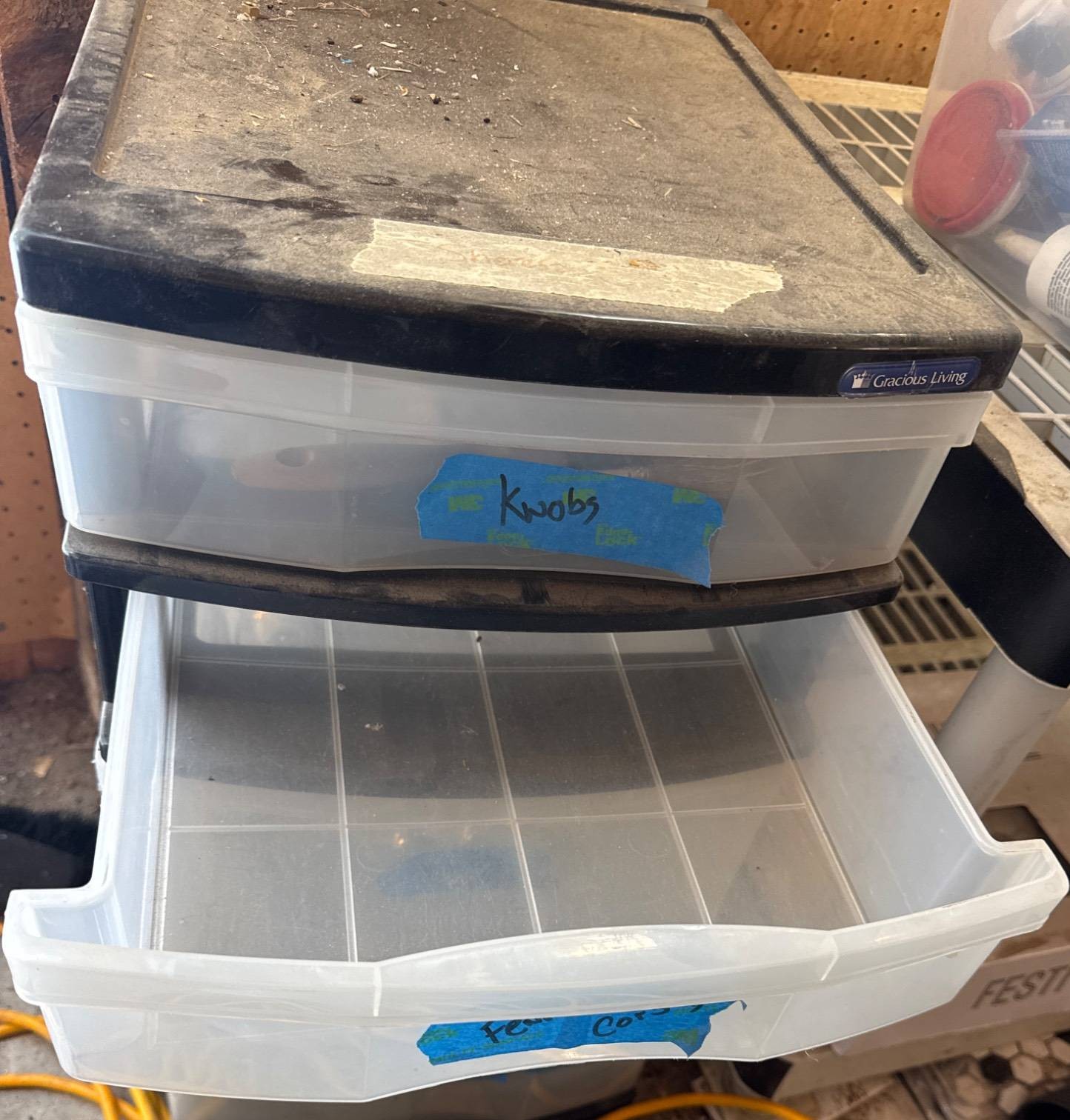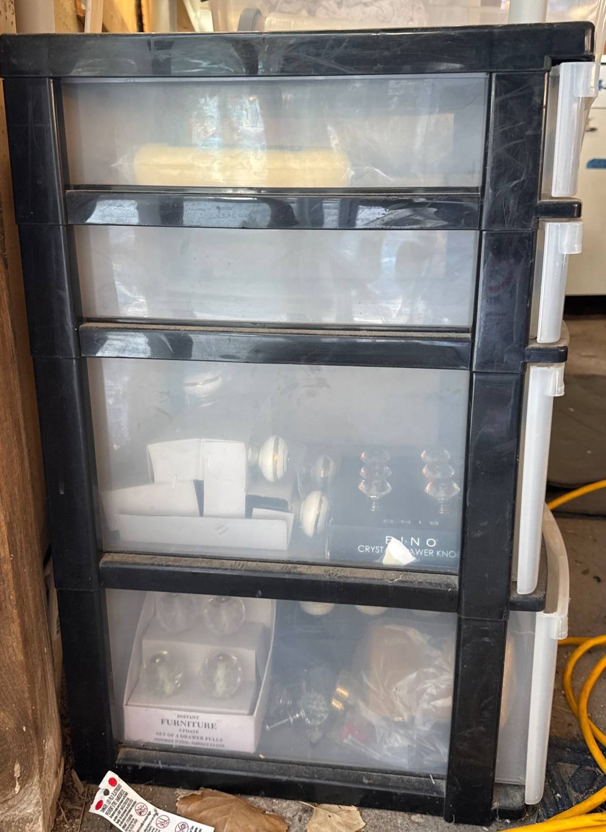 Four-drawer plastic storage unit in black with translucent drawers labeled for organizing items such as knobs, cabinet hardware, and paint supplies. Each drawer contains assorted hardware and accessories, including cabinet knobs, rollers, and brushes. The top surface shows signs of wear and use. Dimensions: approximately 24 in H x 12 in W x 15 in D.