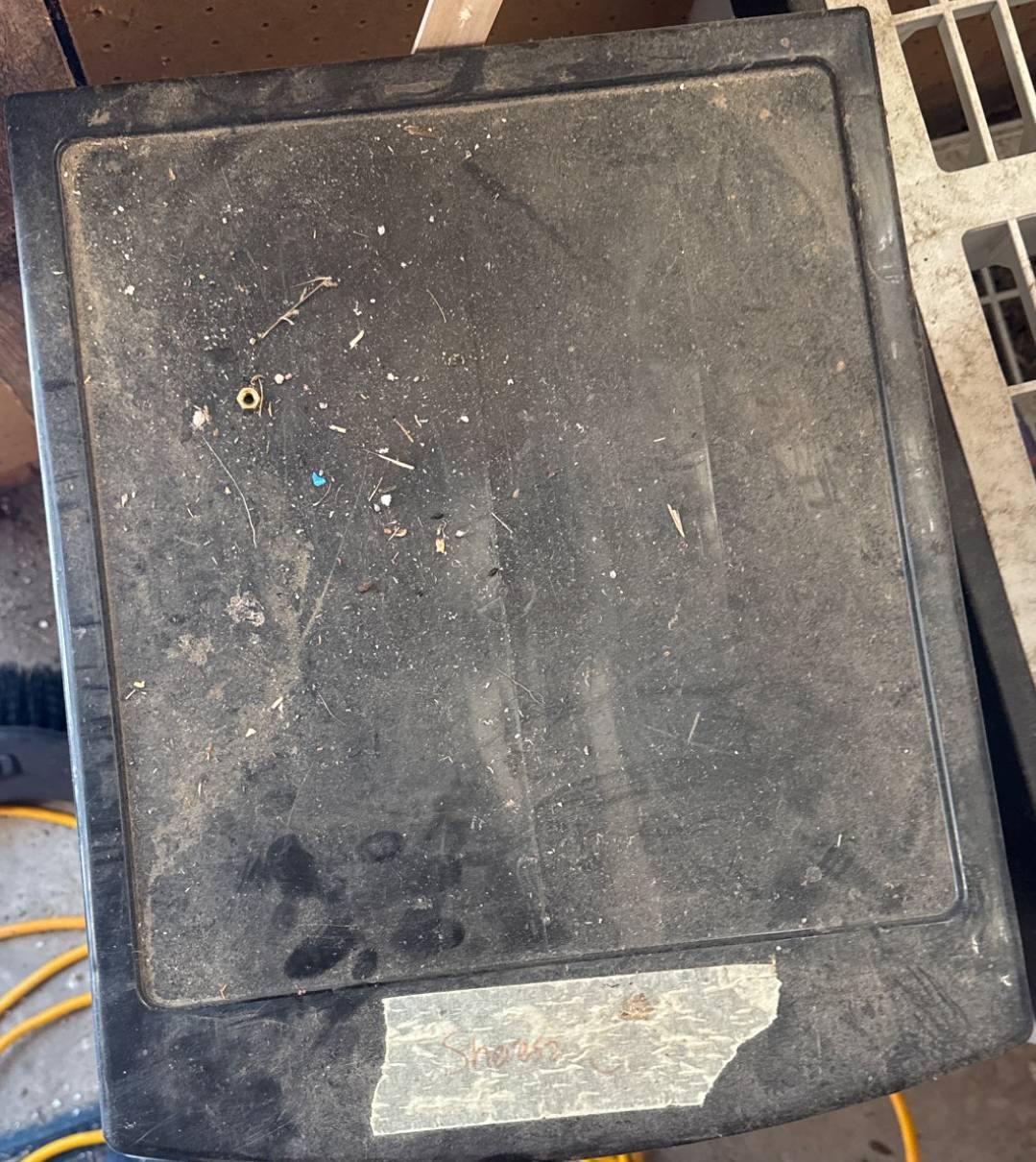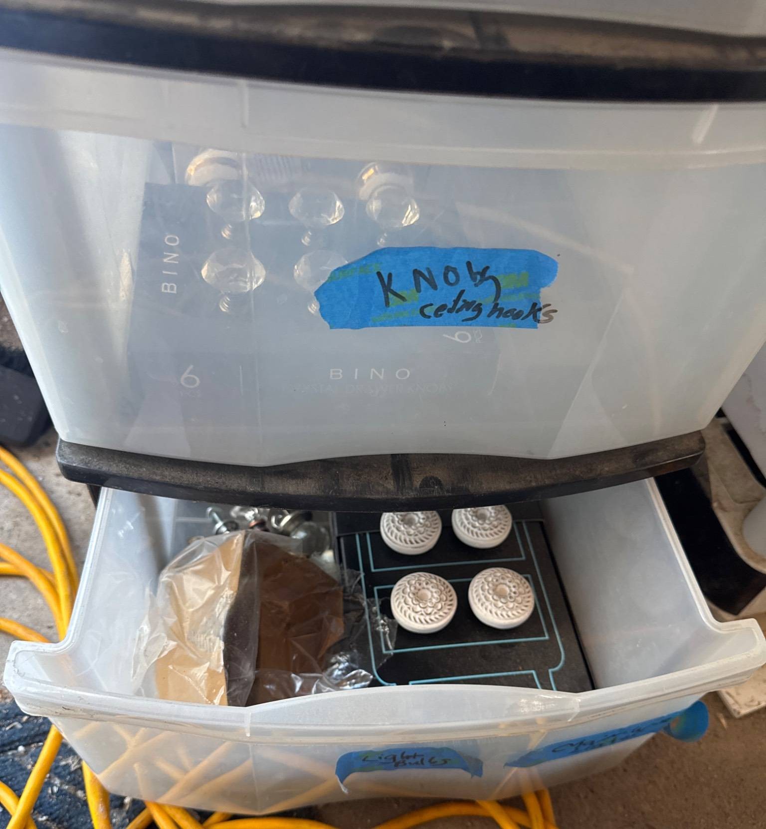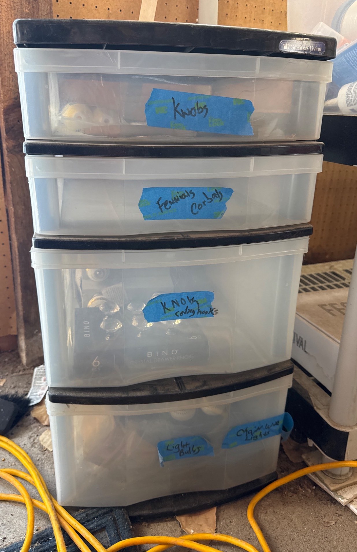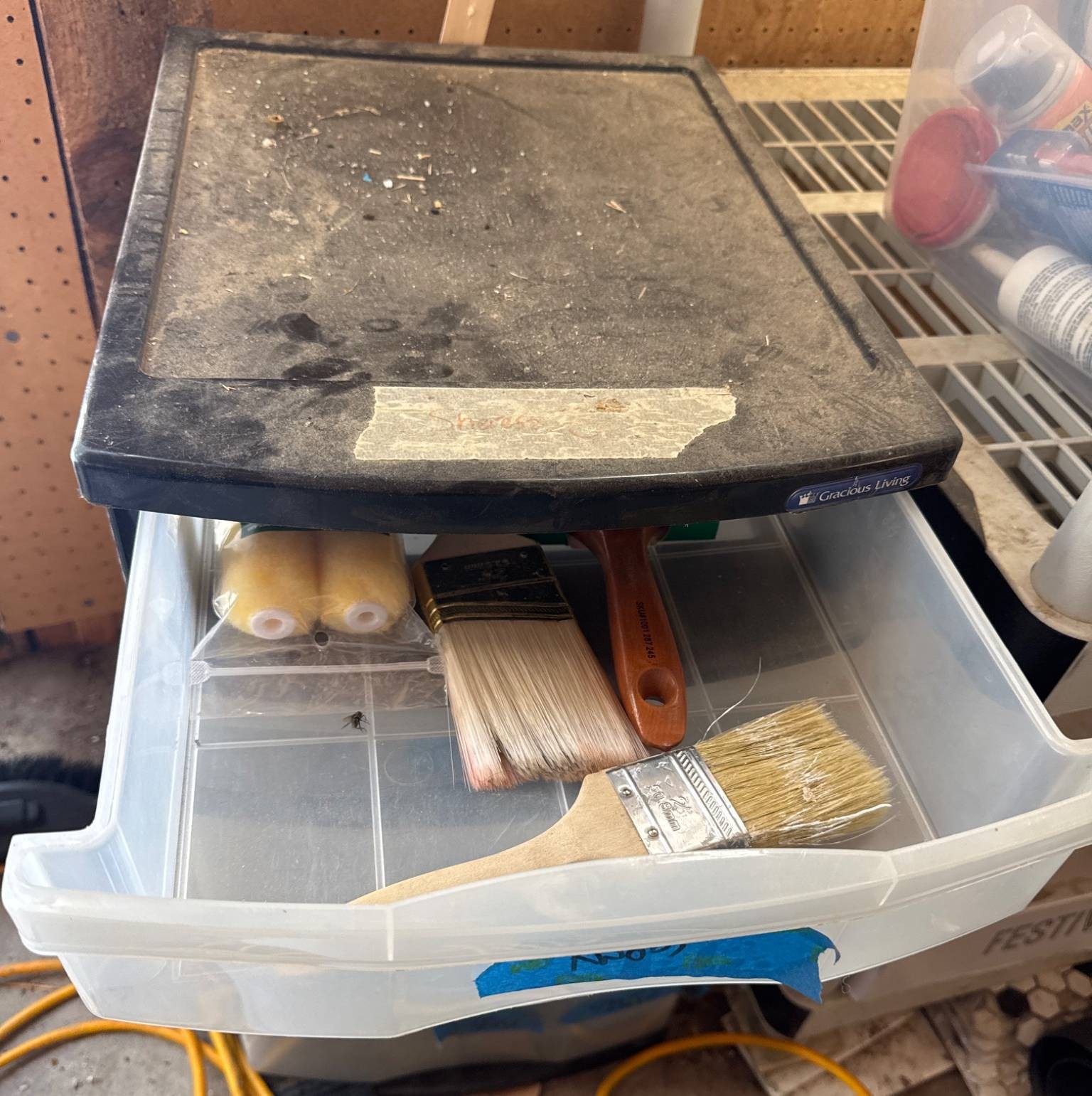Four-drawer plastic storage unit in black with translucent drawers labeled for organizing items such as knobs, cabinet hardware, and paint supplies. Each drawer contains assorted hardware and accessories, including cabinet knobs, rollers, and brushes. The top surface shows signs of wear and use. Dimensions: approximately 24 in H x 12 in W x 15 in D.