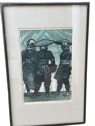 Woodblock print by Shiro Kasamatsu (1898–1991), signed and dated 1958 in pencil. The print depicts rural figures under umbrellas, rendered in a muted green and black palette. Encased in a black wood frame with a cream matte. Wear present on the backing paper. Frame measures approximately 22 inches in height.