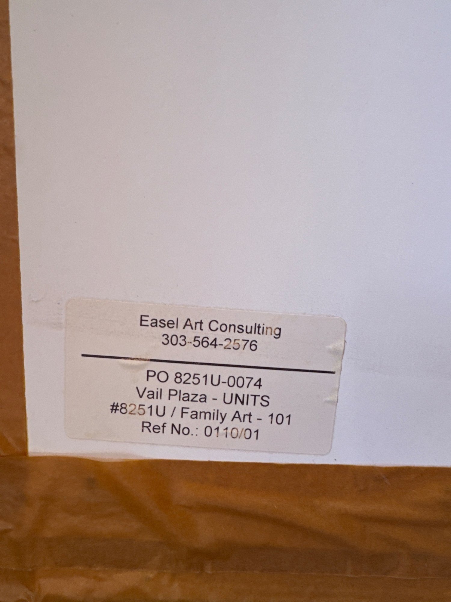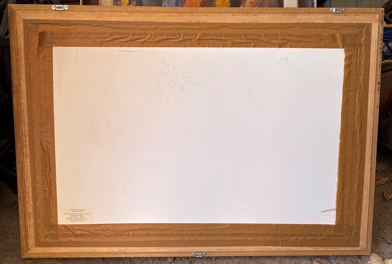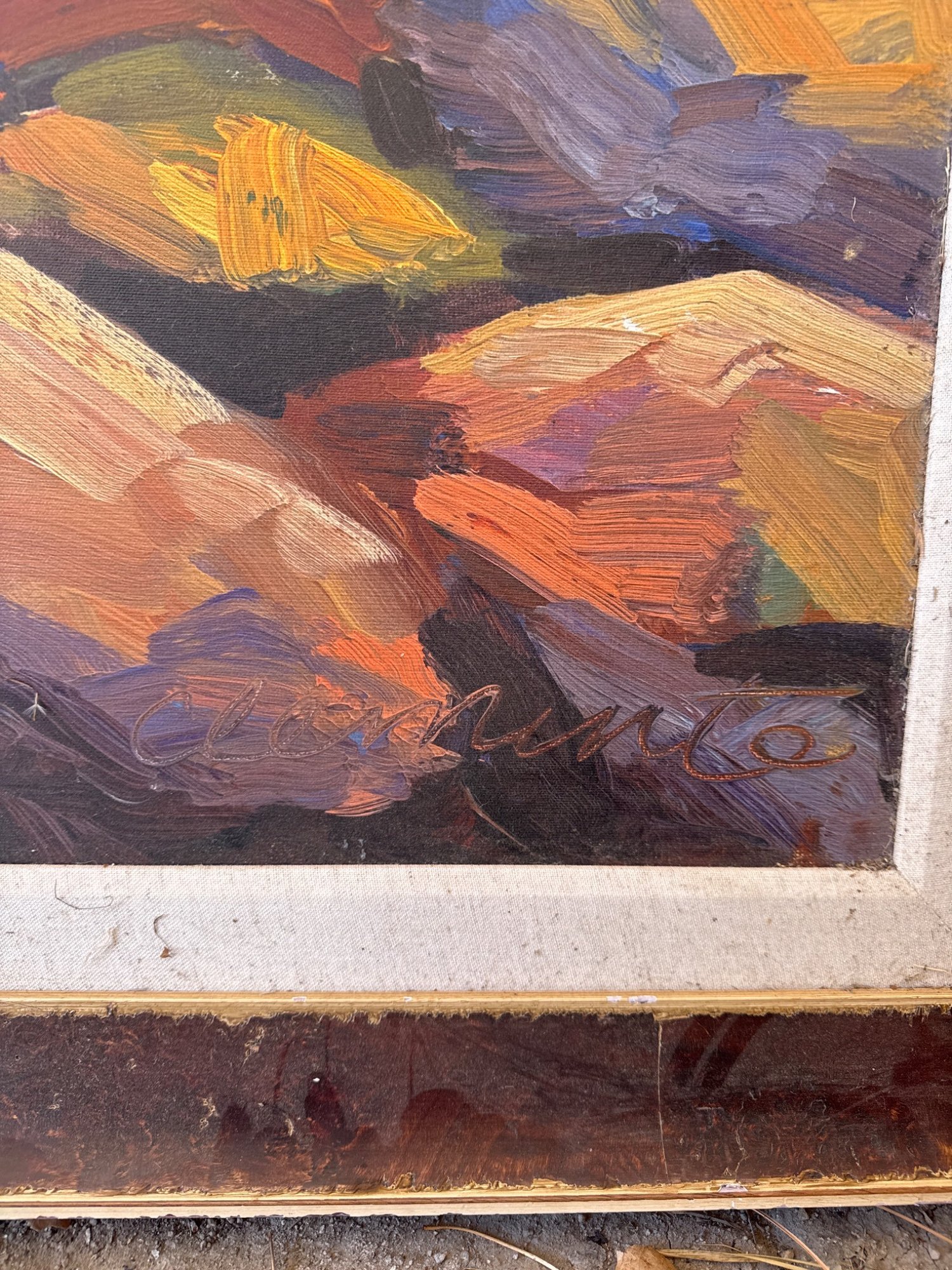 Abstract oil paintings in complementary color palettes, signed by the artist in the lower right corners. Both pieces feature bold brushwork with layered, vibrant colors. Frames include brown and gold-painted accents, showing wear consistent with age. Label on the back of one frame references Easel Art Consulting with project details. Dimensions: Approximately 30 x 24 inches each, including the frame.