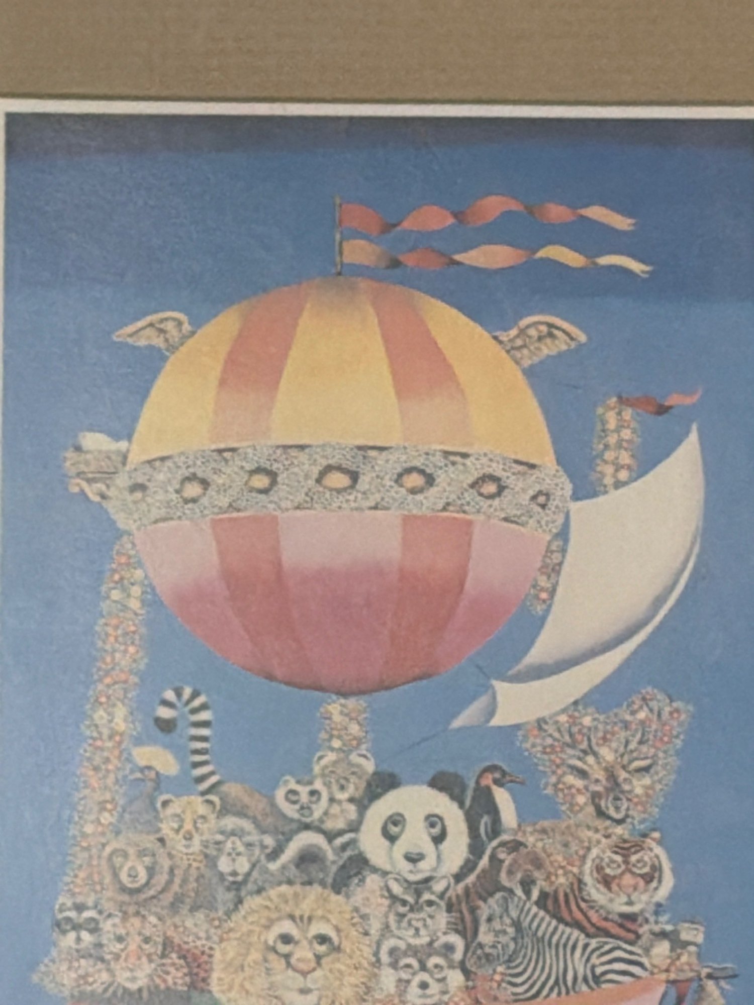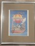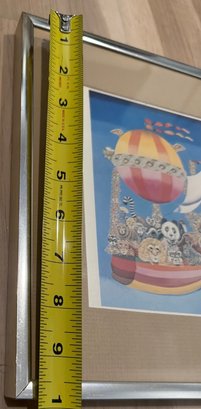 Framed illustration of a balloon-like vessel carrying various animals, including a panda, lion, zebra, and others, set against a blue background. Artwork is matted in beige and housed in a simple silver-tone metal frame. Dimensions of the frame measure approximately 12 inches high by 9 inches wide by 0.5 inches deep. Artist and exact date of creation unknown.