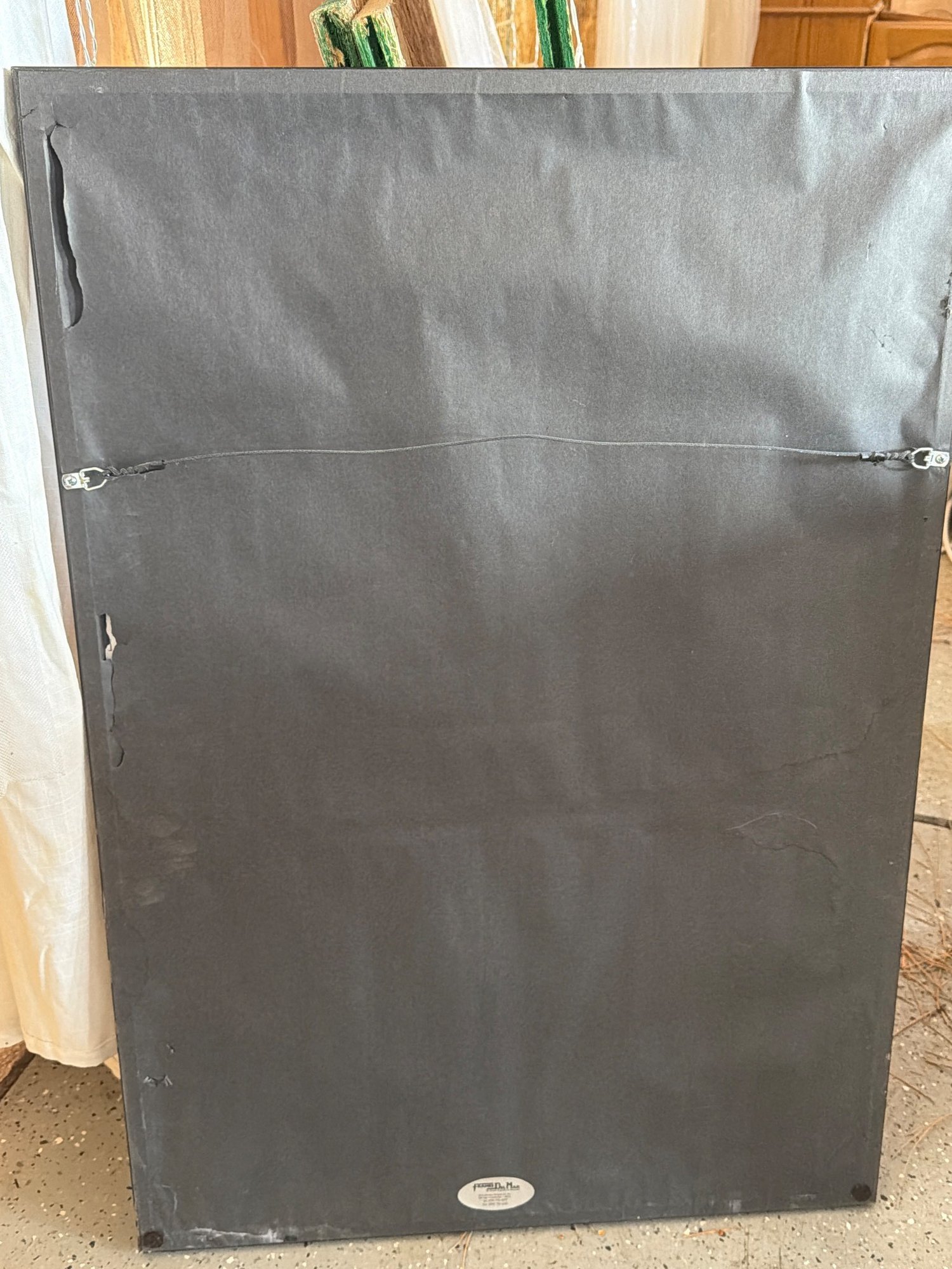 This framed artwork features a charcoal and pastel drawing depicting a seated figure viewed from behind, rendered with detailed shading and a study of light and shadow. The scene includes studio elements such as a light stand in the background, adding depth and context to the composition. The piece is professionally framed under glass in a black frame with protective paper backing and hanging hardware. Dimensions: 37 inches (height) x 25 inches (width).