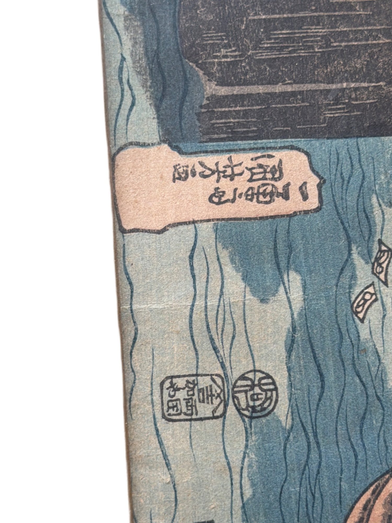 Japanese woodblock print attributed to Utagawa Hiroshige, depicting a scene of water, a bridge, and figures in traditional attire. Framed in a wooden bamboo-style frame with a paper backing and hanging wire. The visible dimensions of the artwork are approximately 8 inches by 14 inches. Signs of age and wear consistent with age are present on the backing and frame. Exact age of the print is unknown, likely a reprint from the 20th century.