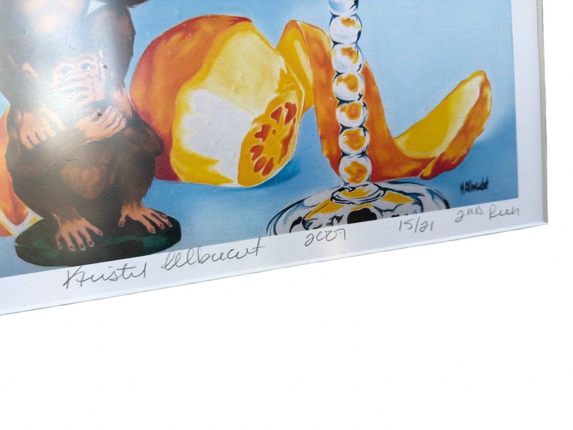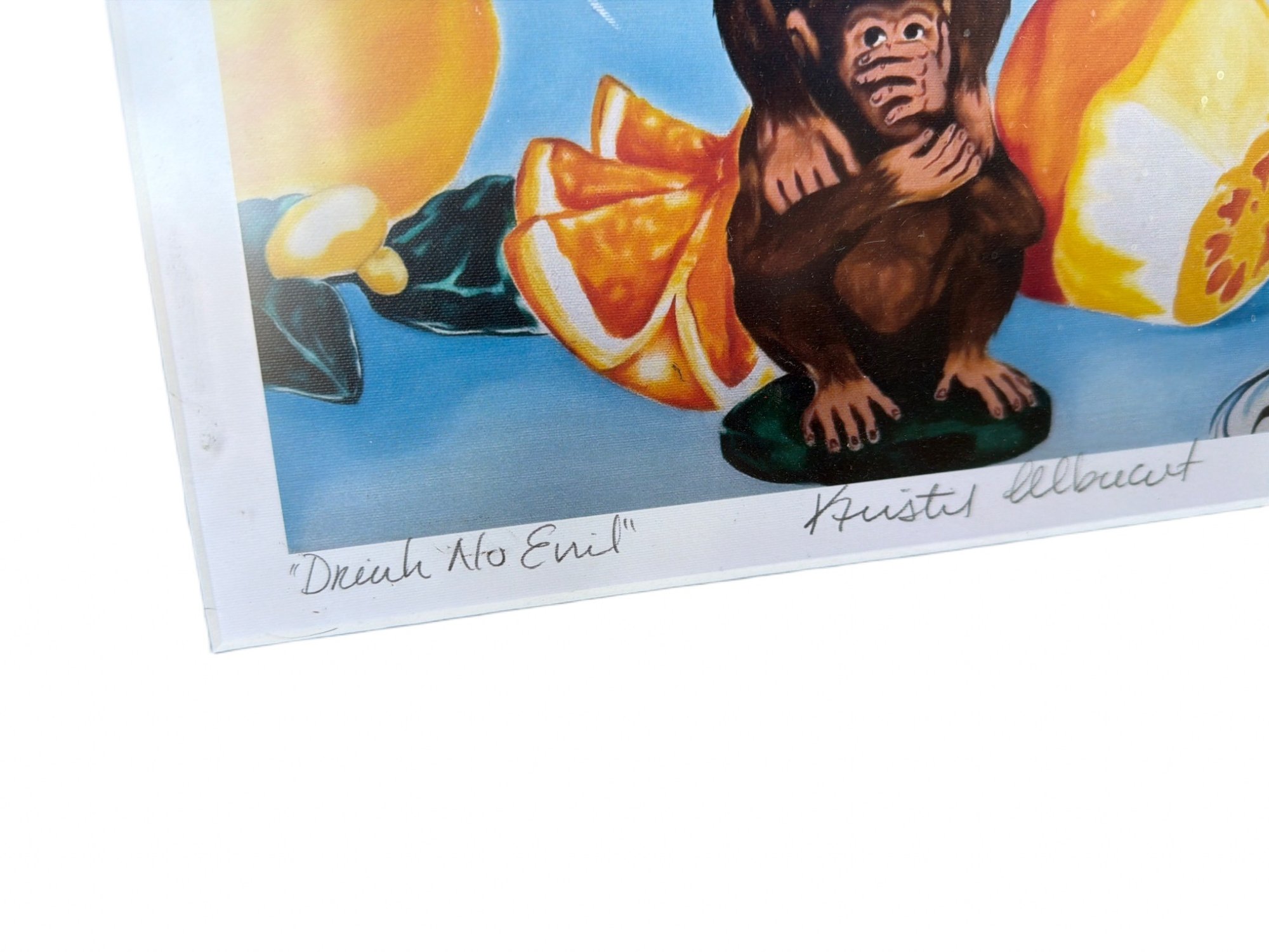 Limited edition print titled 'Drink No Evil' by Kristen Ellauert, numbered 15/21 and dated 2013. The artwork depicts a martini glass, orange slices, and a figurine of the 'see no evil' monkey. Matted with a red wooden frame. Dimensions: approximately 16 inches in height including the frame.
