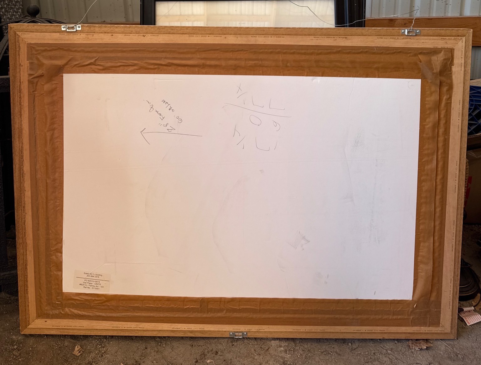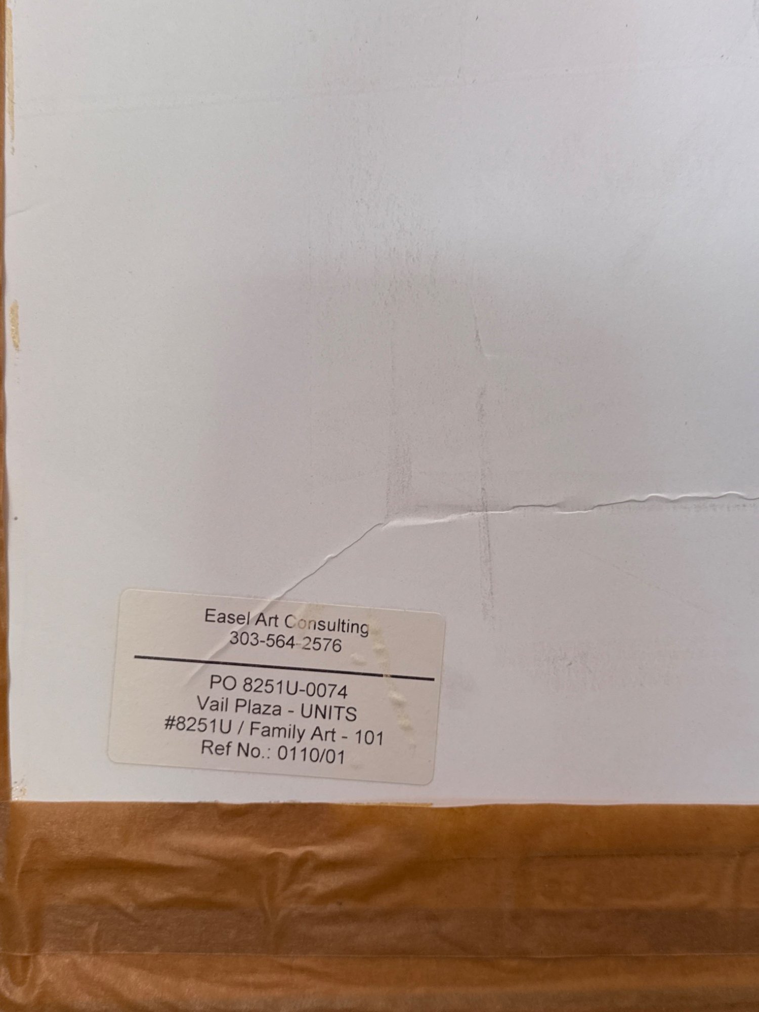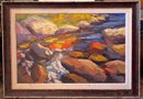 Framed oil painting on canvas depicting colorful river rocks and flowing water, painted in an impressionistic style. Signed in the lower right corner, Clemente. The frame is wood with linen matting. The back features markings and a label from Easel Art Consulting, specifying “Vail Plaza – UNTS” and reference number “0110/01.” The assembled dimensions are approximately 36 x 24 inches.