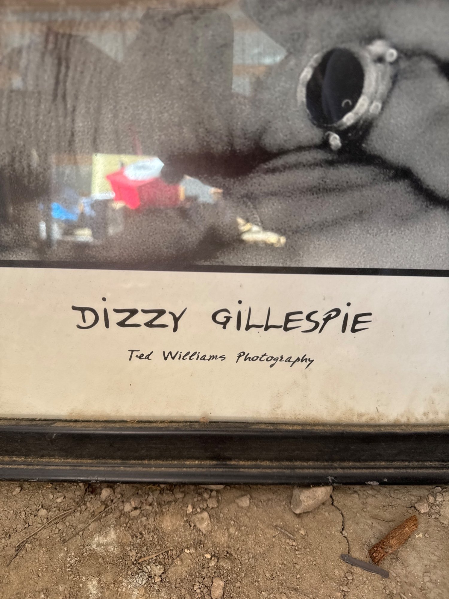 Black-and-white photograph of jazz musician Dizzy Gillespie by Ted Williams, titled below the image. Presented in a black wooden frame under glass with a paper backing. The artist’s name and work imprint are included beneath the photograph. Frame and backing exhibit minor wear consistent with age. Dimensions: approximately 36 x 24 inches including frame.