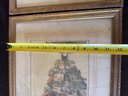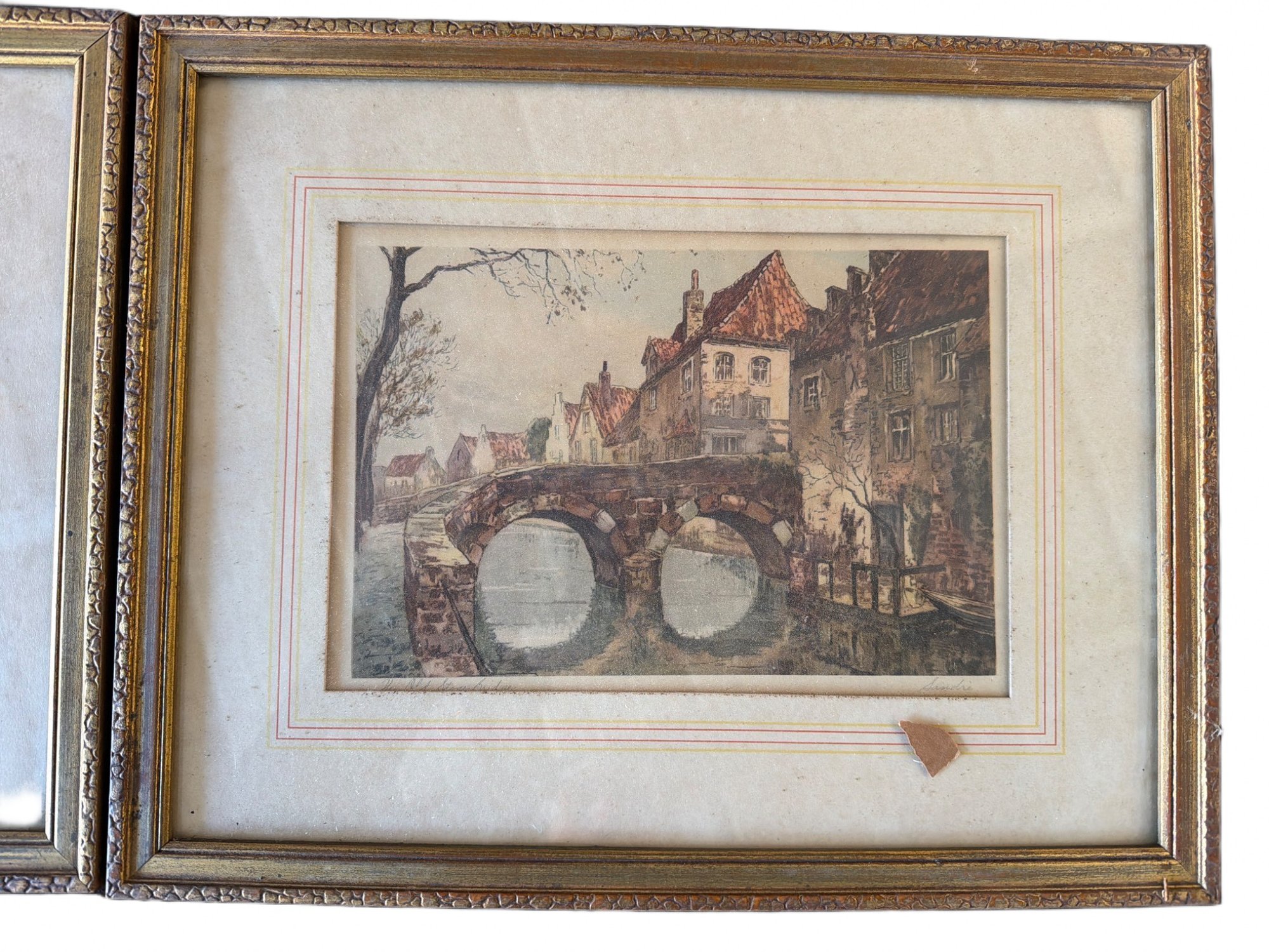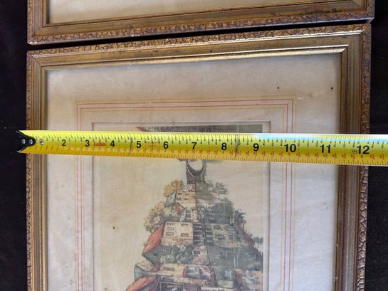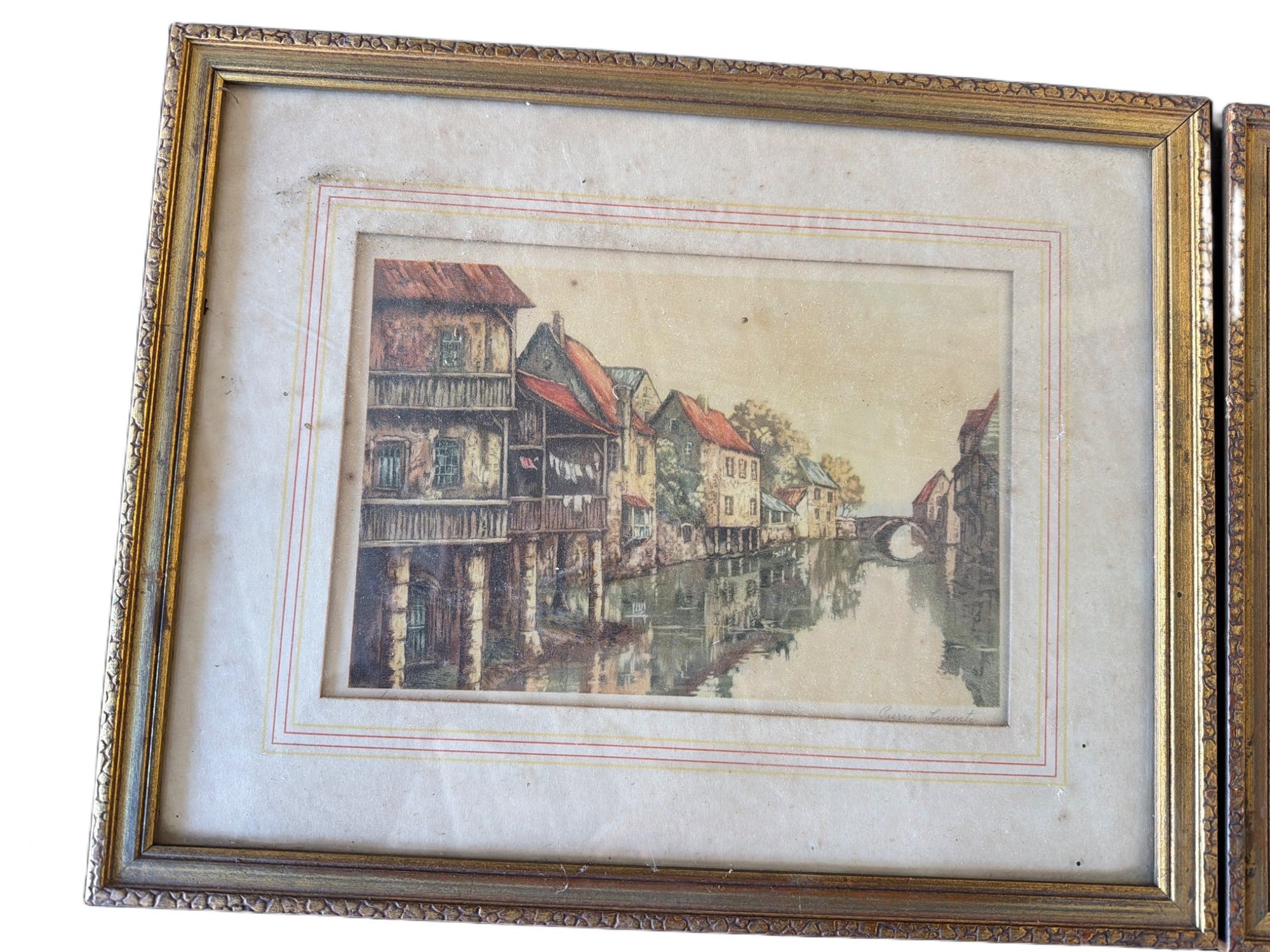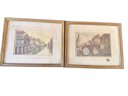 Two framed prints depicting European village scenes, housed in gilded wooden frames with decorative molding. Both prints feature detailed depictions of waterways and architecture. Frames show signs of age-related wear, and backing paper is torn. Dimensions: approximately 10 inches by 8 inches each.