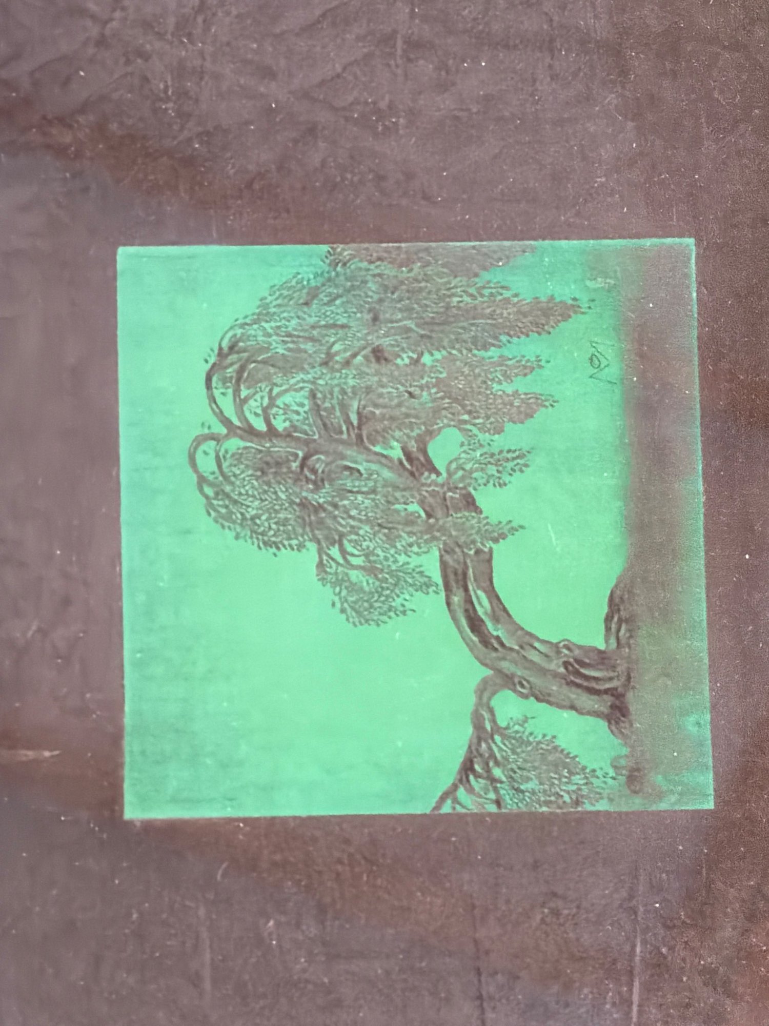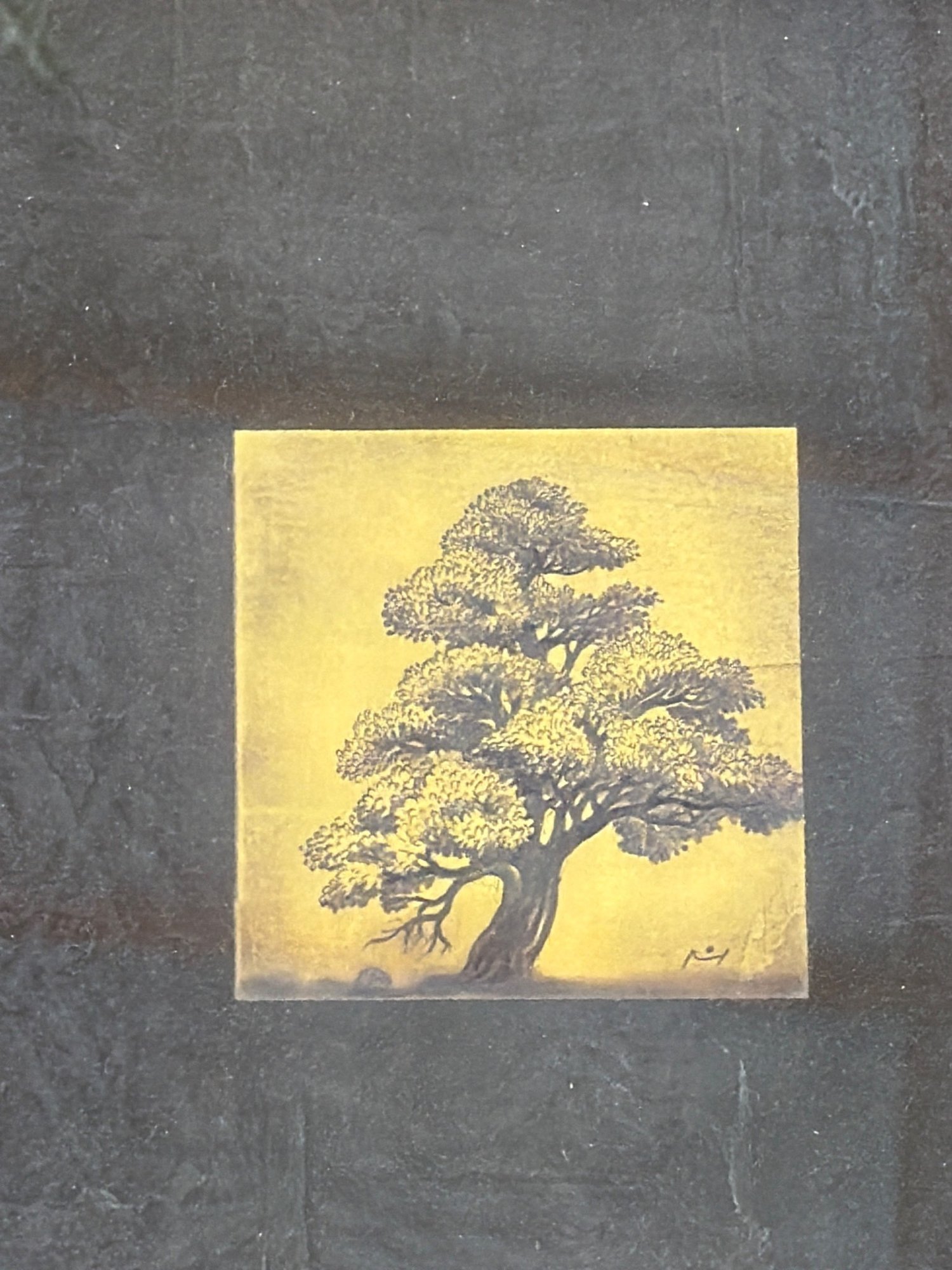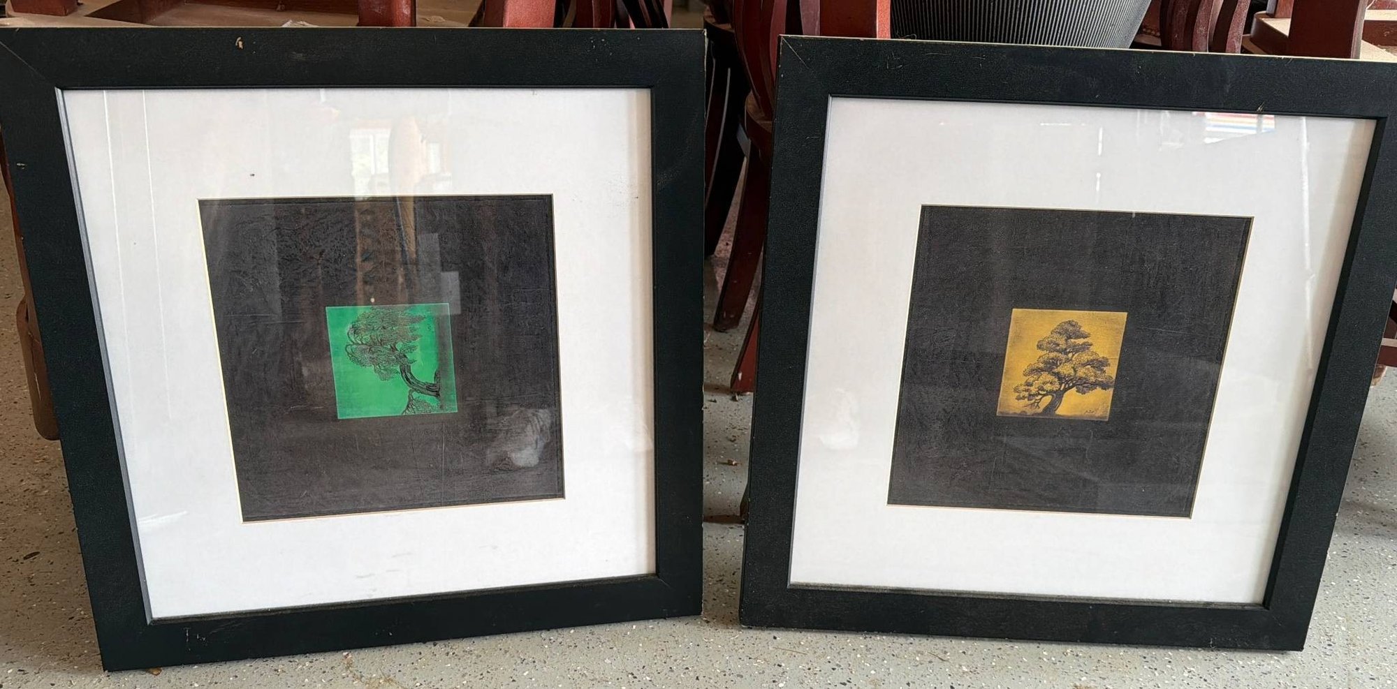 This lot features a pair of framed art prints depicting trees rendered on distinct square backgrounds, one in green and the other in yellow. The images highlight natural forms with intricate detailing, housed in black frames under glass for preservation. Both pieces are unsigned but display consistent style and technique, suggesting they may be from the same artist. Each frame measures approximately 12 x 12 inches.