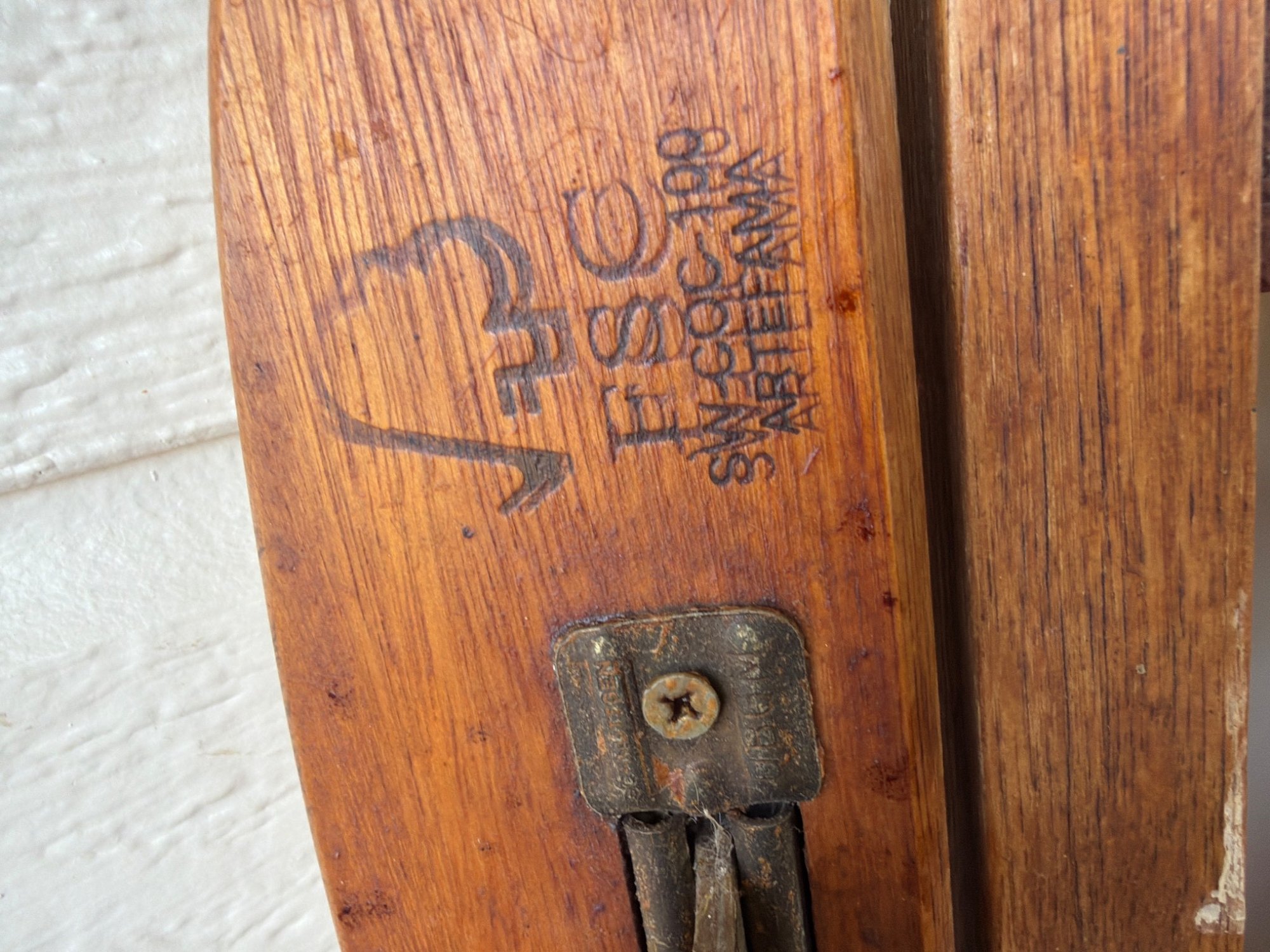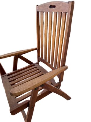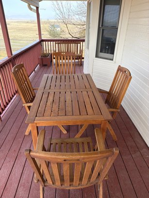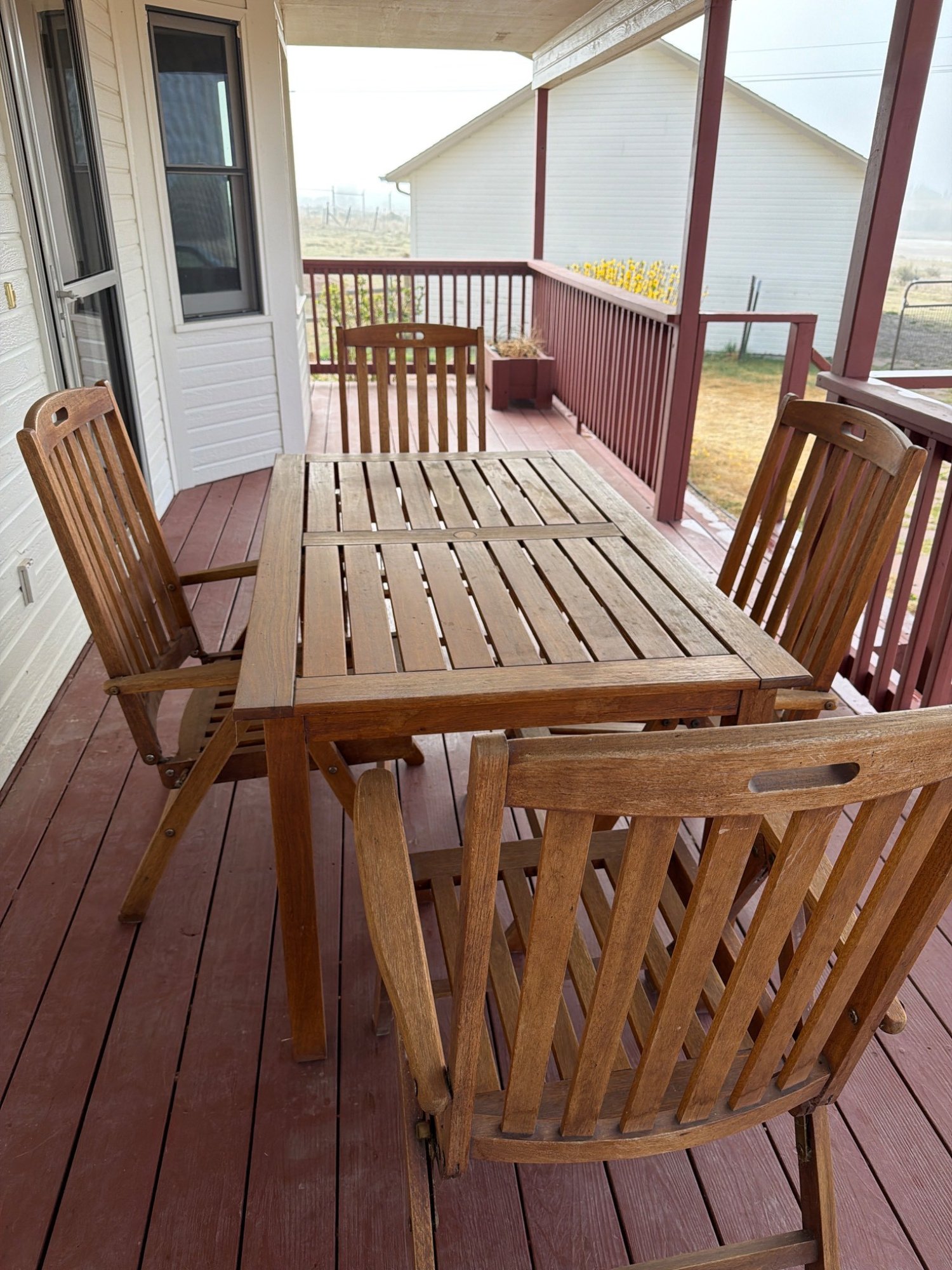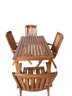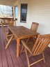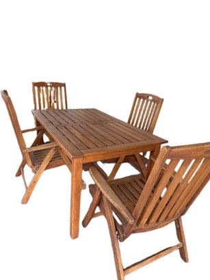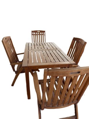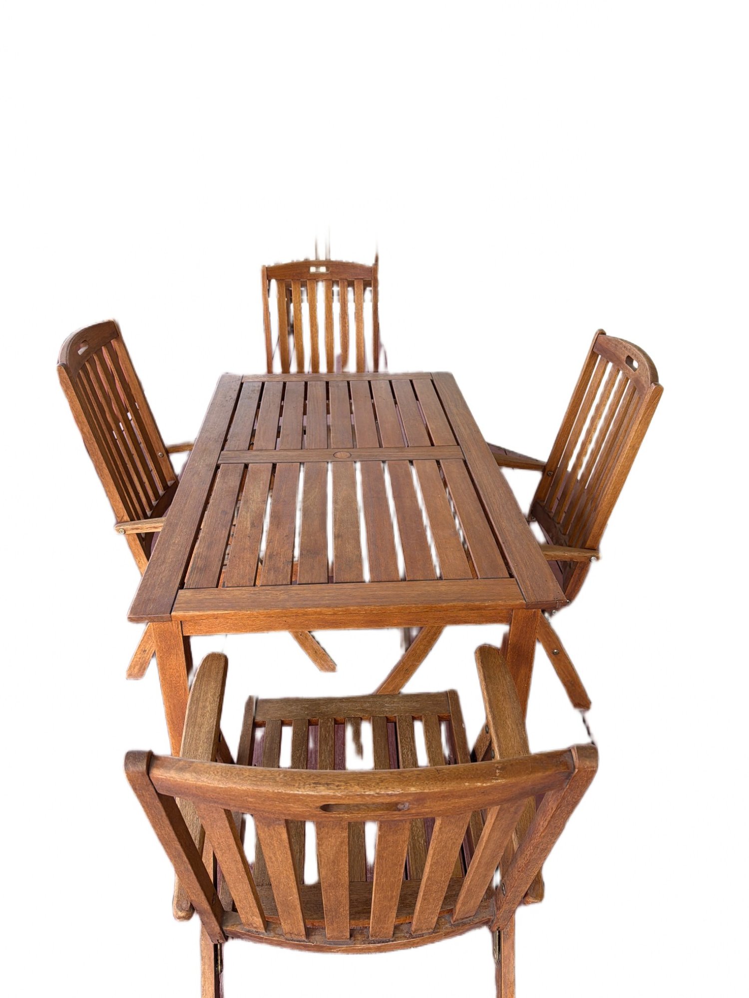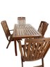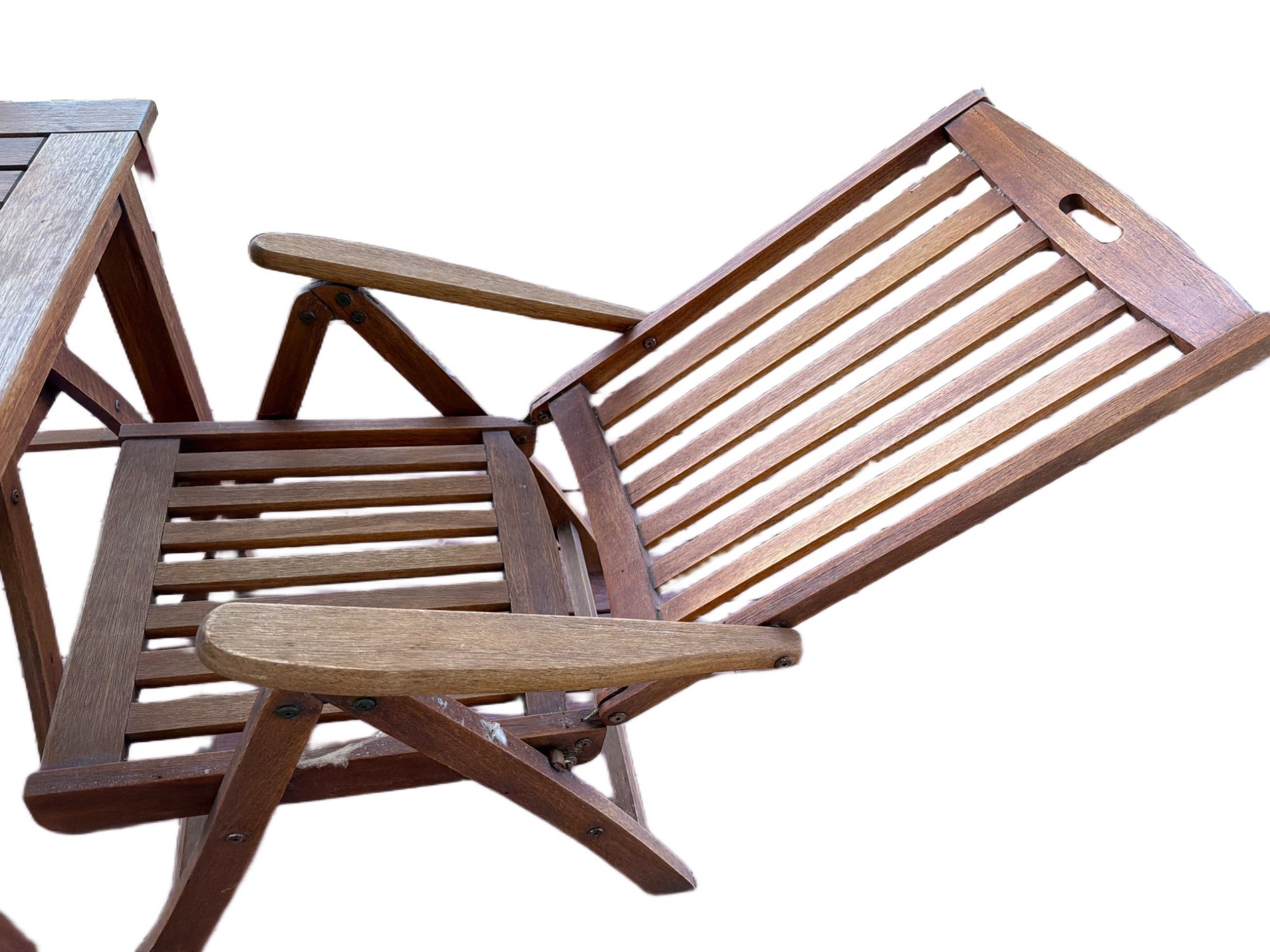 Outdoor wooden dining set certified by FSC. Includes one rectangular table (approx. 56x32 inches and 29 inches high) and four chairs with adjustable reclining backs. Constructed for outdoor use, as evident by weathered, durable wooden slats. Marked "FSC SW-COC-100 WATERVAN." Appears to be in used condition with visible wear. Dimensions measured in images are approximate.