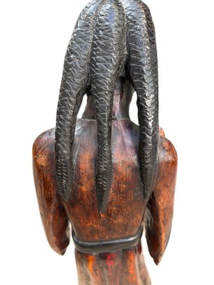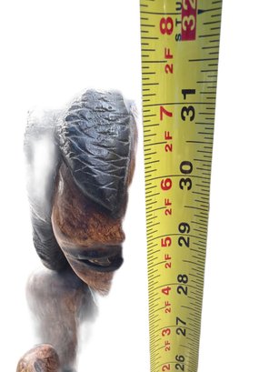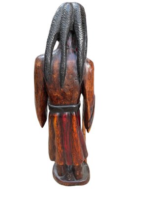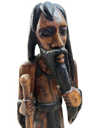 Wooden hand-carved figurine depicting a bearded elder with long braided hair, holding a staff and gesturing with one hand. The piece displays intricate carving details and a natural wood texture with visible grain patterns. The back of the figure features a detailed braided hair design. The sculpture measures approximately 30 inches in height.