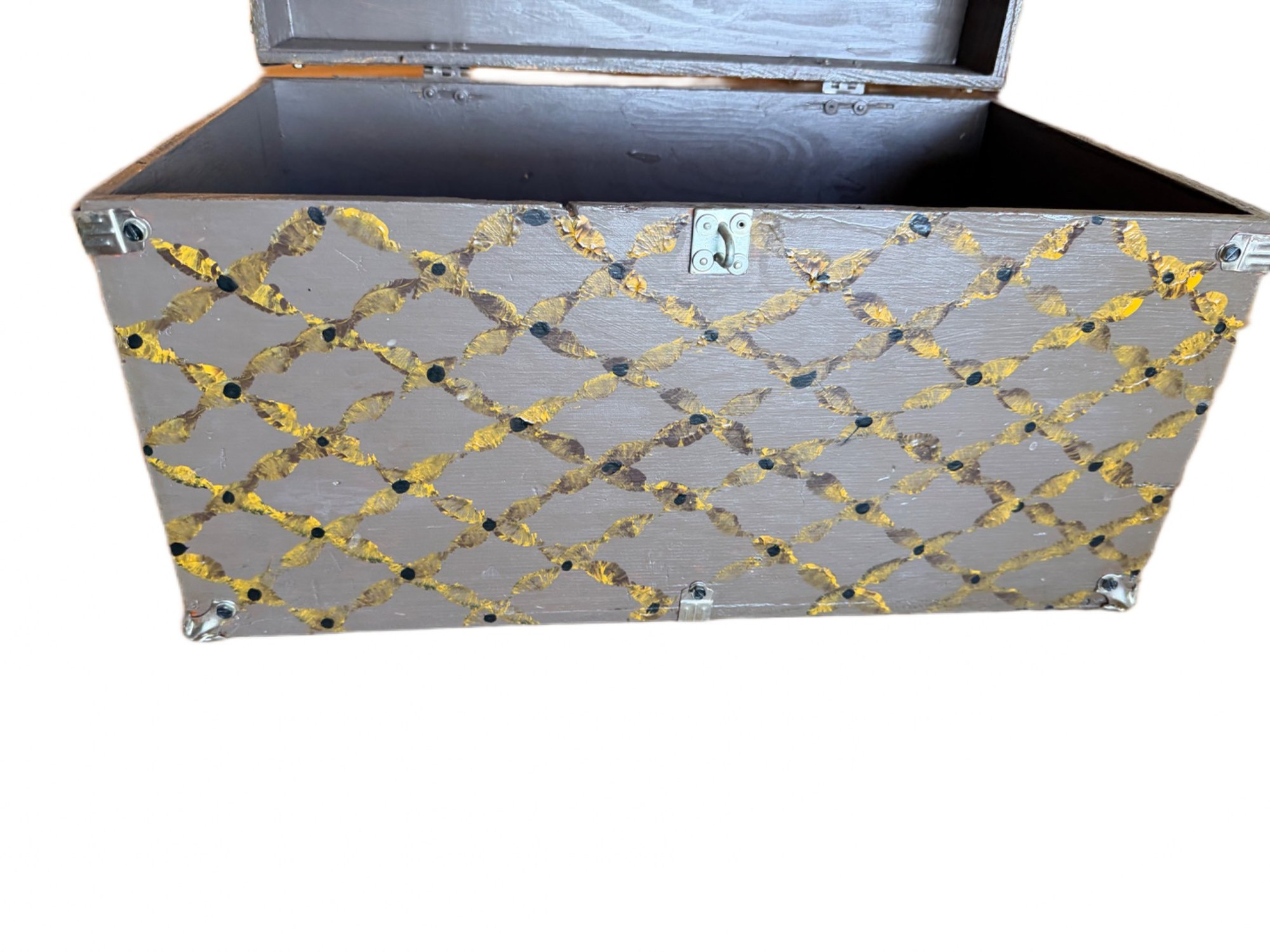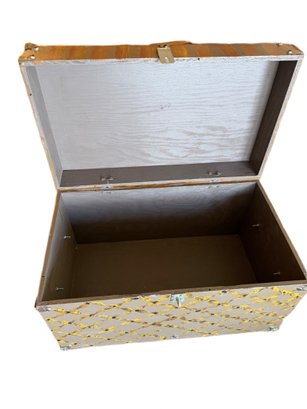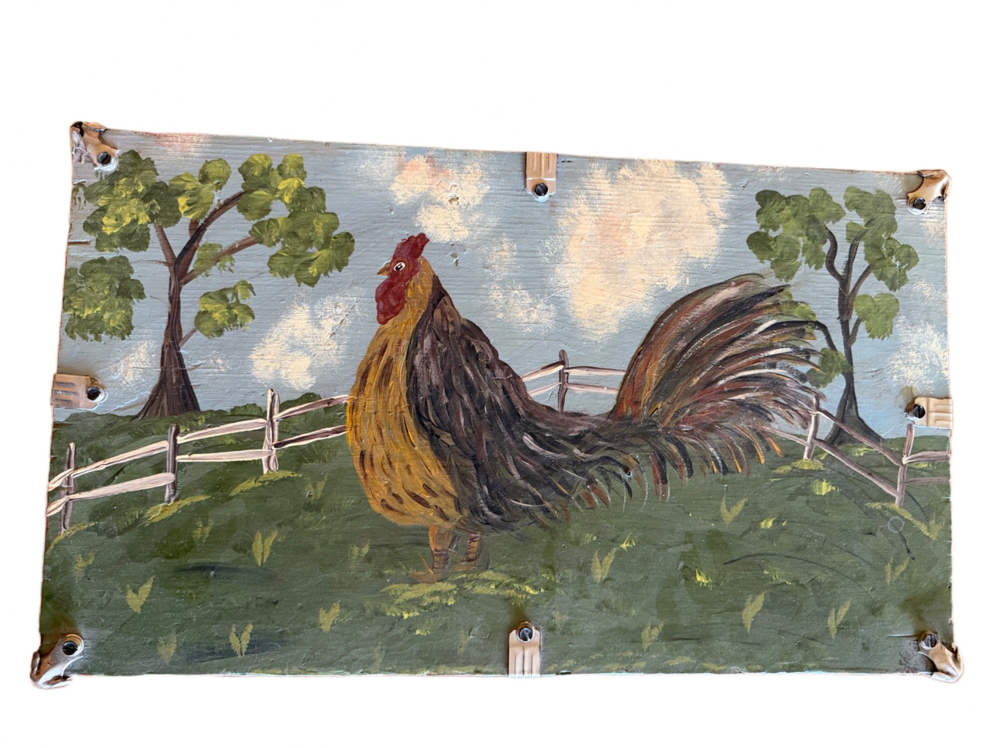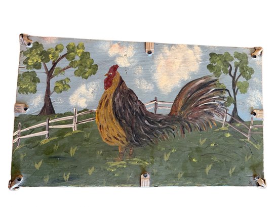 This storage chest features a hand-painted rooster motif on the lid and a gray base with gold and orange accents. Equipped with a hinged lid and metallic corner reinforcements, it measures approximately 20 x 12 inches. The interior is plain and unlined. Maker or artist is unidentified; visible markings seem illegible.