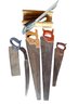 This lot comprises a collection of five hand saws in various designs and sizes. Handles are made of both wood and metal. They appear to have been used, with some showing signs of wear and rust. One saw includes a miter box, which seems intact. Model numbers and exact manufacturing details are not visible.