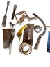 Tools and components including wrenches, chisels, a yellow handle bracket, a weight on a cord, and other hardware elements. The items show evident signs of wear and oxidation, suitable for repair, restoration, or reuse. Exact item specifications, manufacturer details, and year of production unknown.