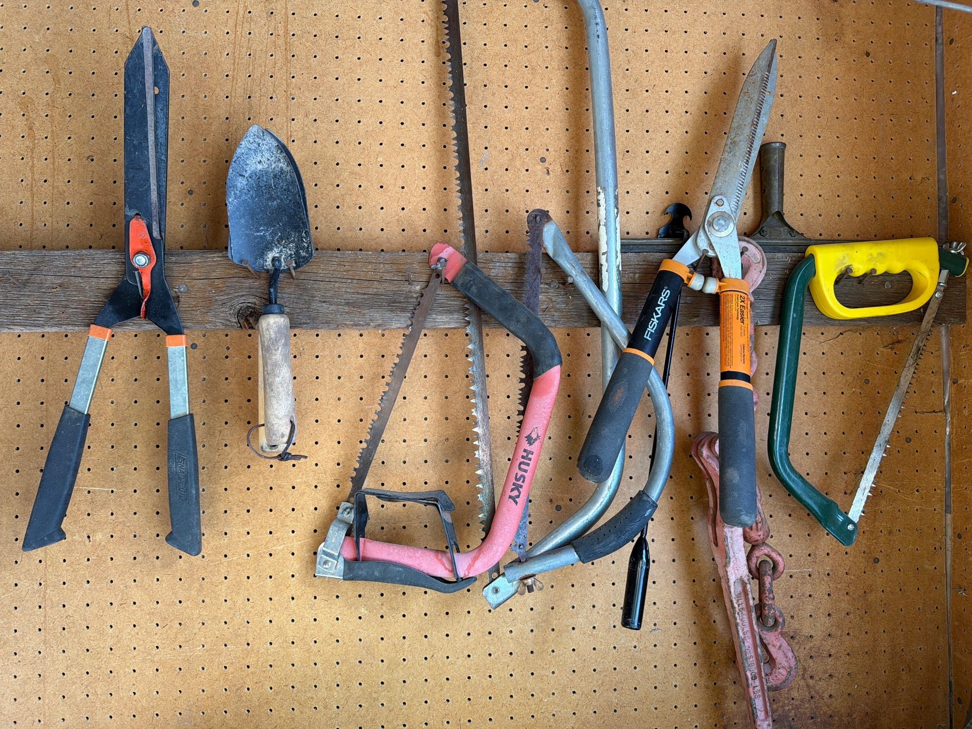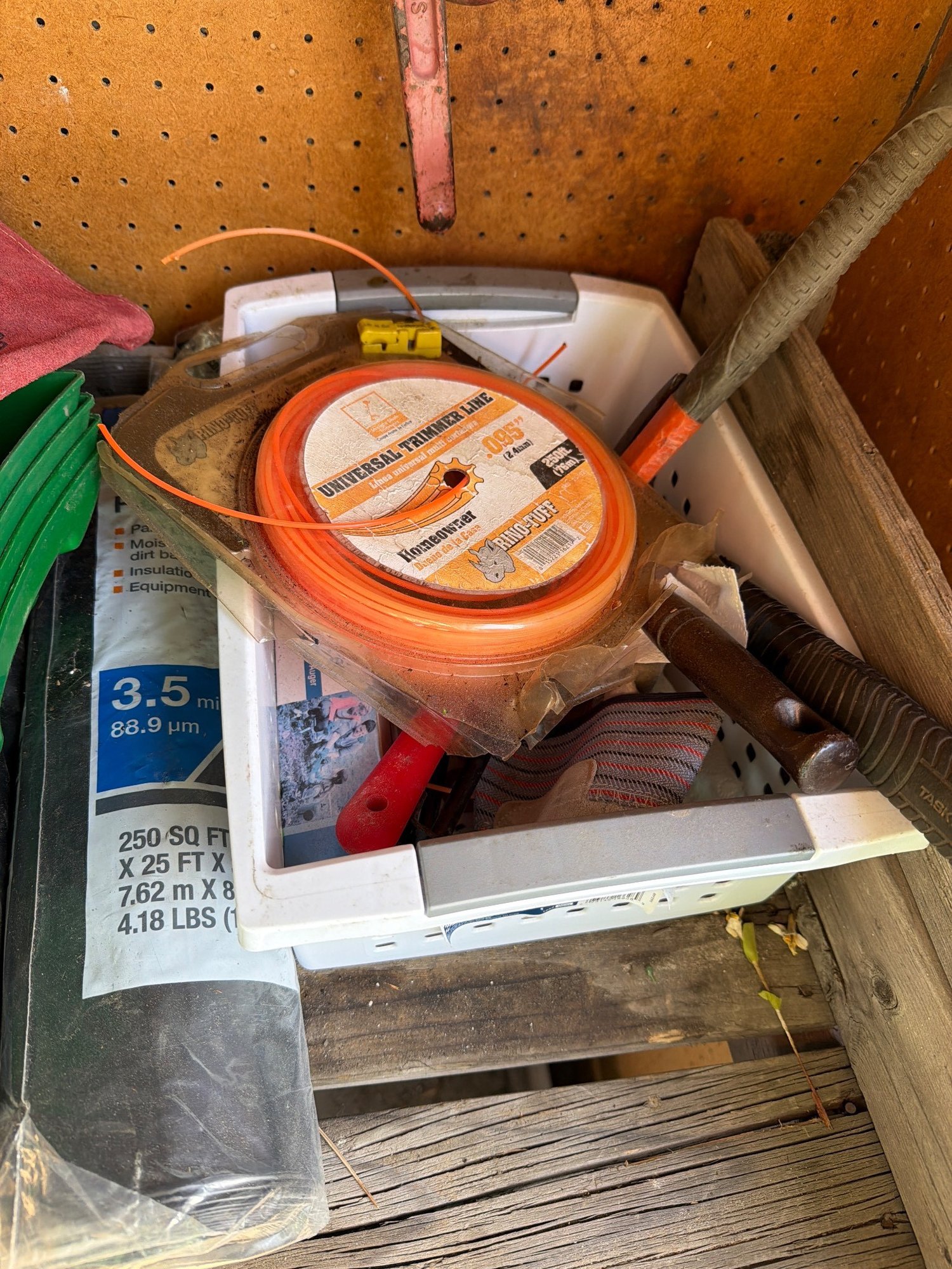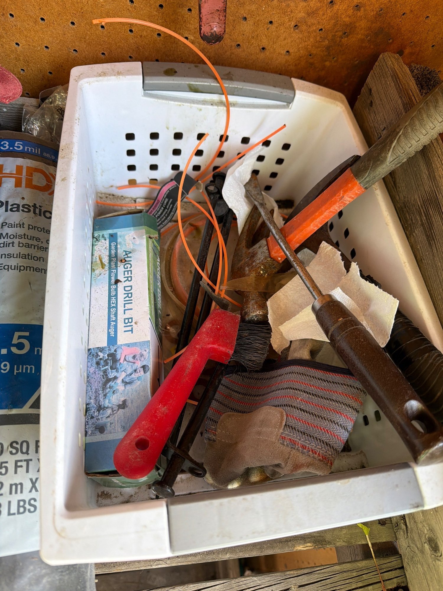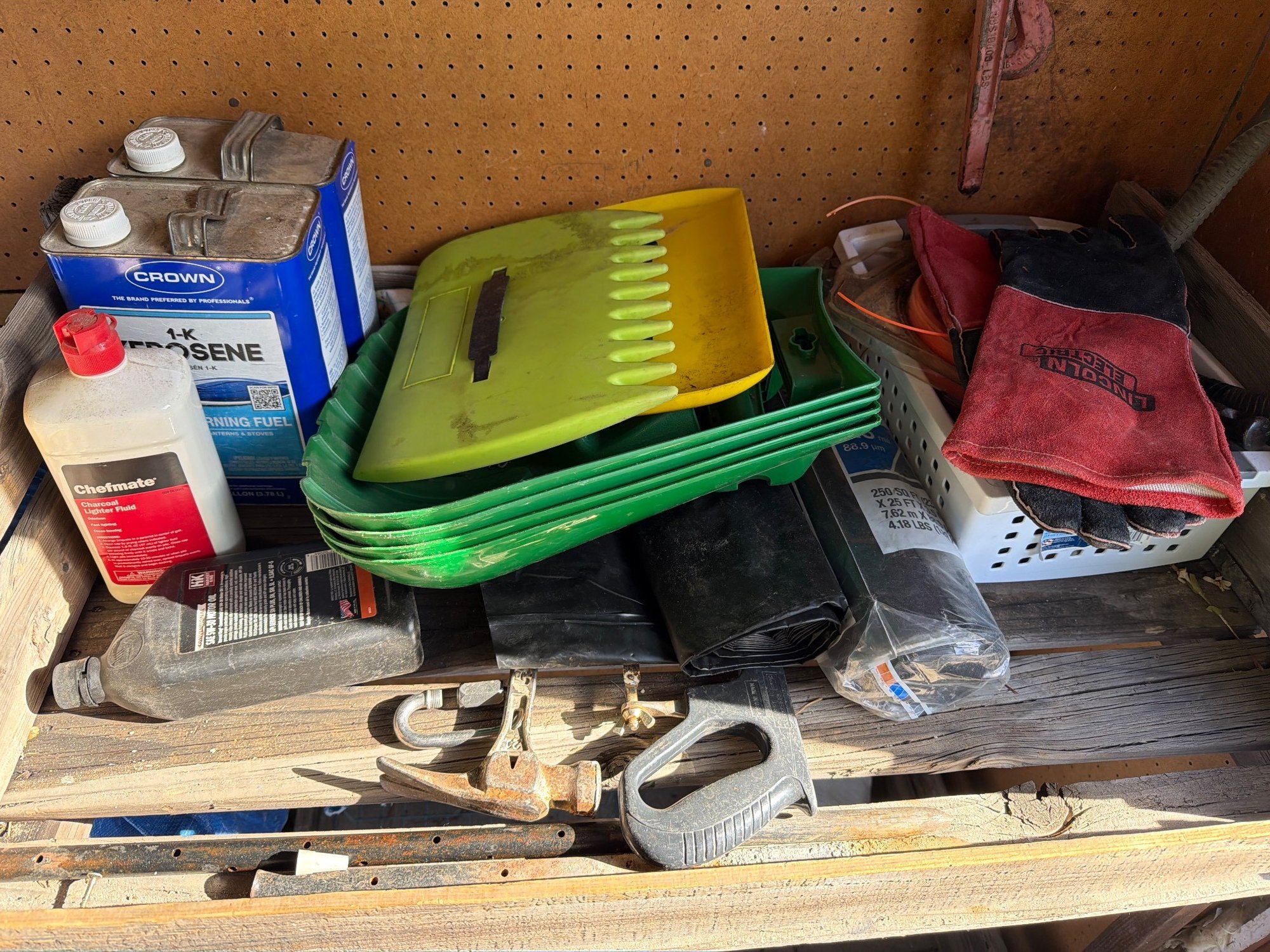 Workshop hand tools including pruners, shovels, hacksaws, and a hand saw mounted on a pegboard, along with various workshop supplies such as kerosene cans, spools of line, drill bits, and plastic tarps. Includes a wooden workbench with two levels for storage, measuring approximately 36″ H x 48″ W x 24″ D.