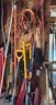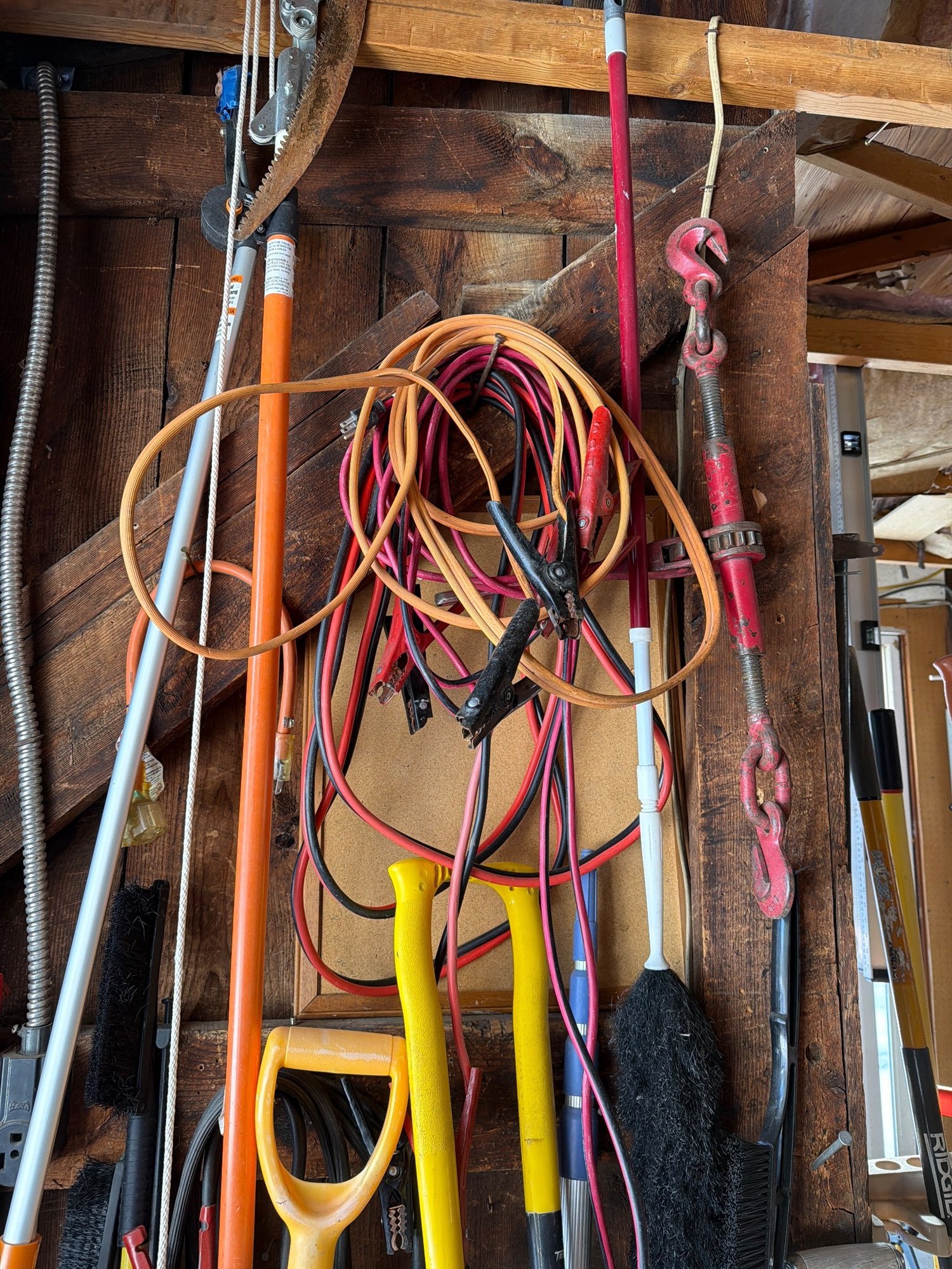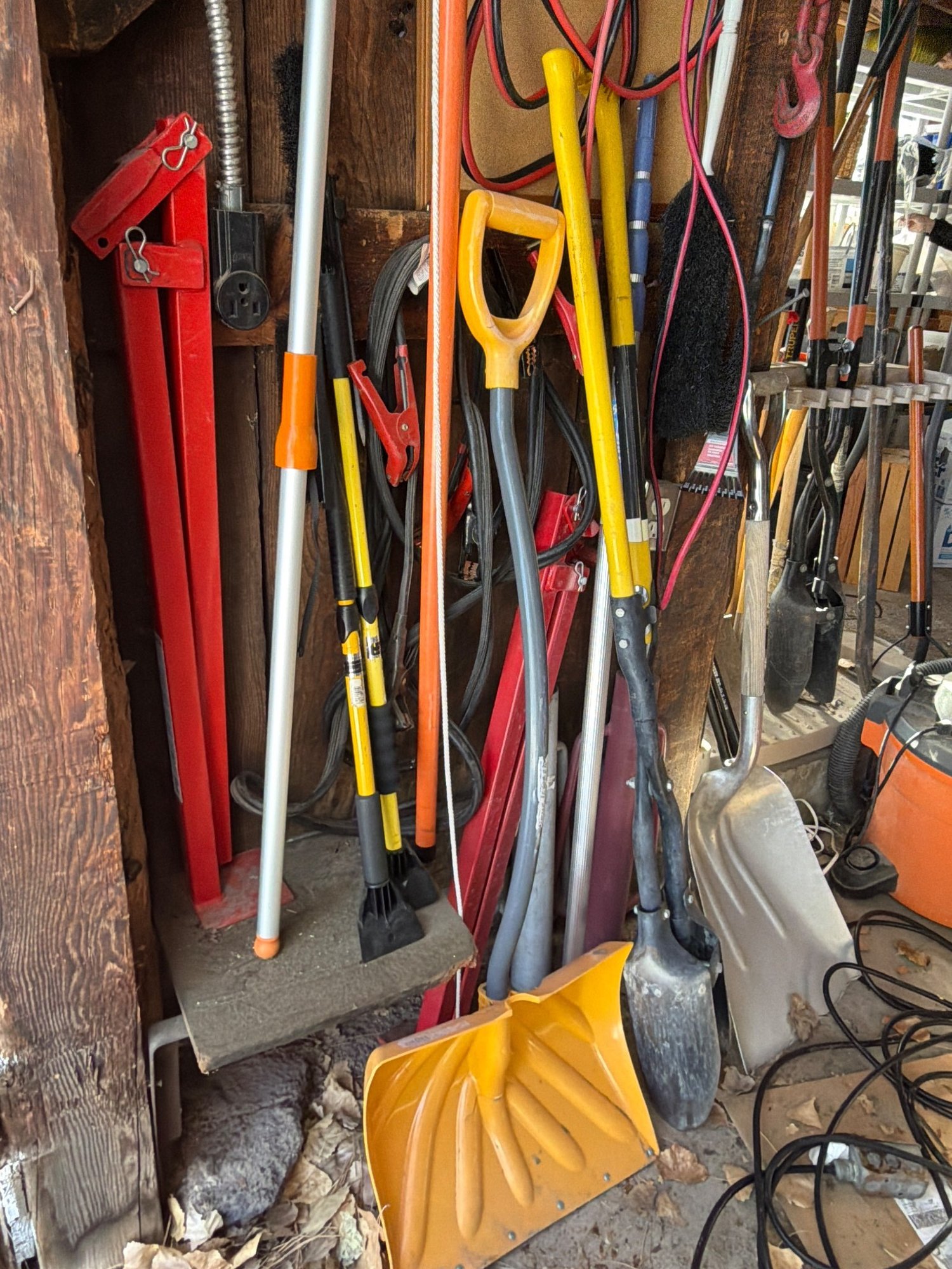 Group of hand tools including shovels, a snow shovel, a floor scraper, a long-handled brush, and a variety of extension cords. Additional items include clamps, chains, and hanging equipment. All tools are stored on a wooden wall organizer. Dimensions available upon request.