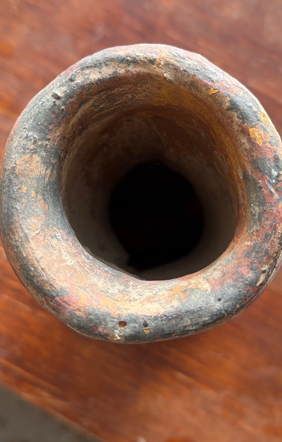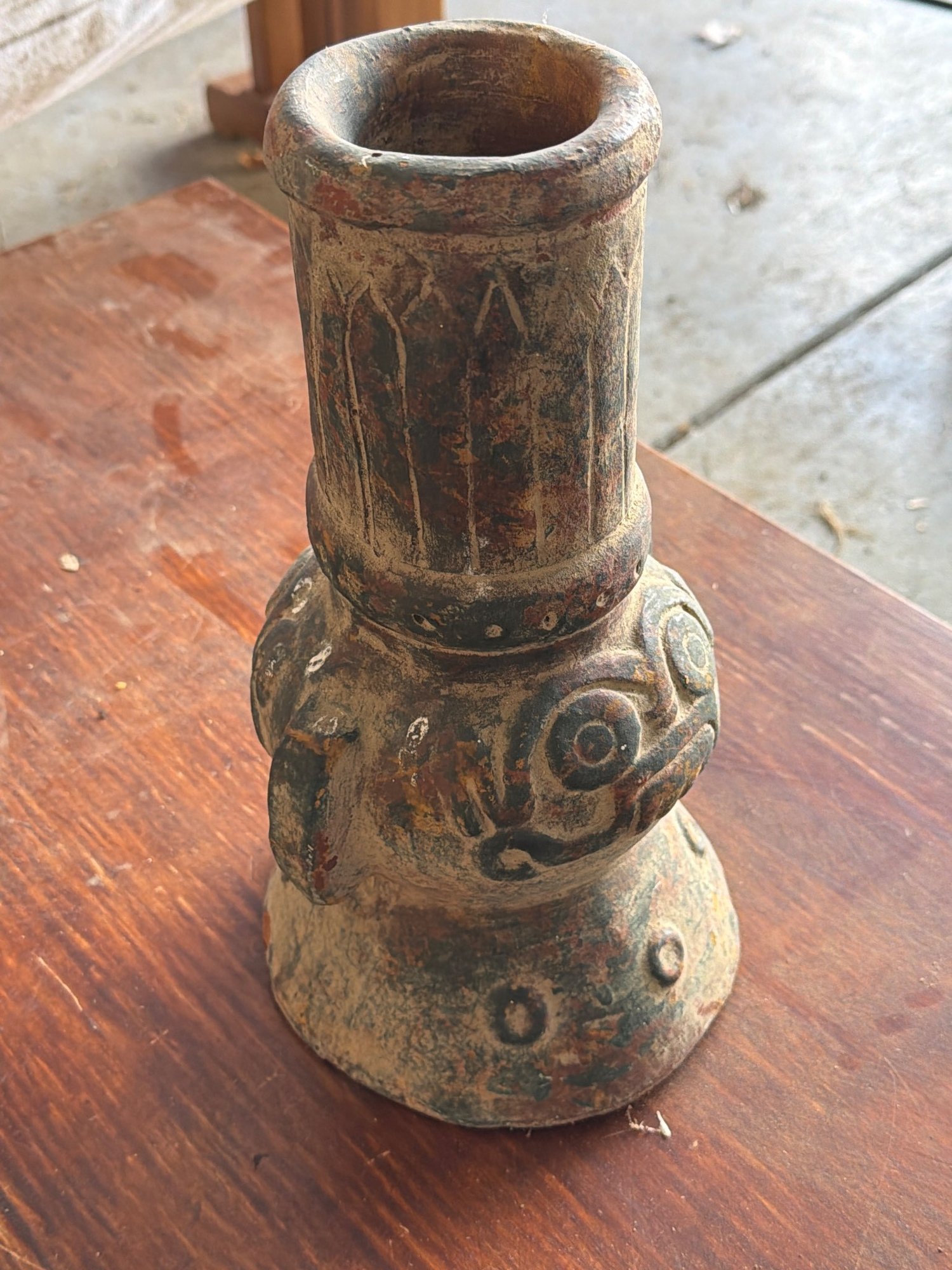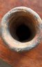 Handcrafted earthenware vessel featuring an anthropomorphic design with facial motifs and decorative incising on the upper cylindrical section. The piece exhibits a textured surface with remnants of earth tones and wear consistent with handling. The vessel measures approximately [include dimensions if provided].