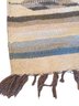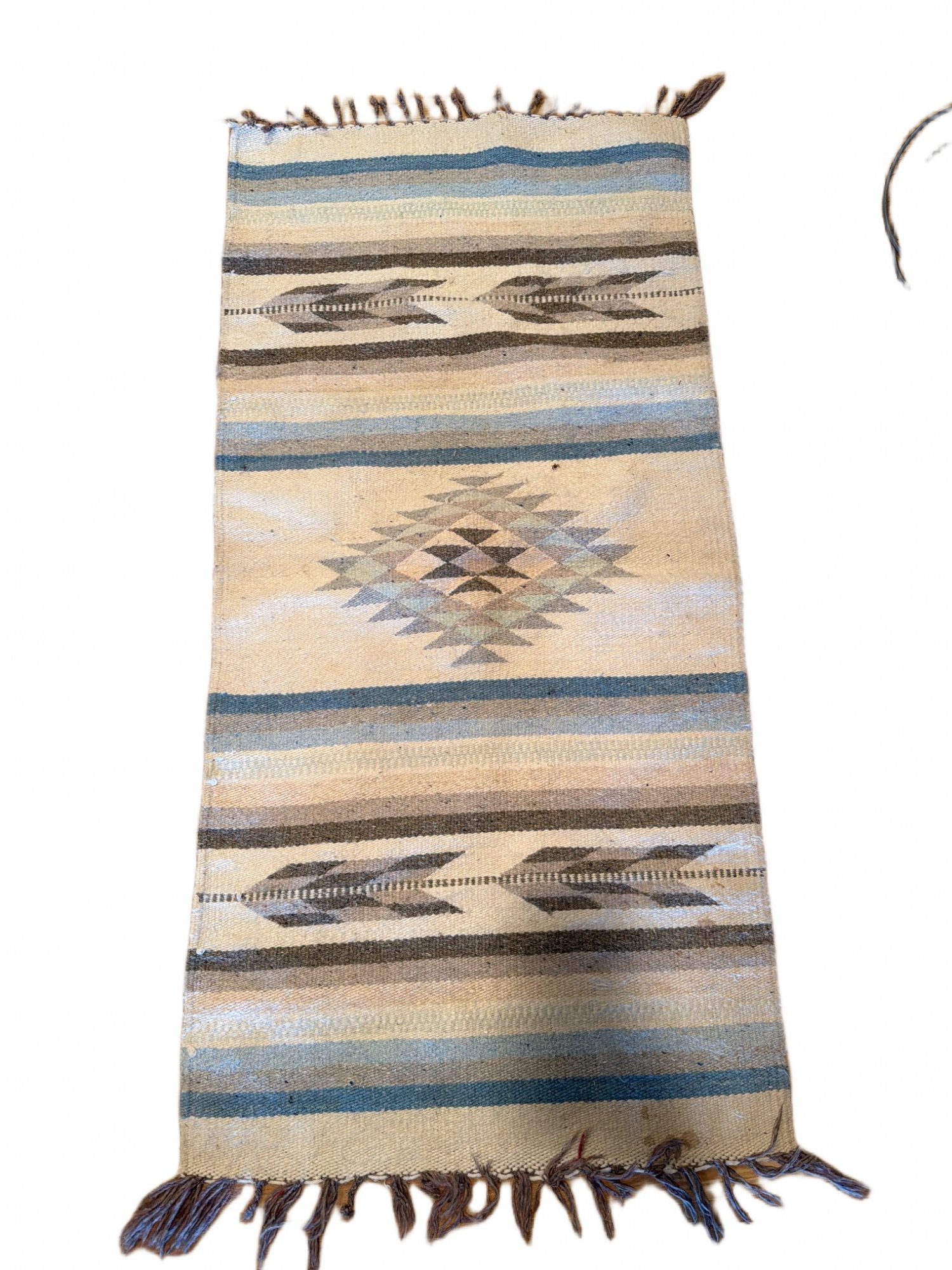 A handwoven rug featuring multicolor stripe detailing and a central geometric pattern. Measurements are approximately 29.5 inches in length and 13 inches in width. Constructed with woven fabric and featuring braided fringe edges. Condition shows light wear consistent with typical use.