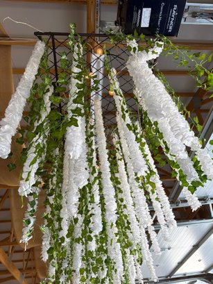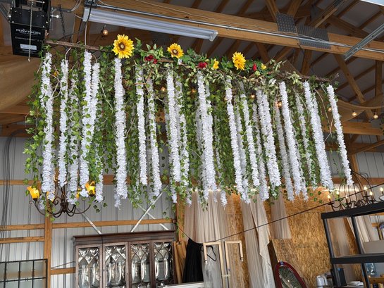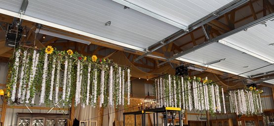 Hanging floral displays featuring cascading white garlands, green vine accents, and artificial sunflowers. Designed on a black grid-like structure to allow for easy hanging and mounting. Each display measures approximately 8 feet in length. Suitable for decorative purposes in event spaces or indoor settings.
