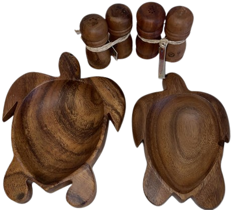 Hardwood Salt And Pepper Shakers (4) And (2) Wooden Turtle Platter