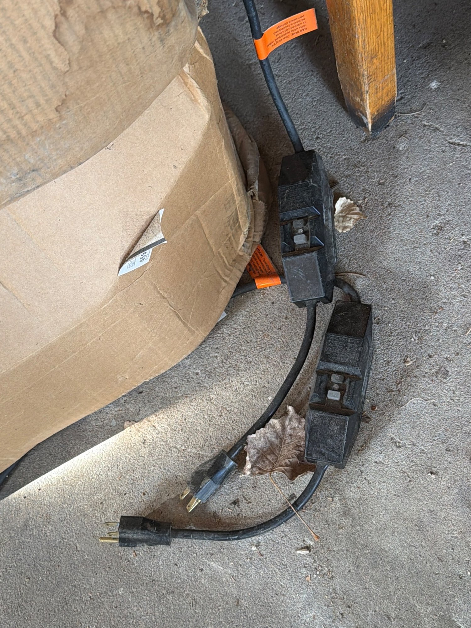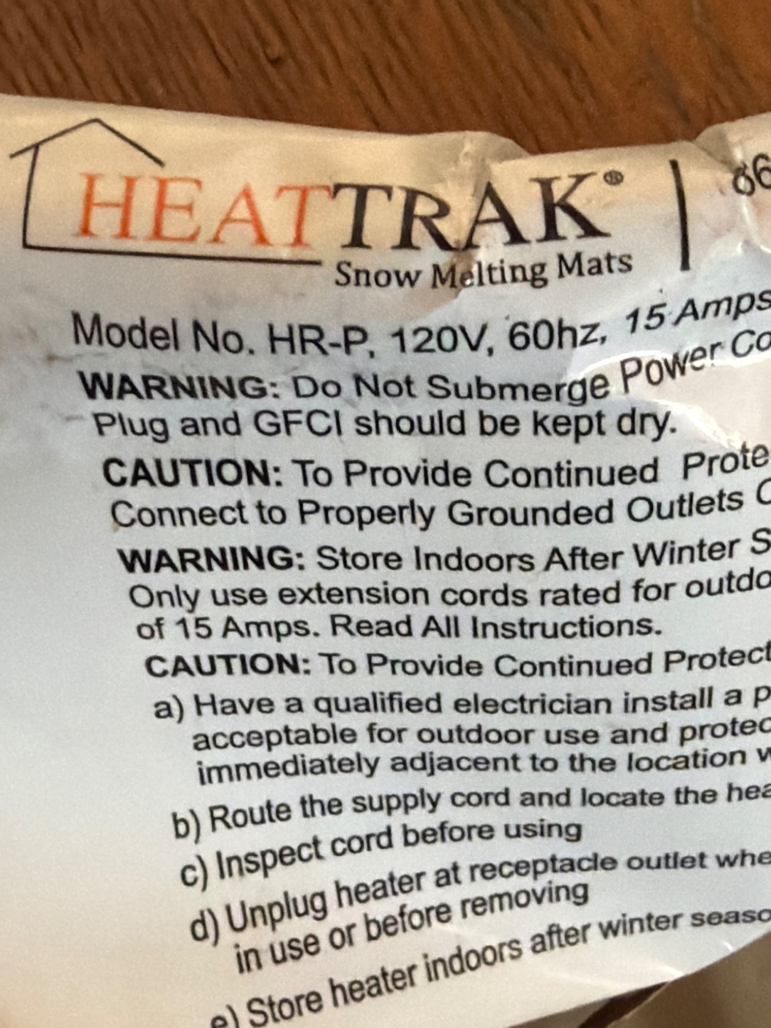 HeatTrak snow melting mats, model HR-P, designed for use on walkways, stairs, or other outdoor surfaces. Operates at 120V, 60Hz, and requires 15 amps. Includes attached power cords and GFCI connectors. Advisories are printed on the label, including indoor storage recommendations post-winter season. Box dimensions approximately 18 x 18 x 24 inches.