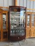 This finely crafted curved glass display cabinet by Hendredon features a mirrored backing and multiple glass shelves for showcasing items. The cabinet has a wooden frame with a curved design that allows for optimal viewing from every angle. A locking glass door with a key secures the displayed contents (contents not included). Dimensions: approximately 75 inches tall, 40 inches wide, and 16 inches deep.