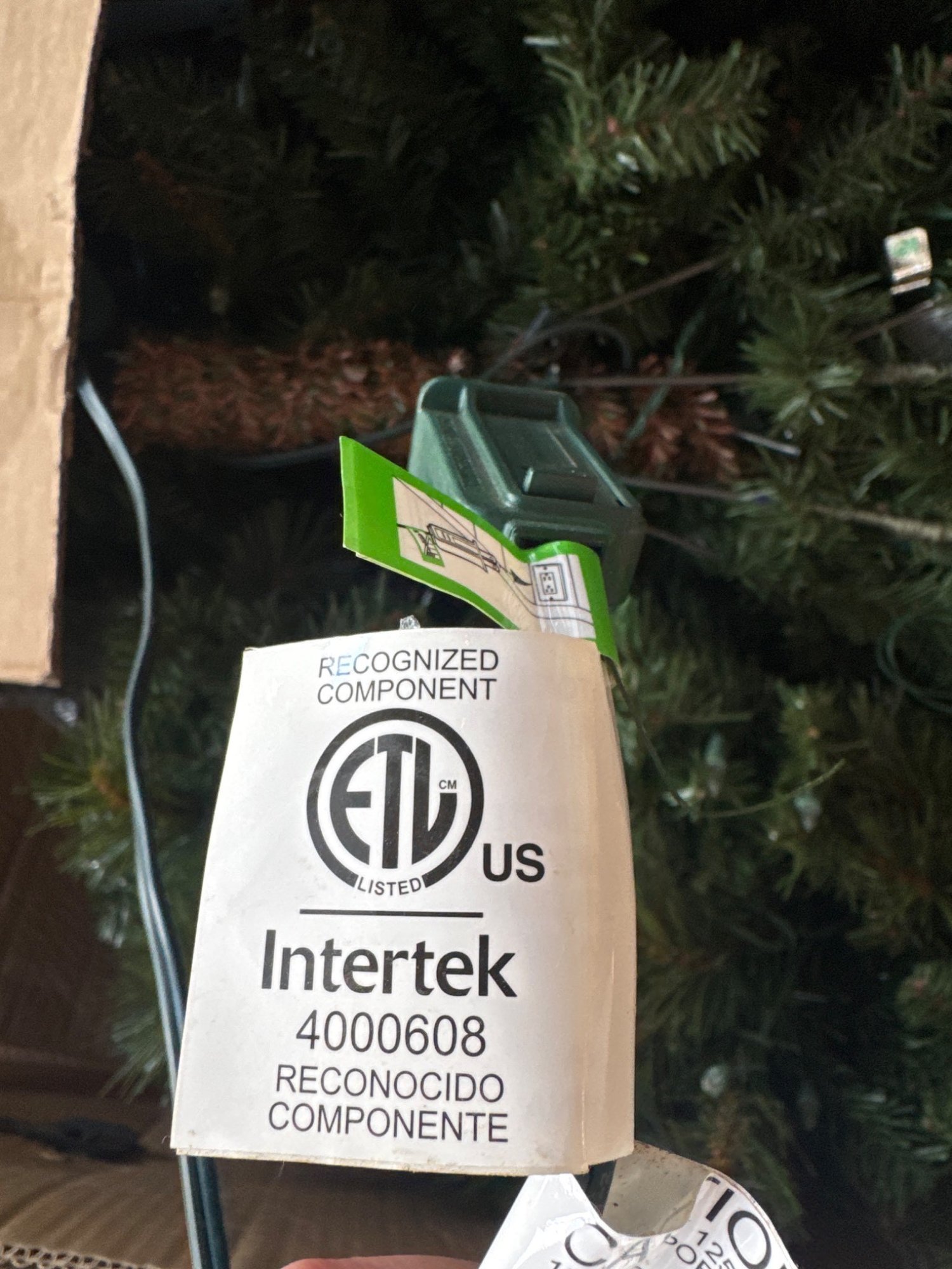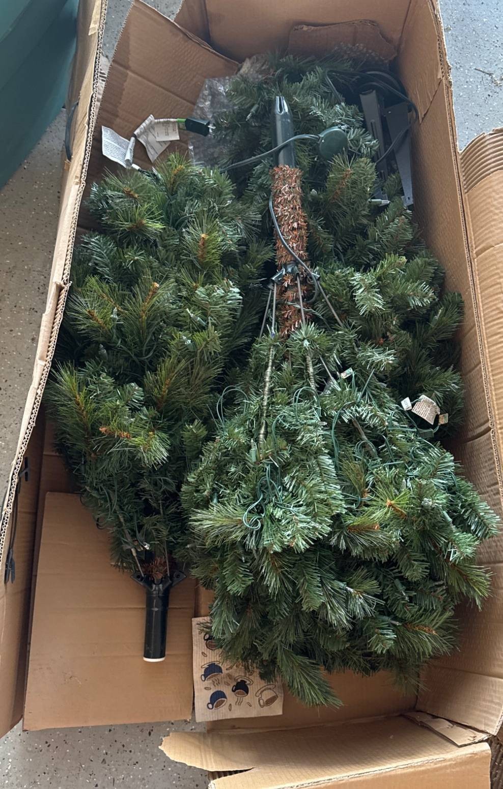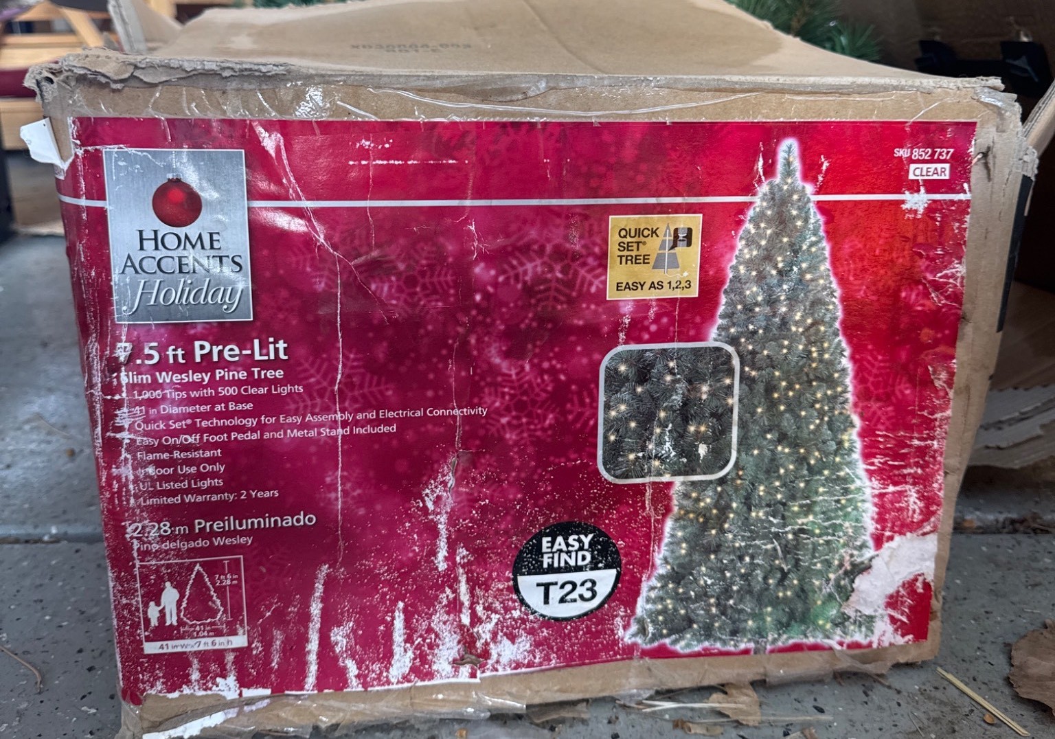 Home Accents Holiday 7.5 ft pre-lit artificial Christmas tree, supplied with its original box. Features a full design with integrated lighting (model #TG76P3254D03). Tag indicates UL certification by Intertek. Tree is disassembled into sections for easy storage. Some wear is visible on the box. Dimensions: 7.5 ft tall when assembled.