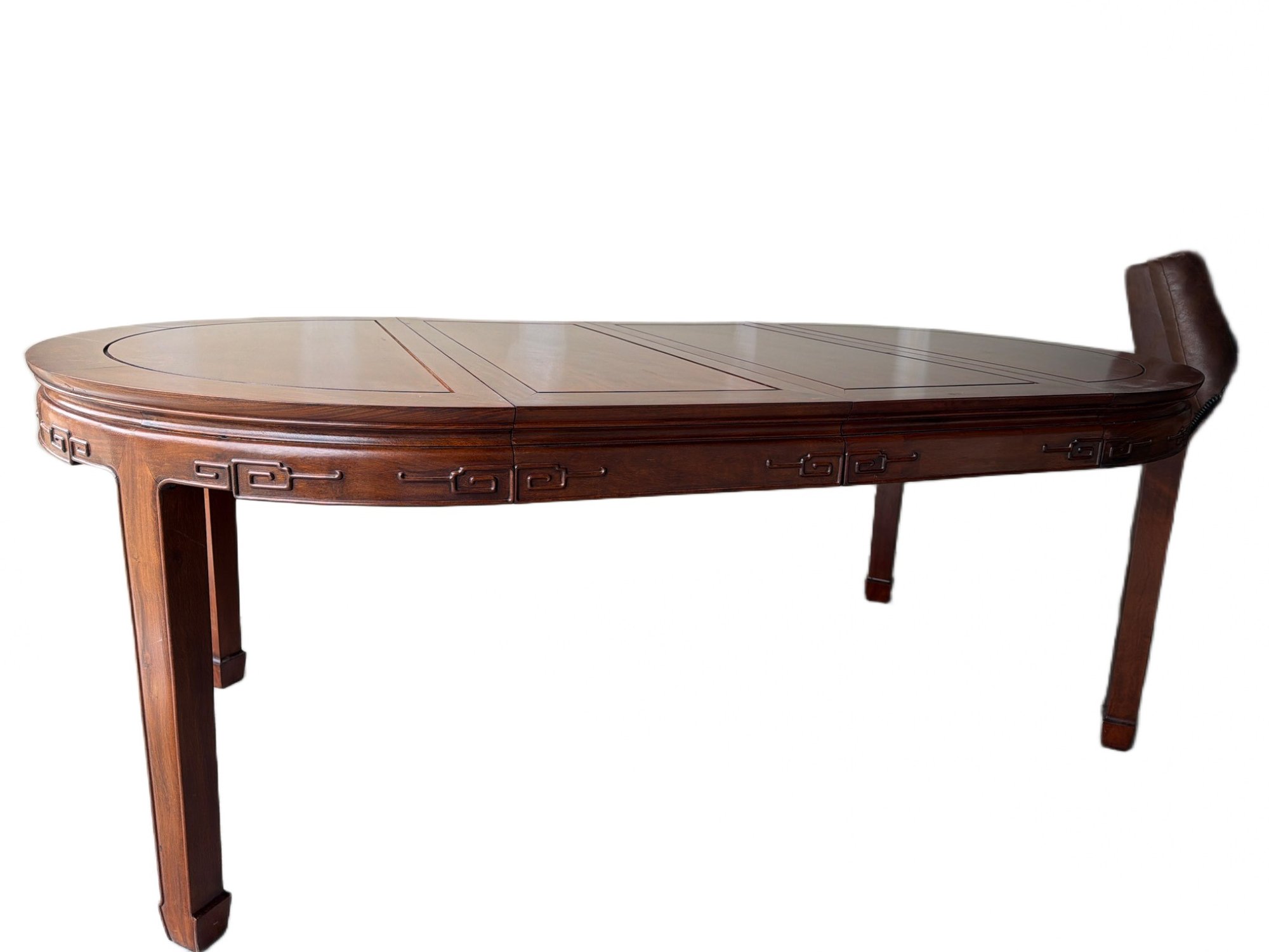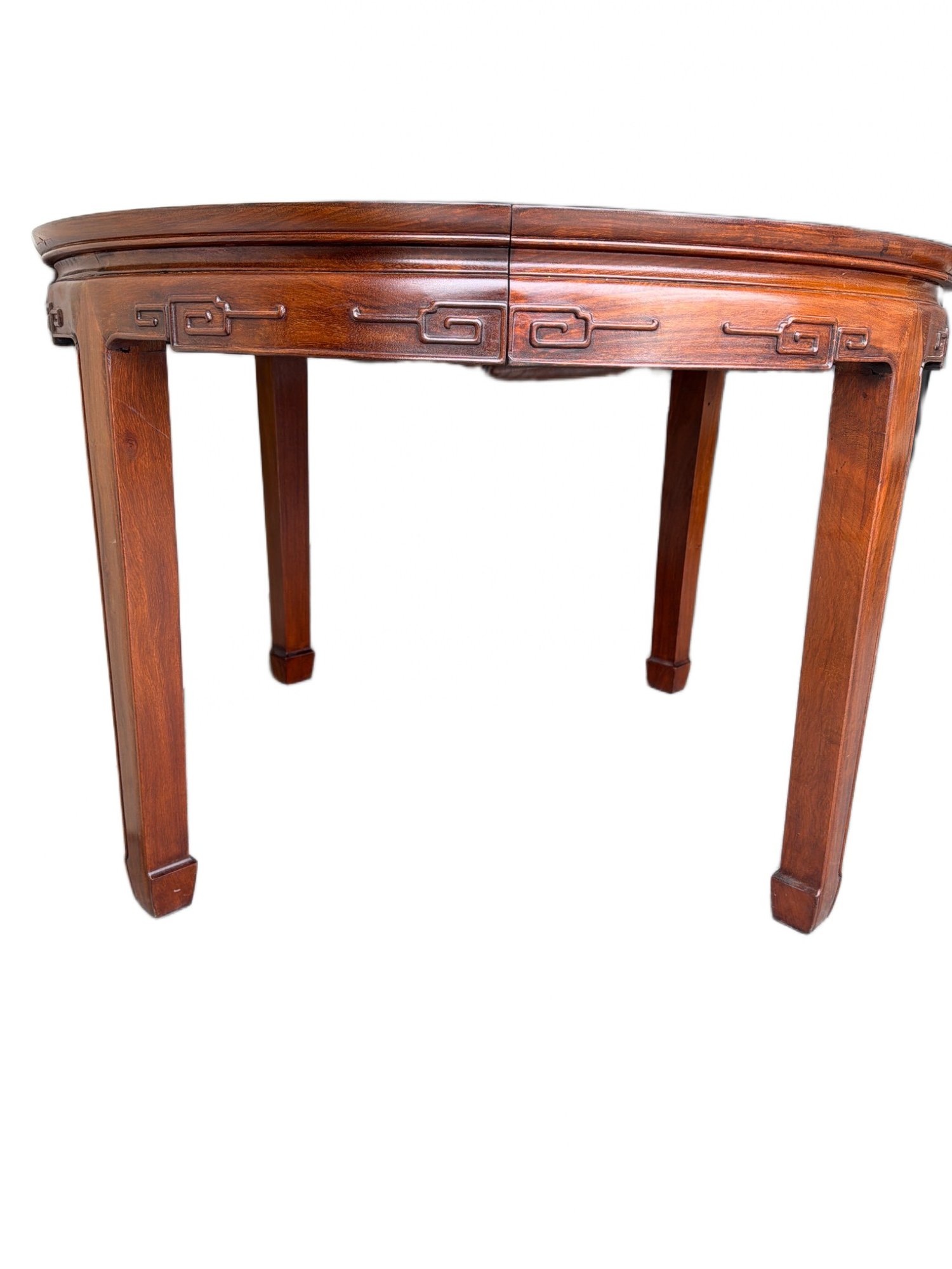 Expandable round wood dining table featuring carved detailing on the apron and legs. Made in Hong Kong. The table measures 46 inches in diameter and 30 inches tall without the leaves. Includes three leaves to extend the table, transforming it from a circular to an oval shape suitable for accommodating larger gatherings. each leaf is 17 3/4 inches.