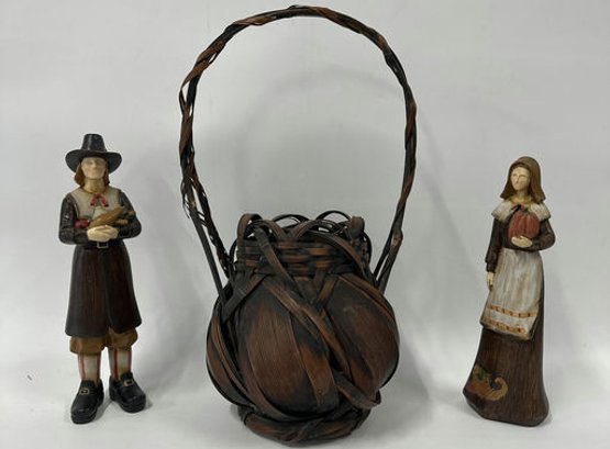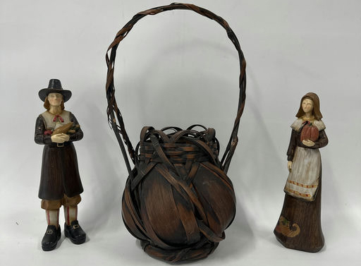 Japanese Woven Bamboo Basket, Couple Man And Women Pilgrim Figurines