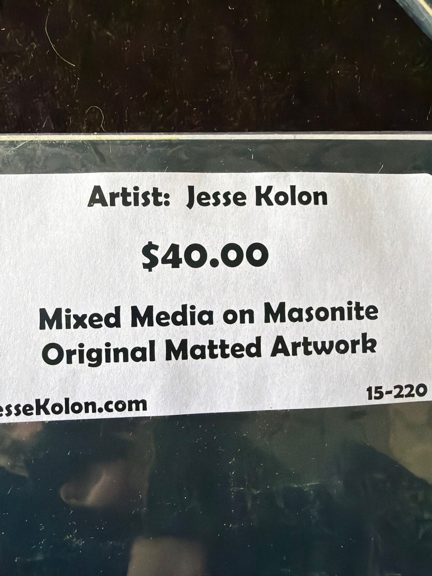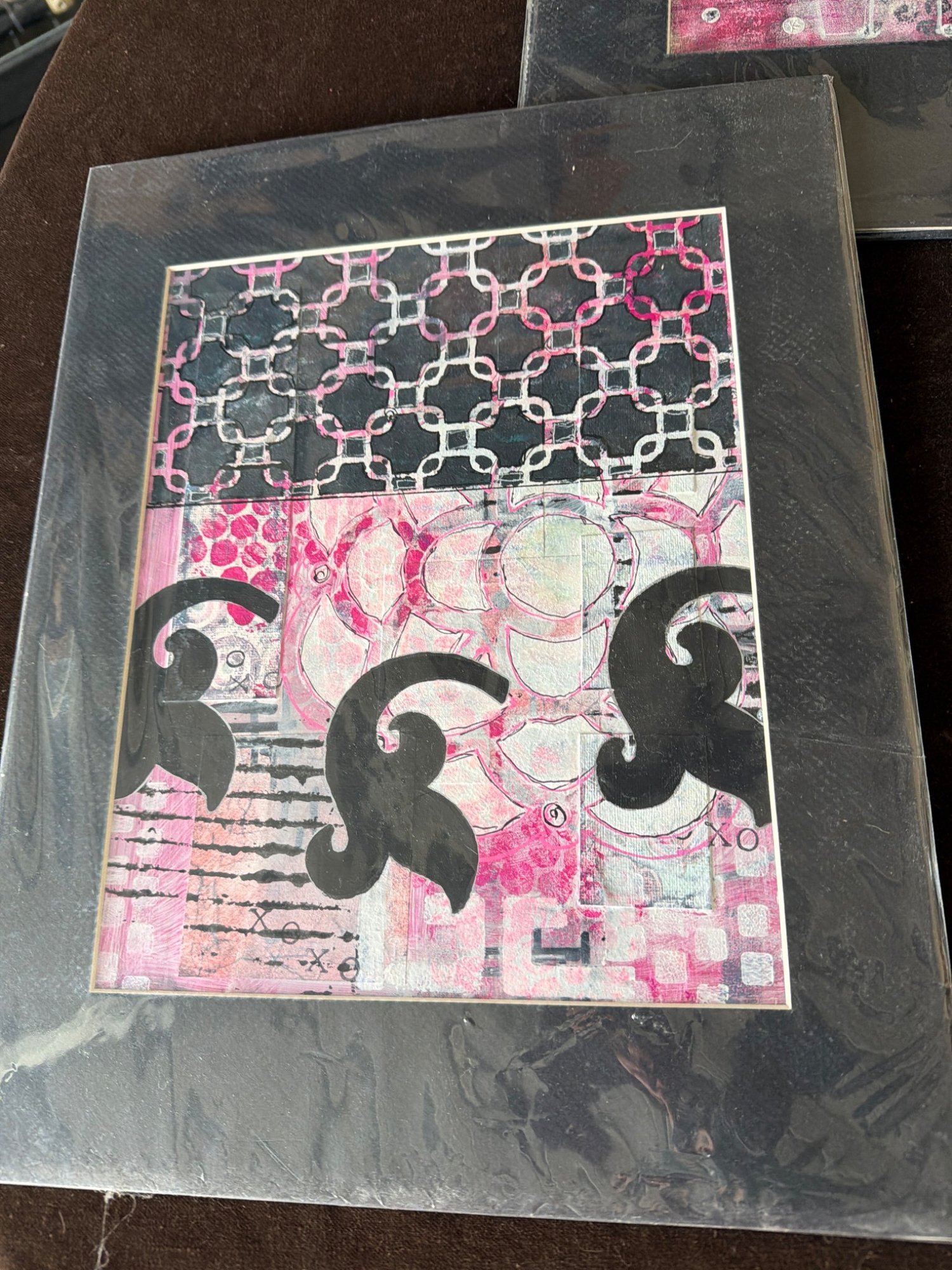 Jessie Kolon mixed media artwork on masonite, each piece featuring unique designs and color compositions. Each artwork is matted for display, as indicated on attached labels. Total of seven pieces included in the set. Individual pricing suggests $40 per artwork, Largest one is 14 inches.
