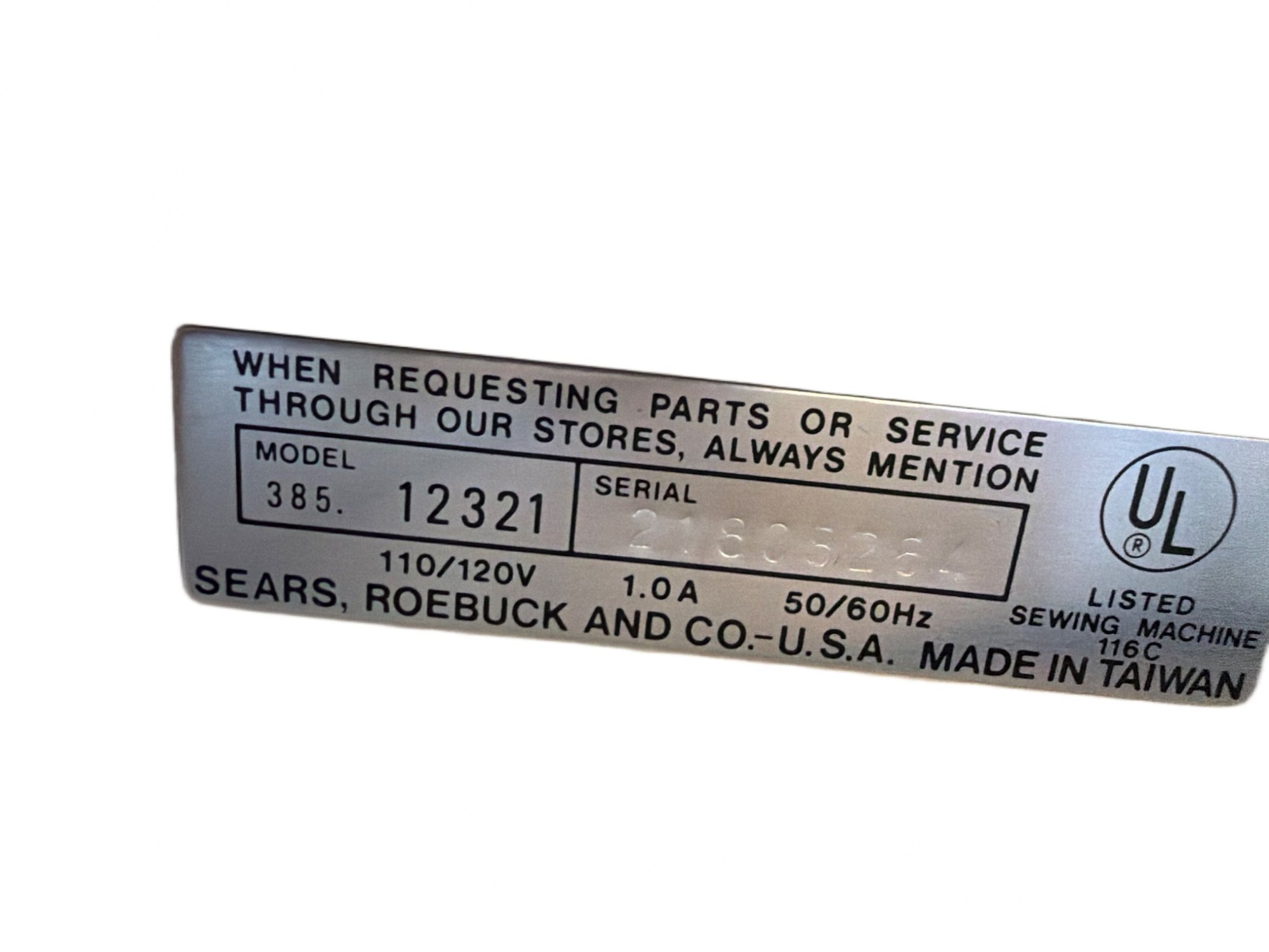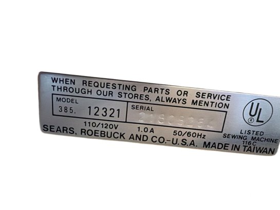Kenmore 4-Stitch free-arm sewing machine, Model 385.12321. Manufactured in Taiwan by Sears, Roebuck, and Co. Operates on 110/120V, 1.0A, 50/60Hz. The unit is UL listed (116C). Includes integrated controls for stitch adjustments.