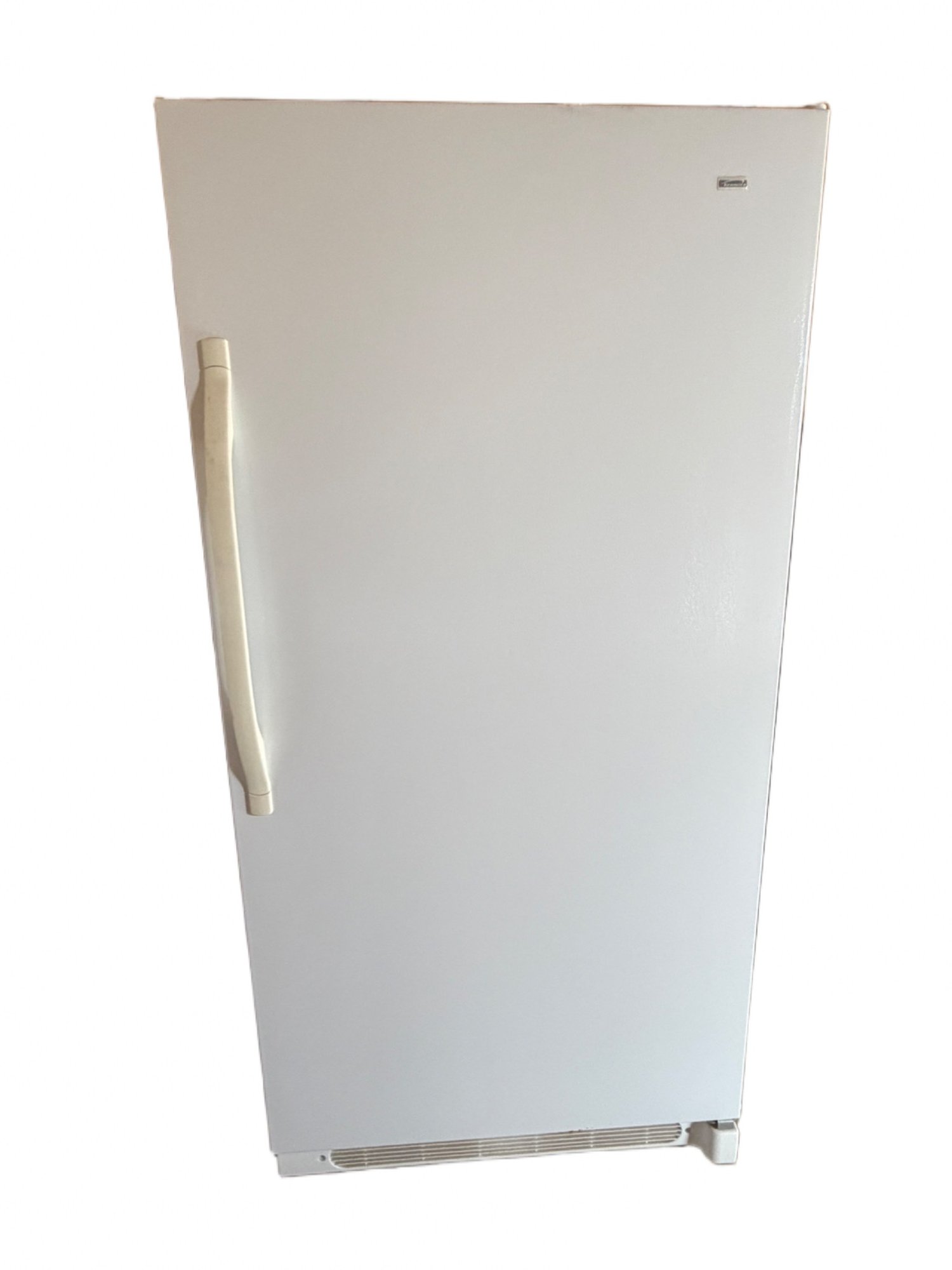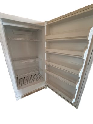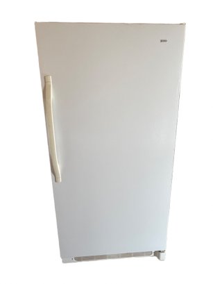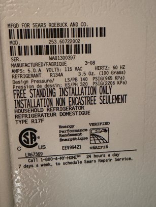 Kenmore upright freezer, model number 253.60722002, manufactured for Sears Roebuck and Co. Features a R134a refrigerant system and operates at 115 VAC with a 5.0A rating. It is designed for freestanding installation only and includes multiple interior wire shelves and door compartments for storage. Serial number WBA13009706. Clean, defrosted