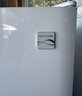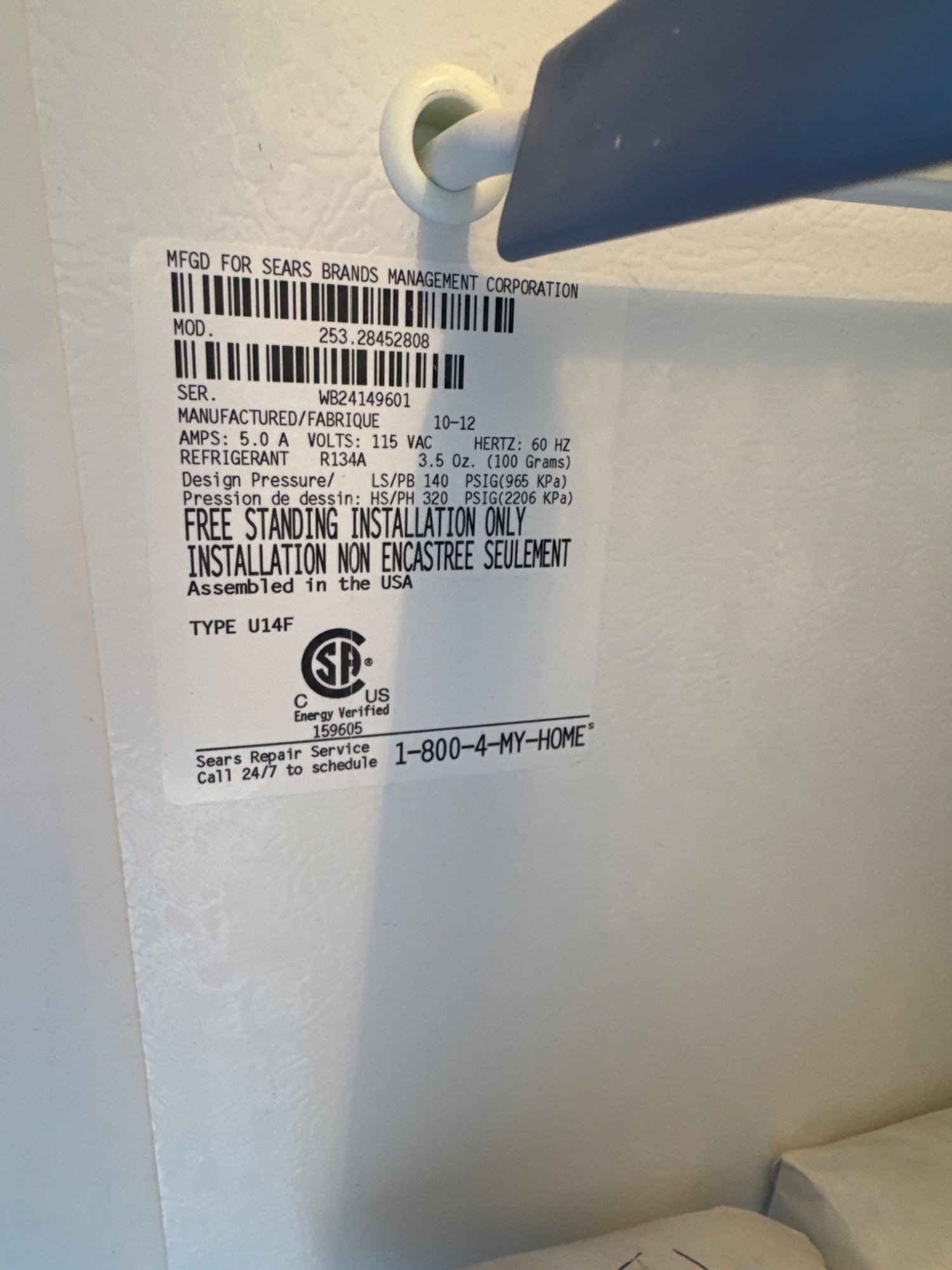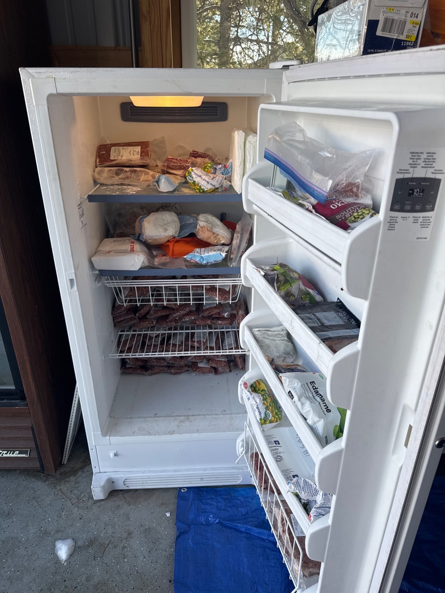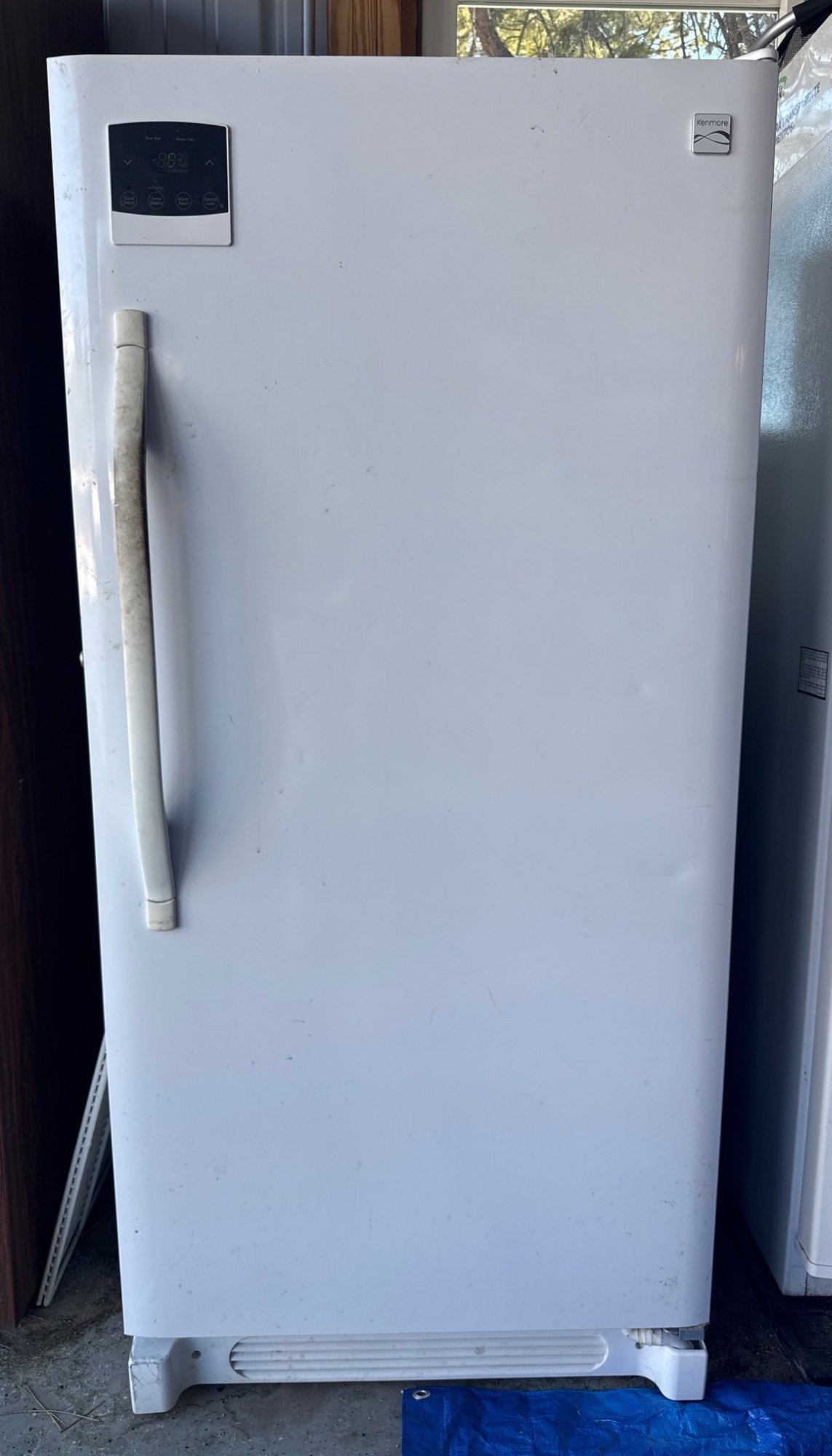 Kenmore upright freezer model 253.28462808 manufactured by Sears Brands Management Corporation. Freestanding white appliance with a digital control panel featuring options such as Quick Freeze, Temp Display, Alarm Reset, and Control Lock. Includes multiple adjustable shelves and door compartments for storage. Dimensions are approximately 59 inches in height, 27 inches in width, and 28 inches in depth based on visible measuring tape. Working condition. Food not included.