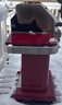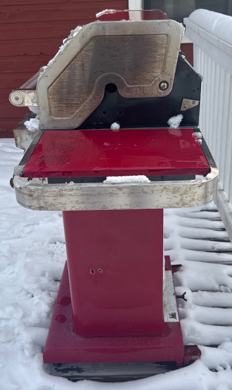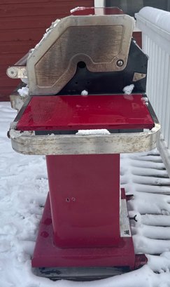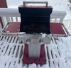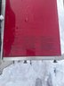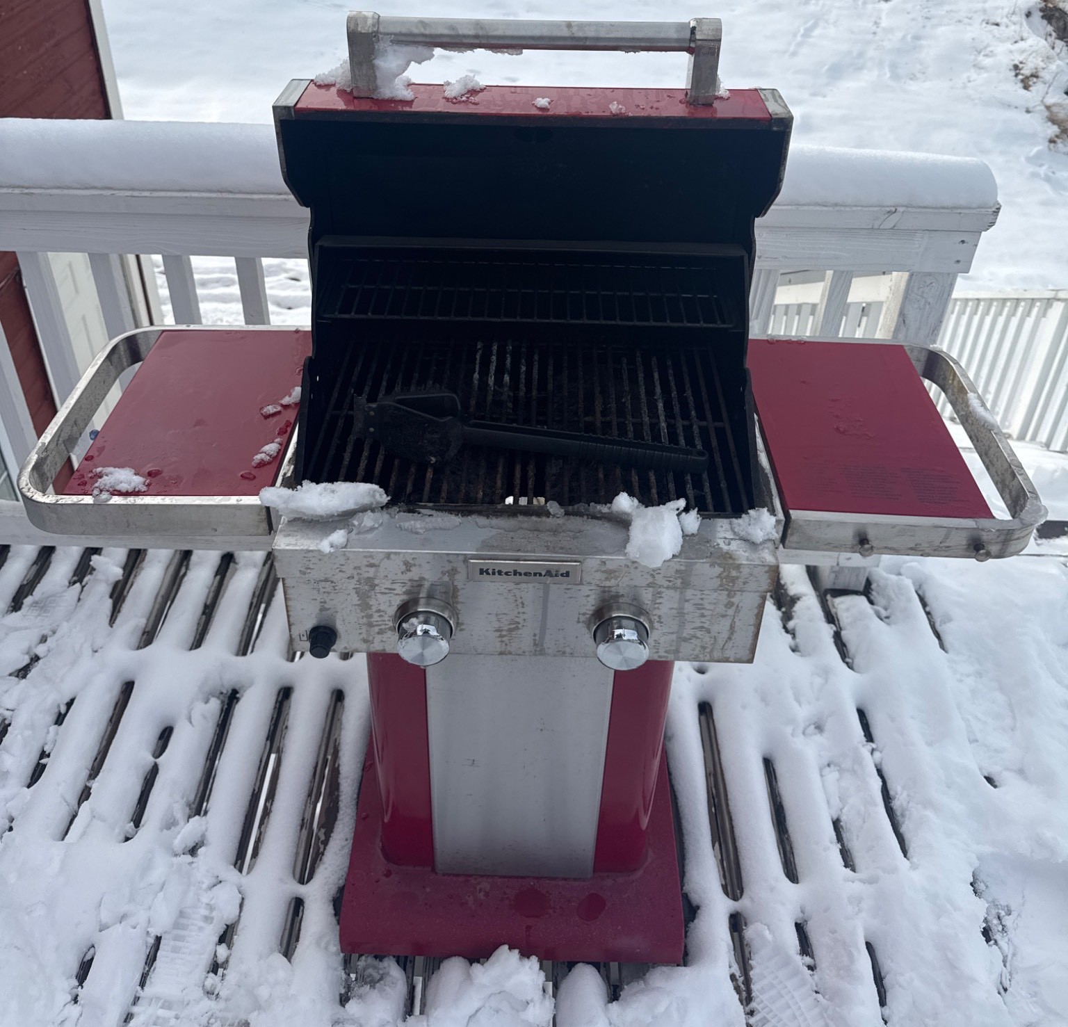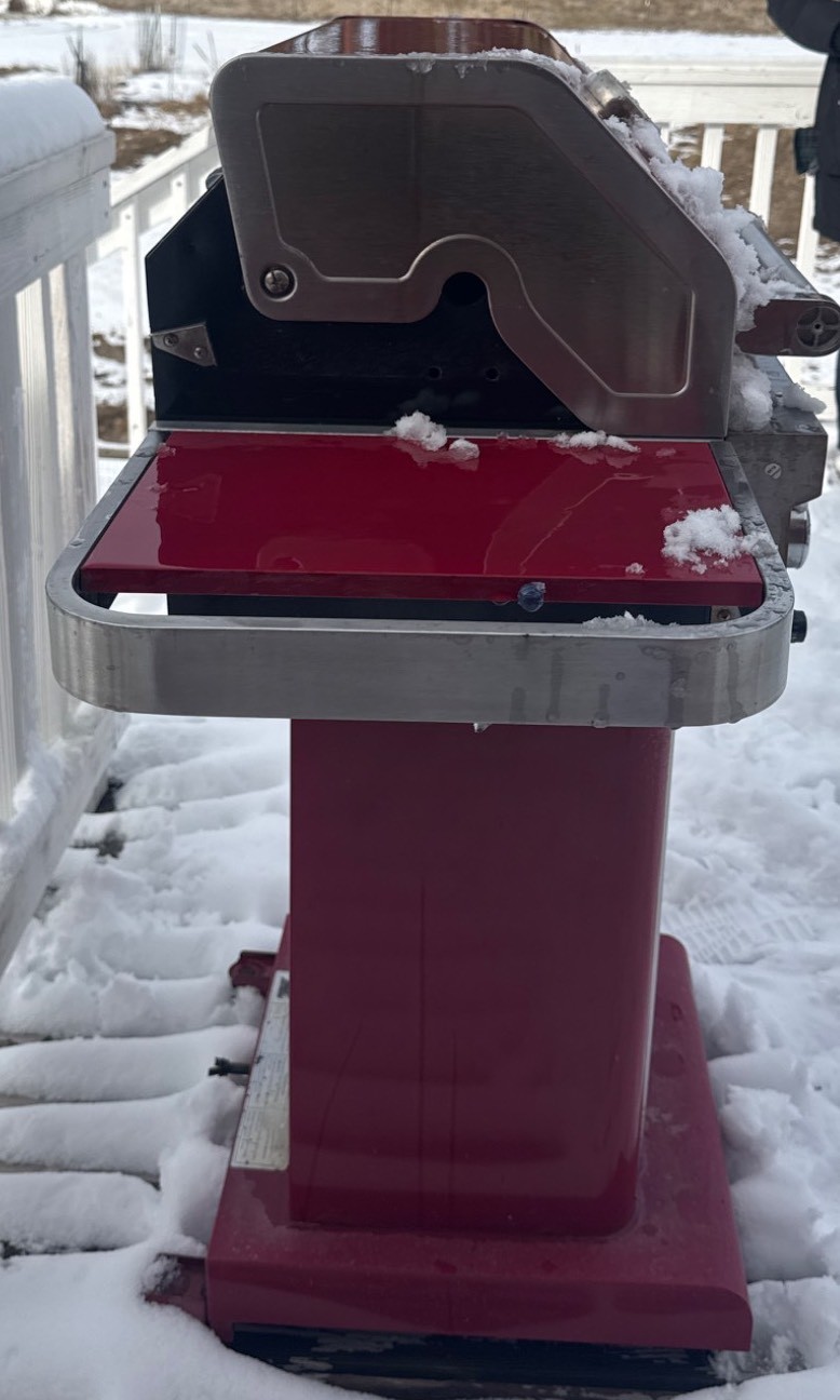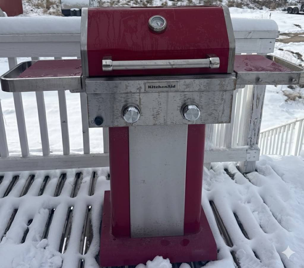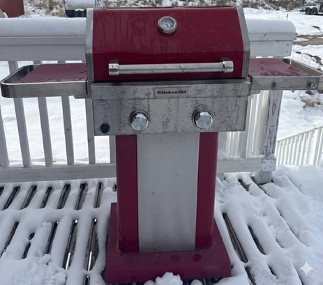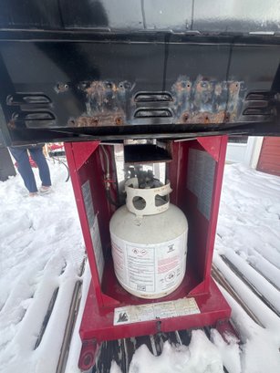 two-burner propane gas grill with a red enamel finish and stainless steel accents. Features include a dual-burner control panel with two knobs, a built-in temperature gauge on the lid, and side shelves for storage. The grill is equipped with a lower storage area for the propane tank. Exhibits signs of wear, rust near the grill hood interior, and general use. Dimensions available upon request.