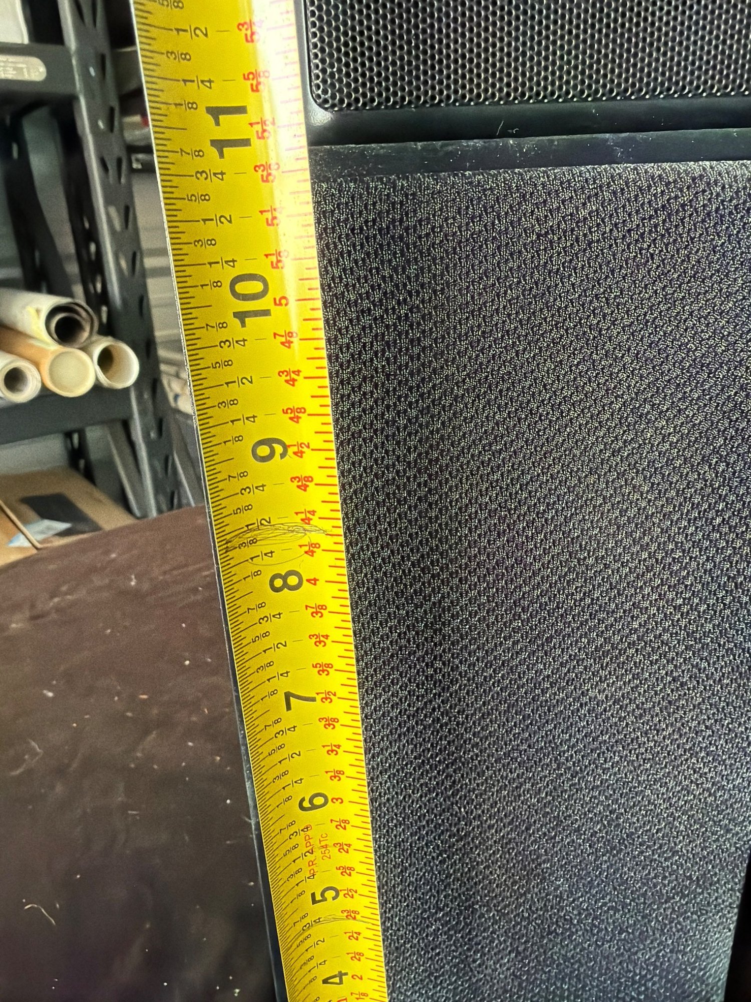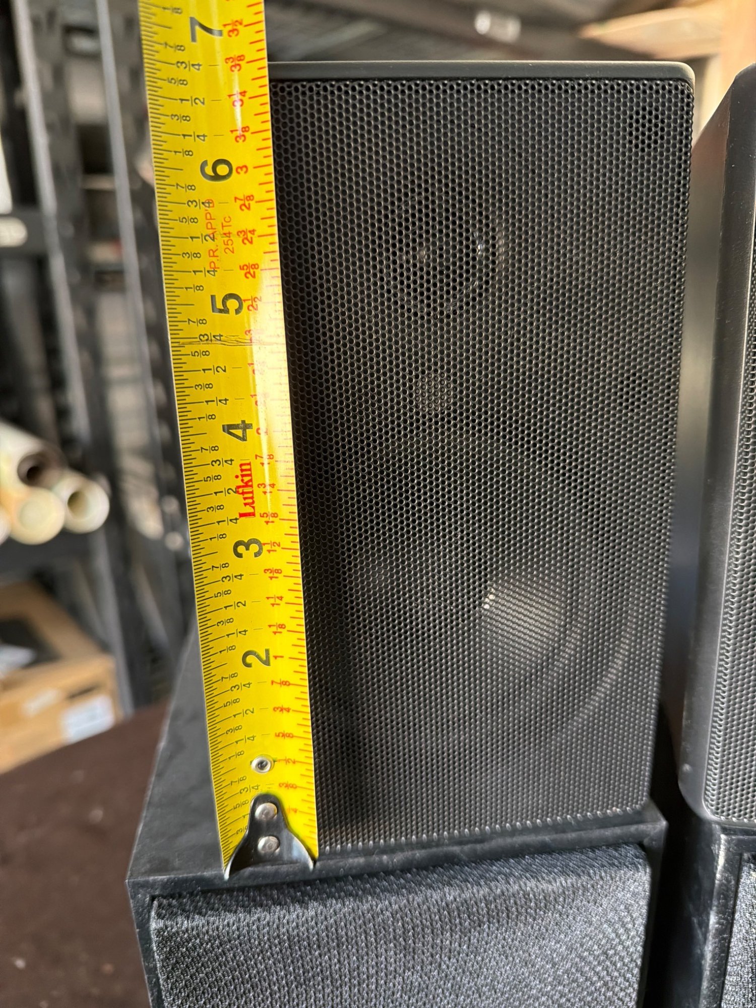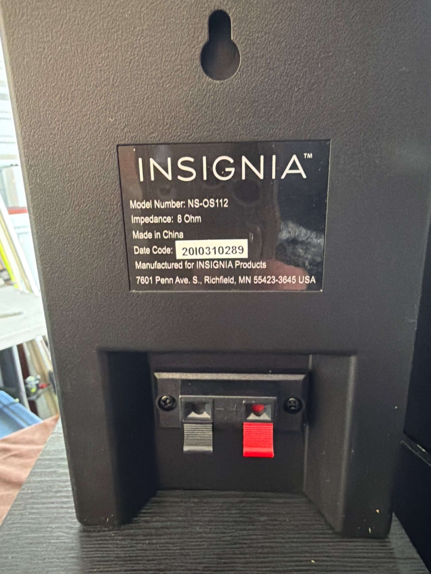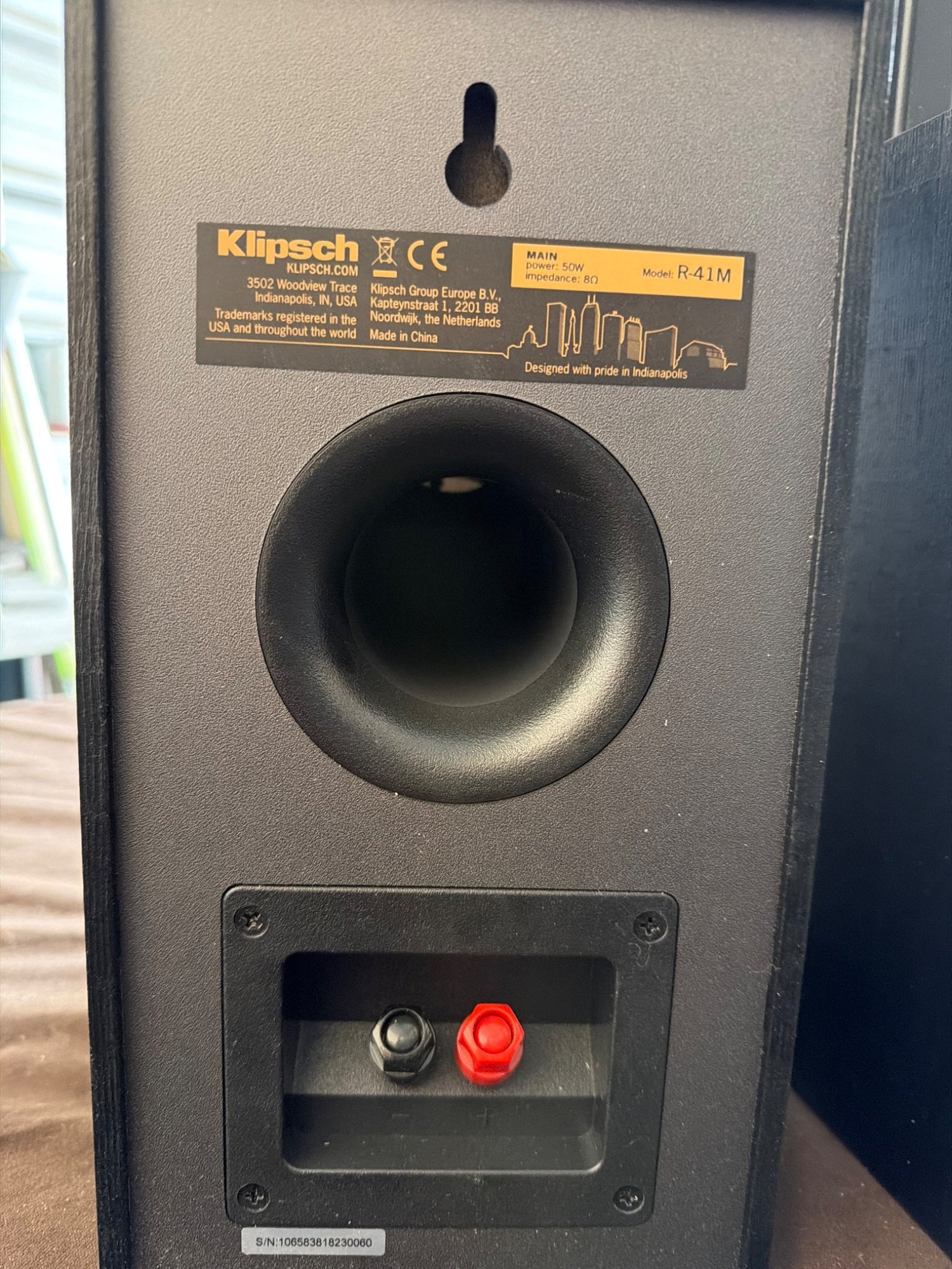Four speakers including two Klipsch R-41M bookshelf speakers and two Insignia NS-OS112 speakers. Klipsch R-41M features a rear-firing port and a connection panel with binding posts. Insignia NS-OS112 speakers have an impedance of 8 Ohms with rear-mounted connection posts. The Klipsch speakers measure approximately 11 inches tall, while the Insignia speakers measure approximately 9 inches tall.