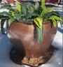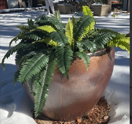 A large, round, glazed ceramic planter featuring a gradient of earthy tones from brown to tan. The planter is topped with a layer of faux ferns covered by snow. Exterior height measures approximately 19 inches, and the widest diameter is approximately 19 inches, based on the nearby tape measure for reference. Positioned outdoors in a snow-covered setting.