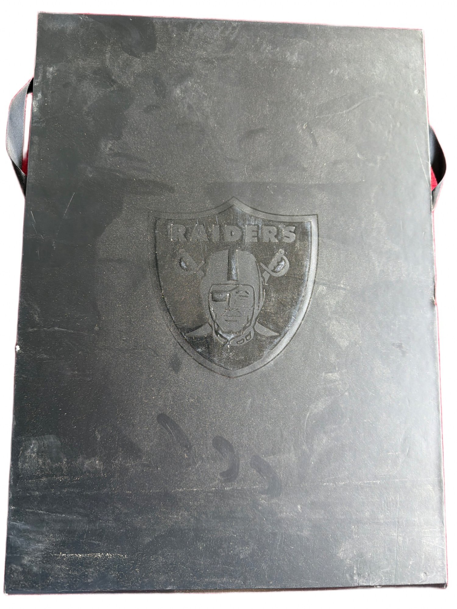 Las Vegas Raiders commemorative presentation light box featuring the team’s logo in embossed detail on the cover. The interior contains graphics and tribute-related elements commemorating significant players and moments in Raiders history. The box is approximately 12 inches in length. Light wear is visible on the exterior consistent with handling.
