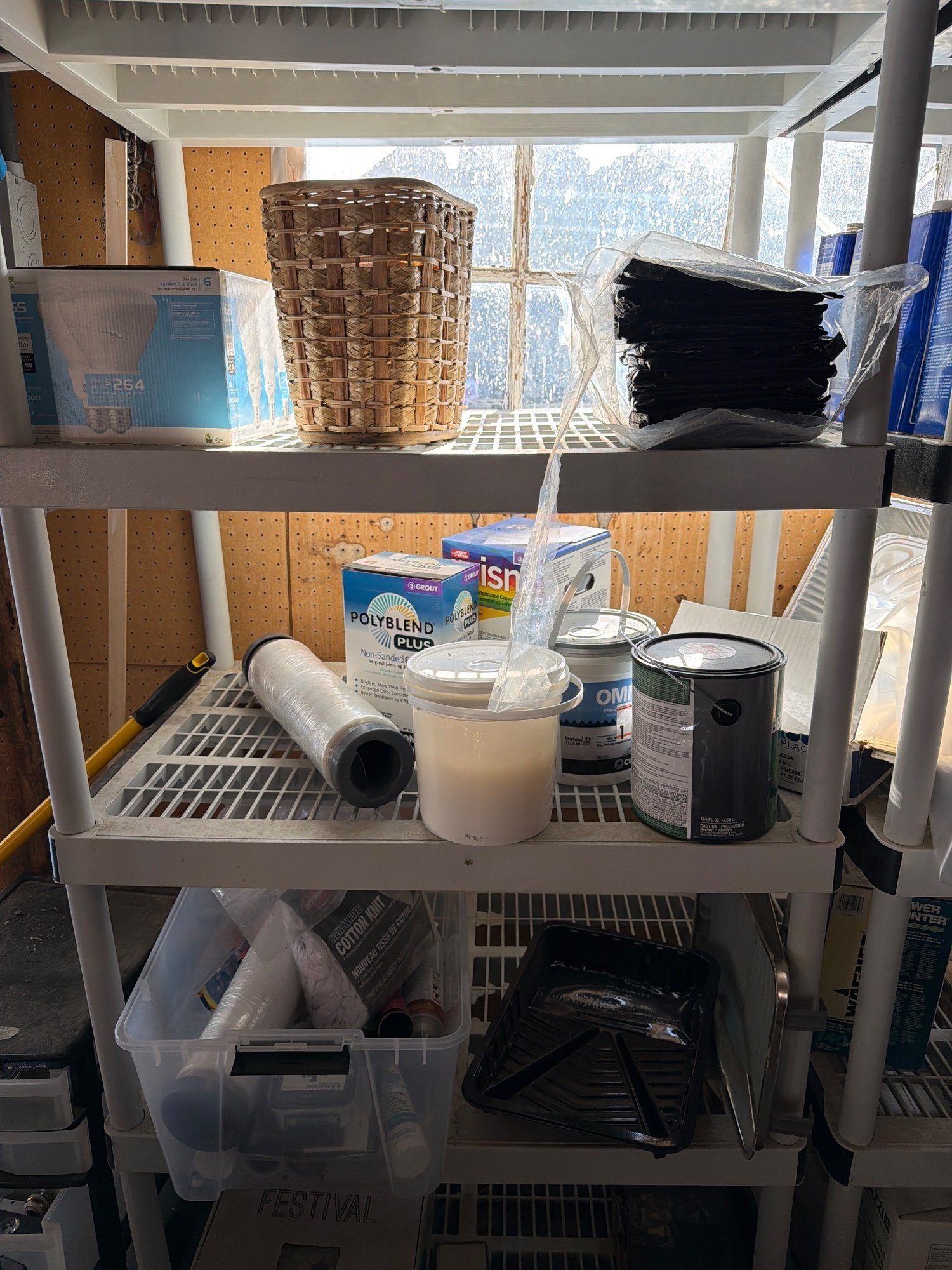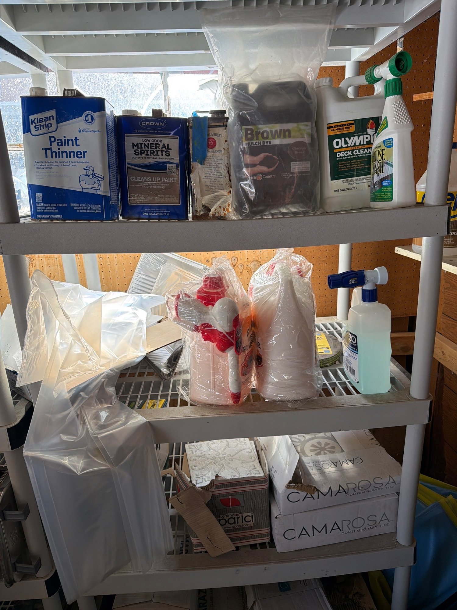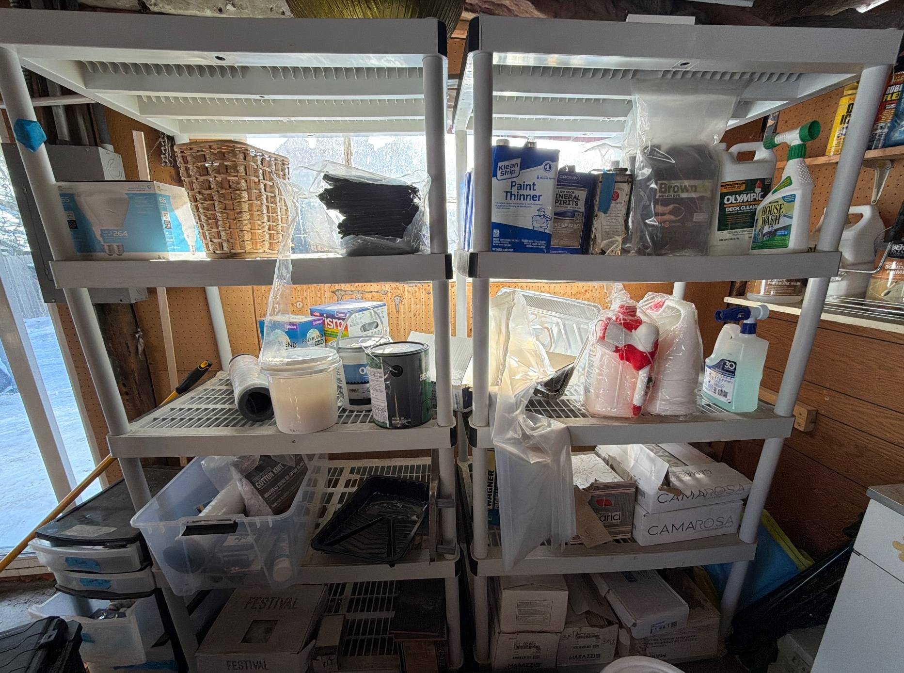Includes white plastic shelving units holding an assortment of household and workshop supplies such as paint thinner, cleaning agents, empty spray bottles, disposable trays, gardening items, and storage containers. Items and shelving exhibit signs of use. Shelves measure approximately 5 feet in height and 3 feet in width per unit.