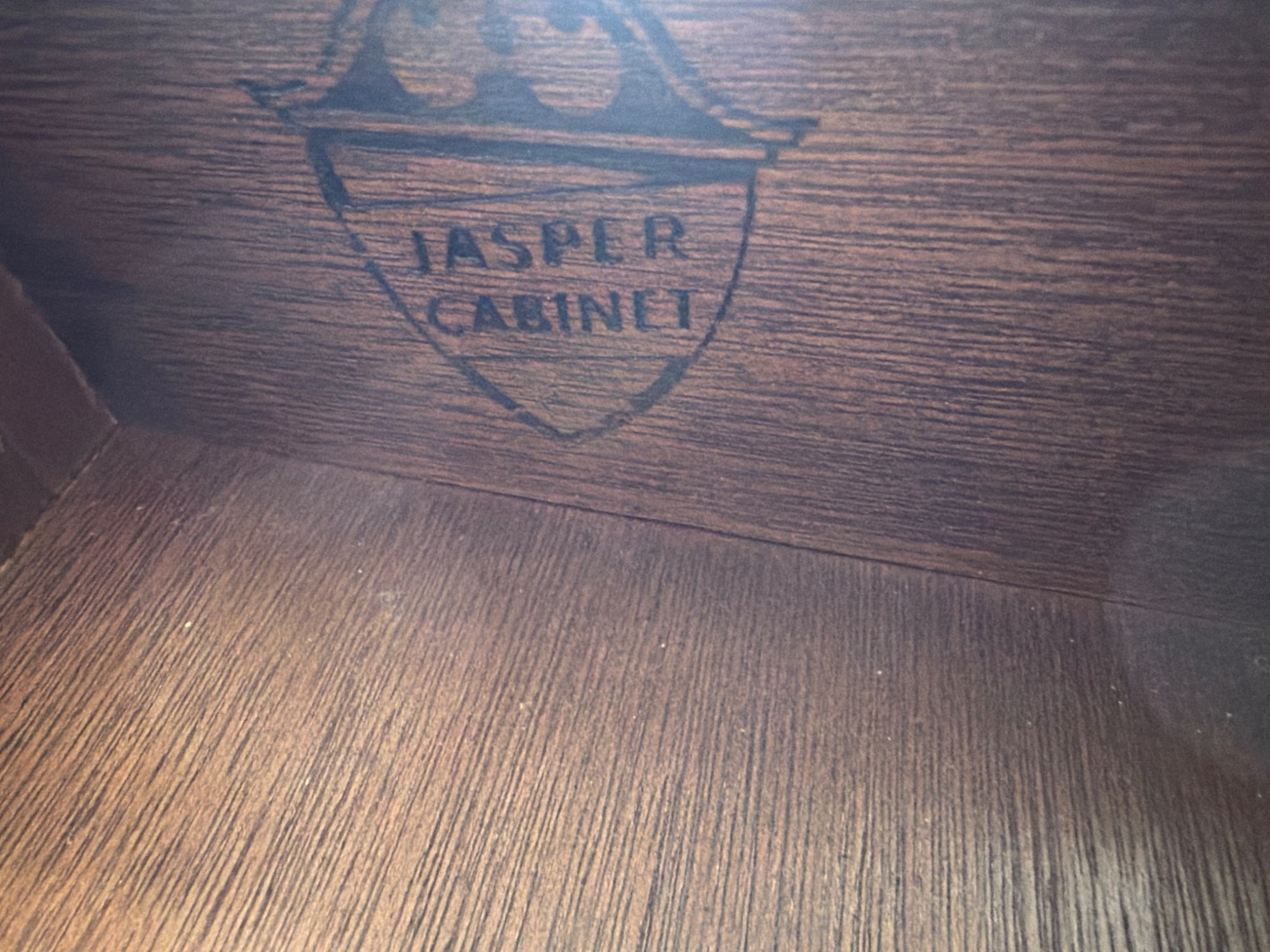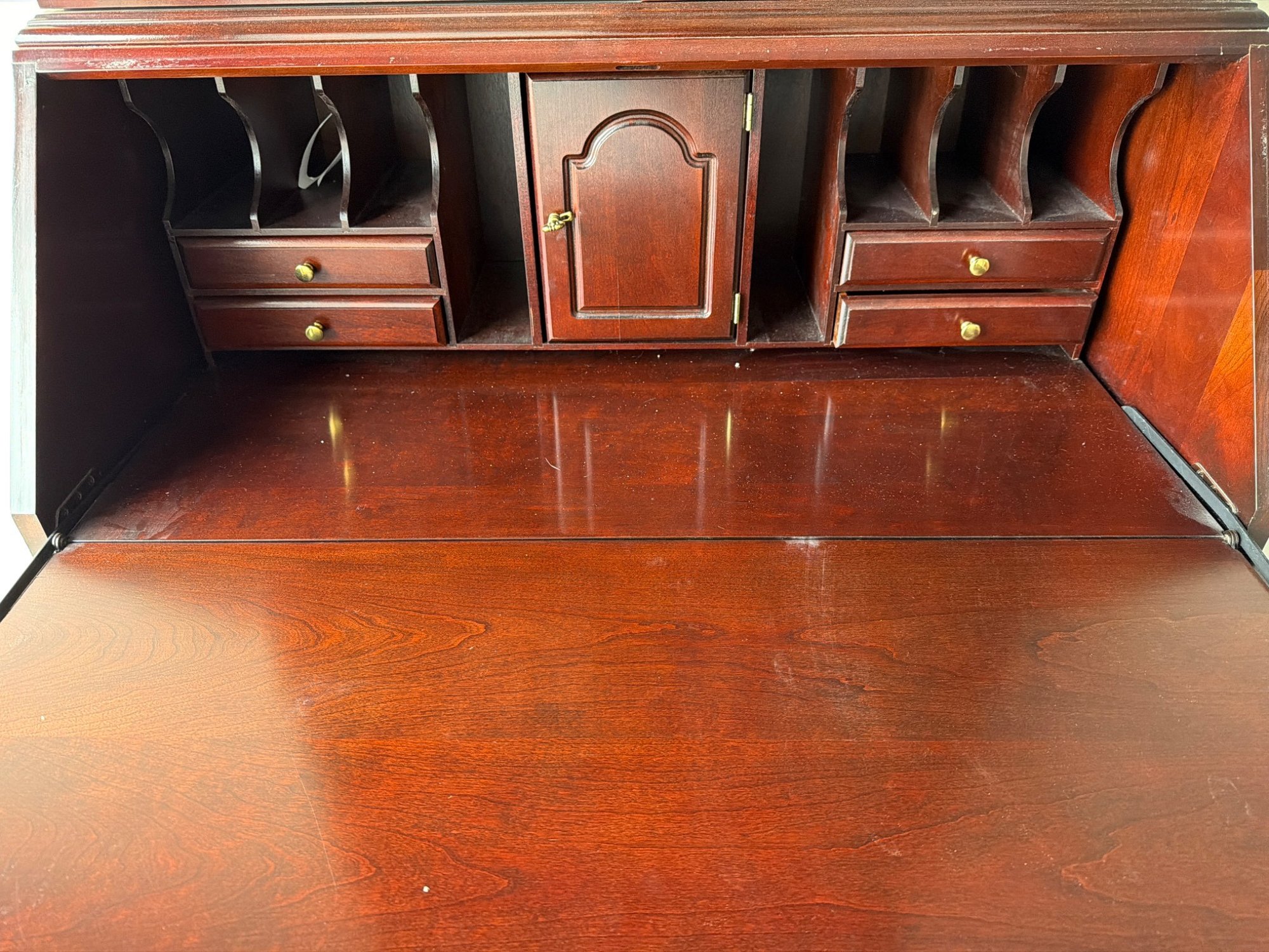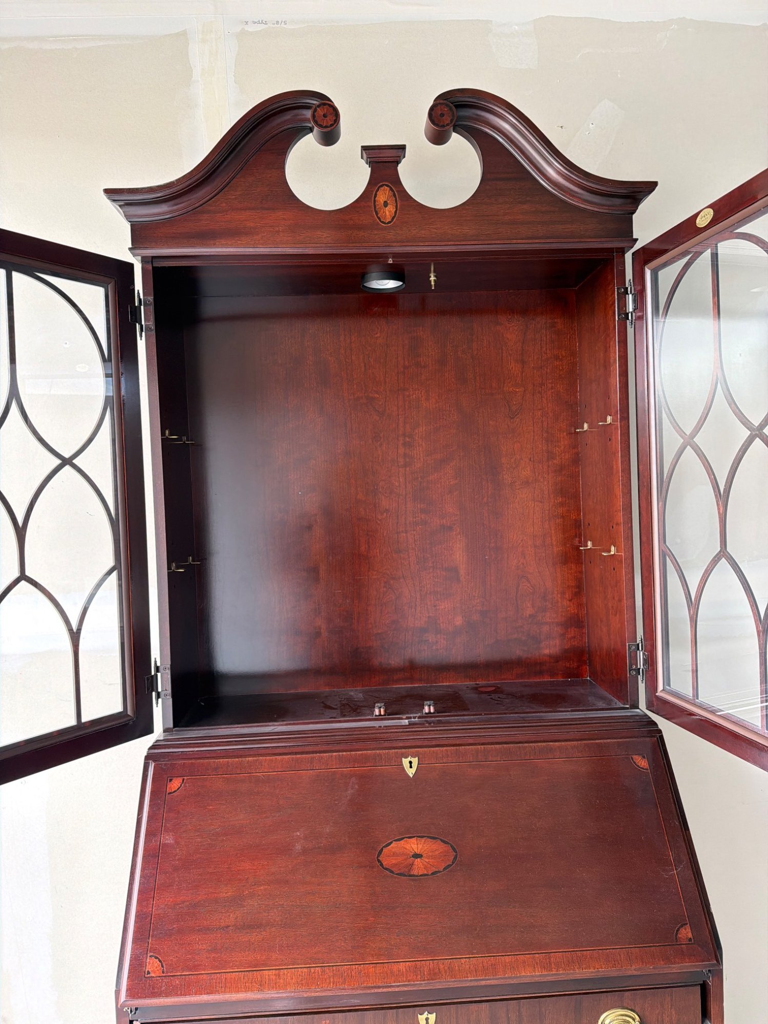 Mahogany secretary bookcase by Jasper Cabinet featuring a classic broken pediment top with inlaid detailing, two glass doors with lattice accents, a drop-front writing desk, fitted interior compartments with small drawers and a central cabinet, and four lower dovetail-constructed drawers with brass drop handles. Dimensions: 85 inches tall x 18 inches deep x 34 inches wide.
