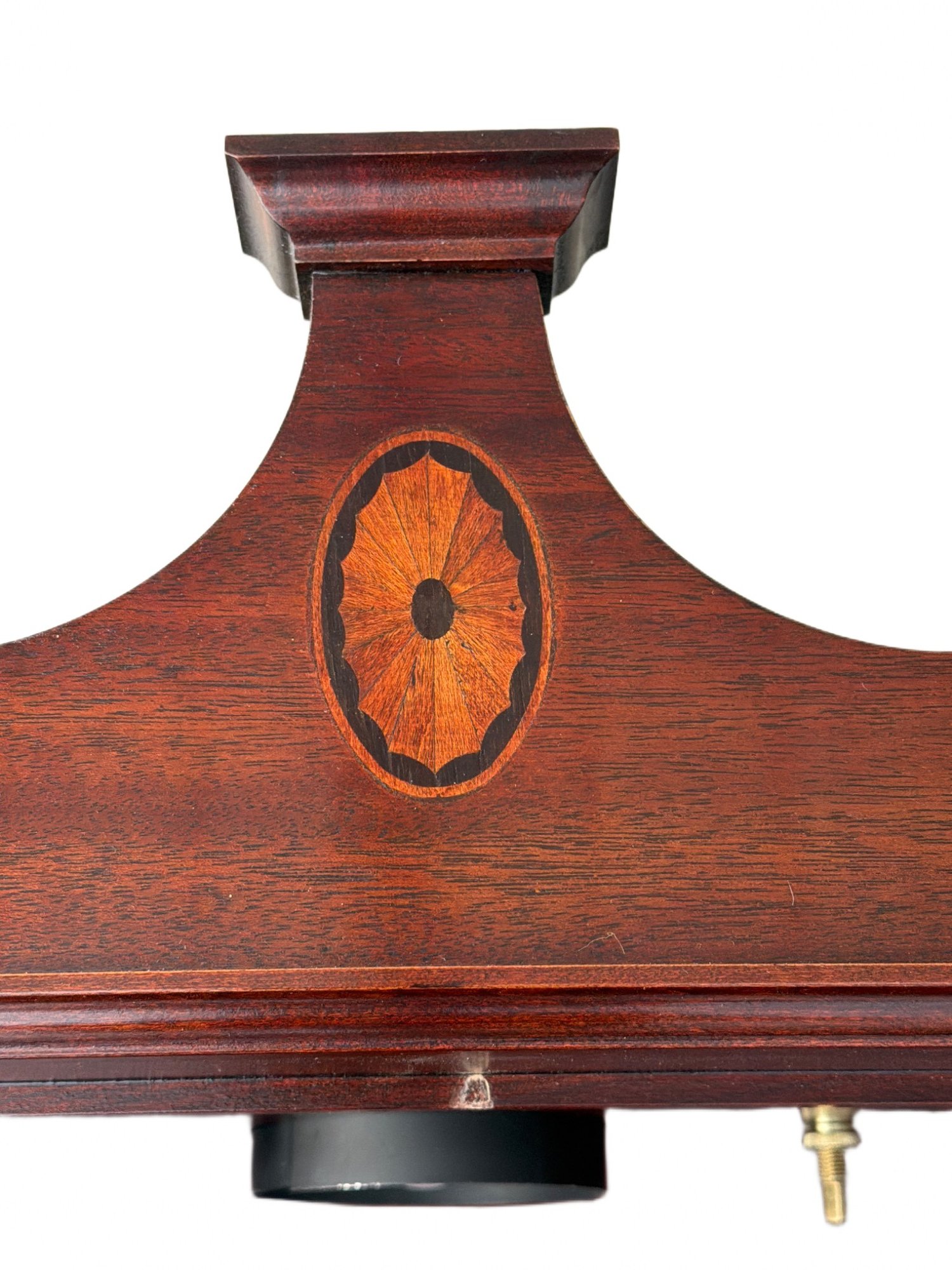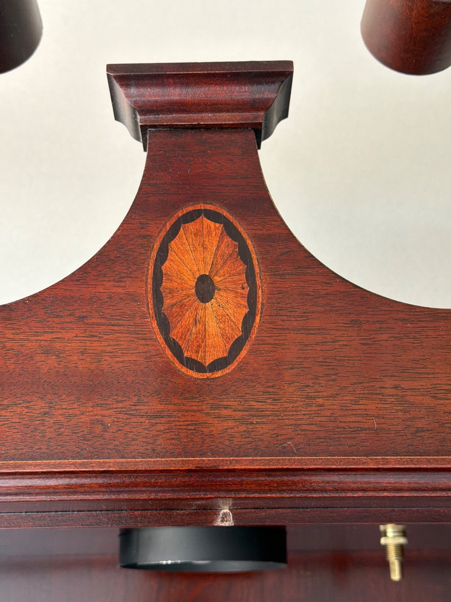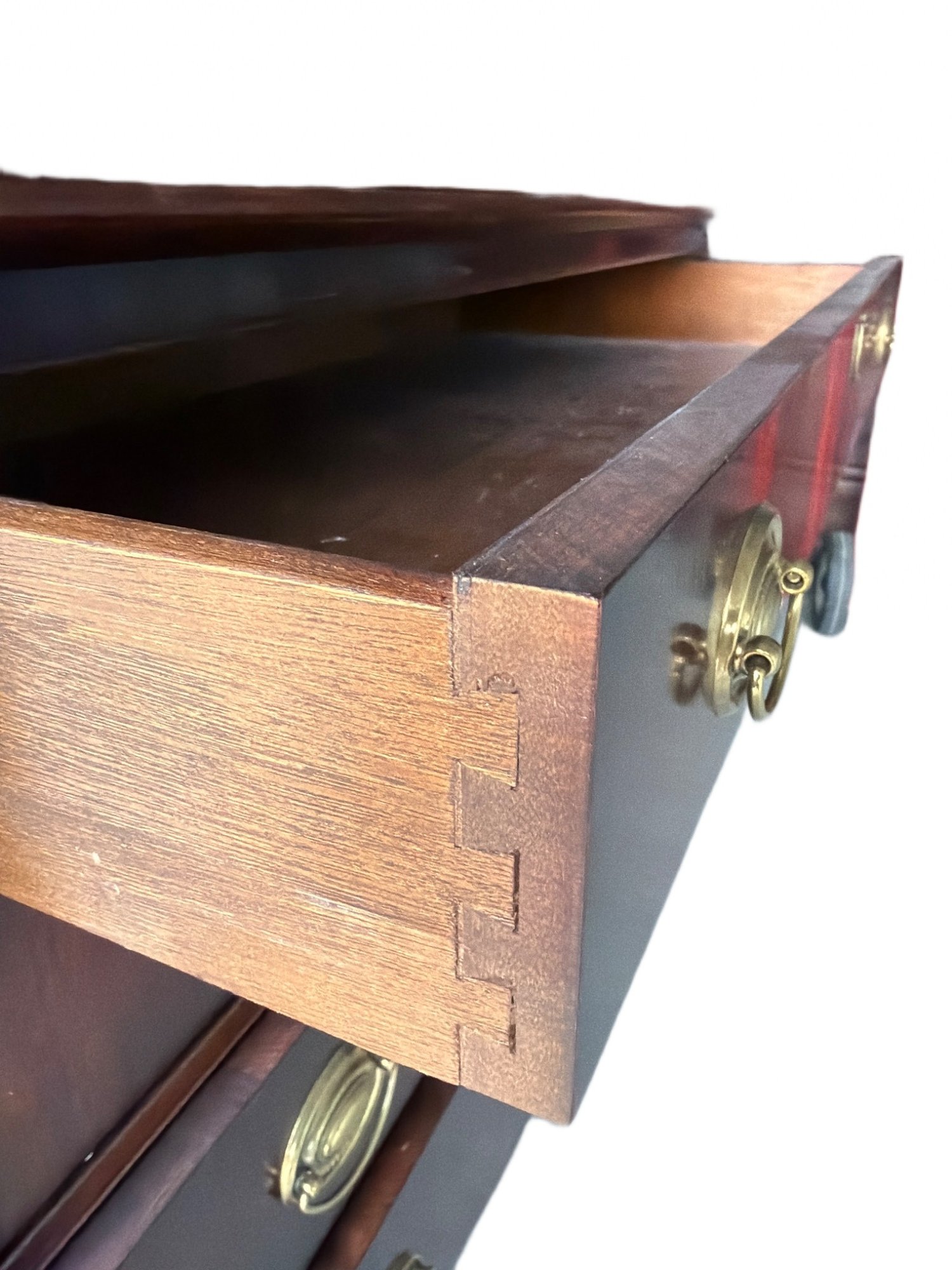 Mahogany secretary bookcase by Jasper Cabinet featuring a classic broken pediment top with inlaid detailing, two glass doors with lattice accents, a drop-front writing desk, fitted interior compartments with small drawers and a central cabinet, and four lower dovetail-constructed drawers with brass drop handles. Dimensions: 85 inches tall x 18 inches deep x 34 inches wide.