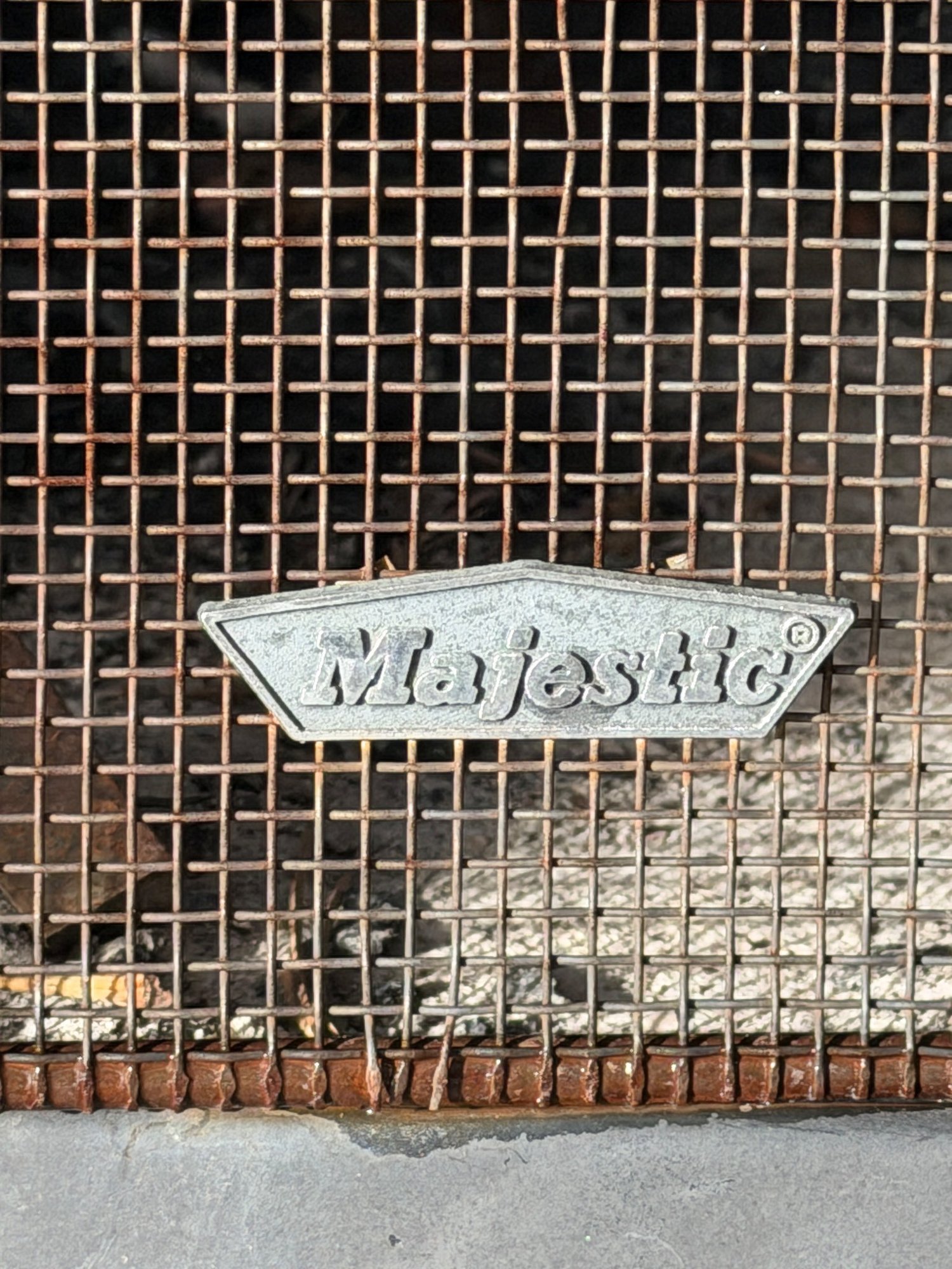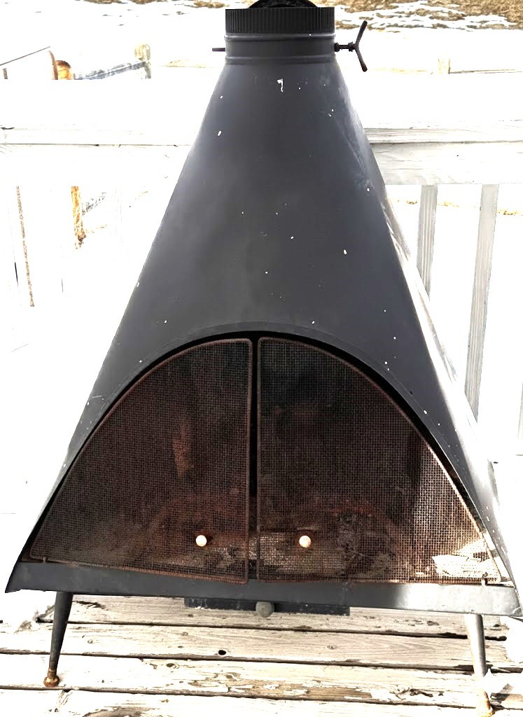 Majestic brand mid-century modern outdoor fireplace made of black metal with a triangular, cone-shaped body and mesh front screen. Includes a vented smoke flue at the top and metal legs for stability. Some rust on the screen and wear on the paint is visible. Ideal for patio or garden use. Approximate dimensions: 40″ H x 26″ W x 22″ D.