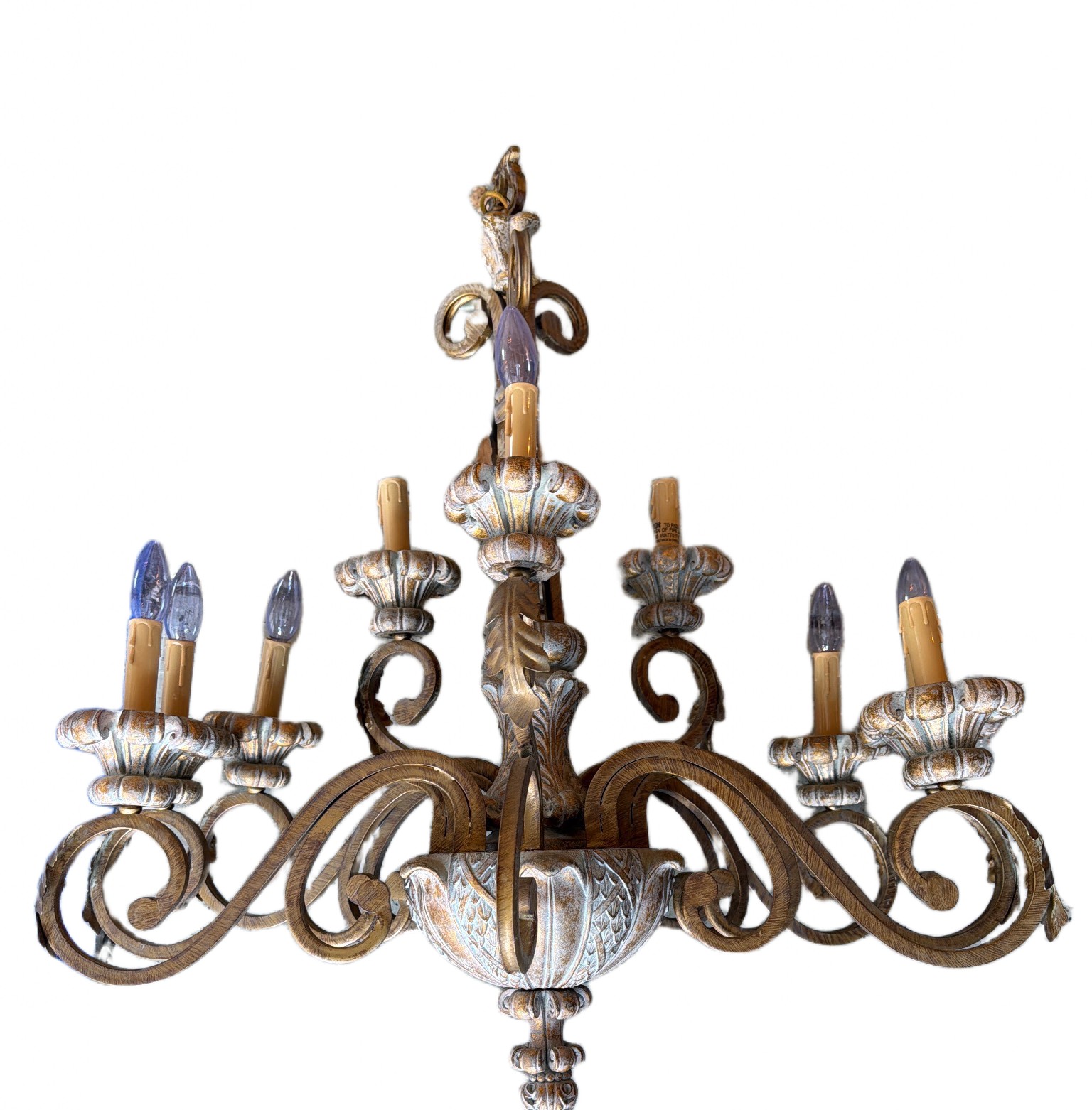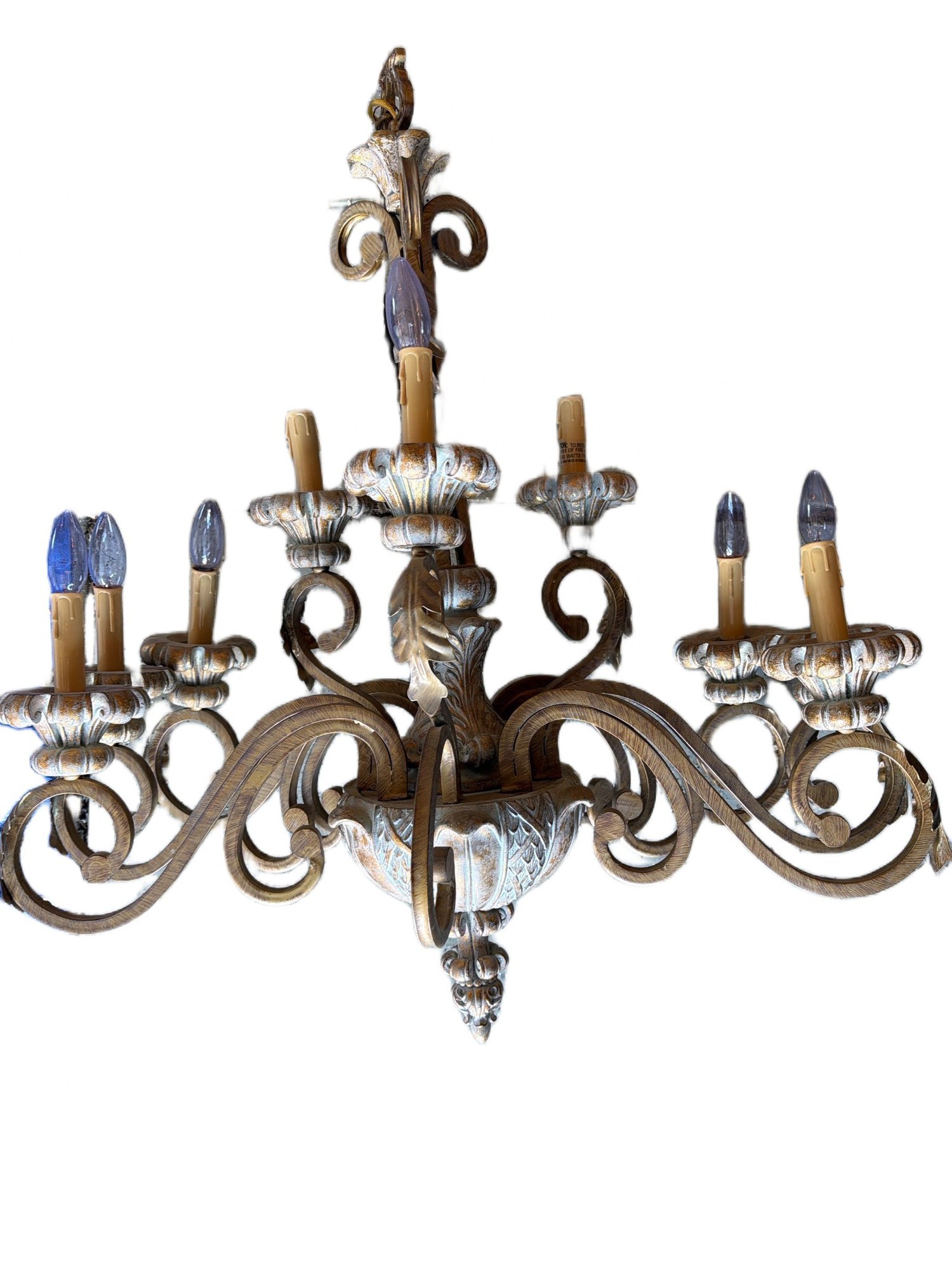 A six-light chandelier featuring a combination of metal and resin materials. The design includes scrolled arms and ornate details throughout the frame, with candle-style light fittings and plastic light covers mimicking wax drips. The fixture is embellished with sculptural floral-inspired elements and a distressed finish. Each arm holds a single light bulb socket accommodating E12 candelabra-style bulbs. Dimensions: approximately 24 inches wide and 20 inches tall.