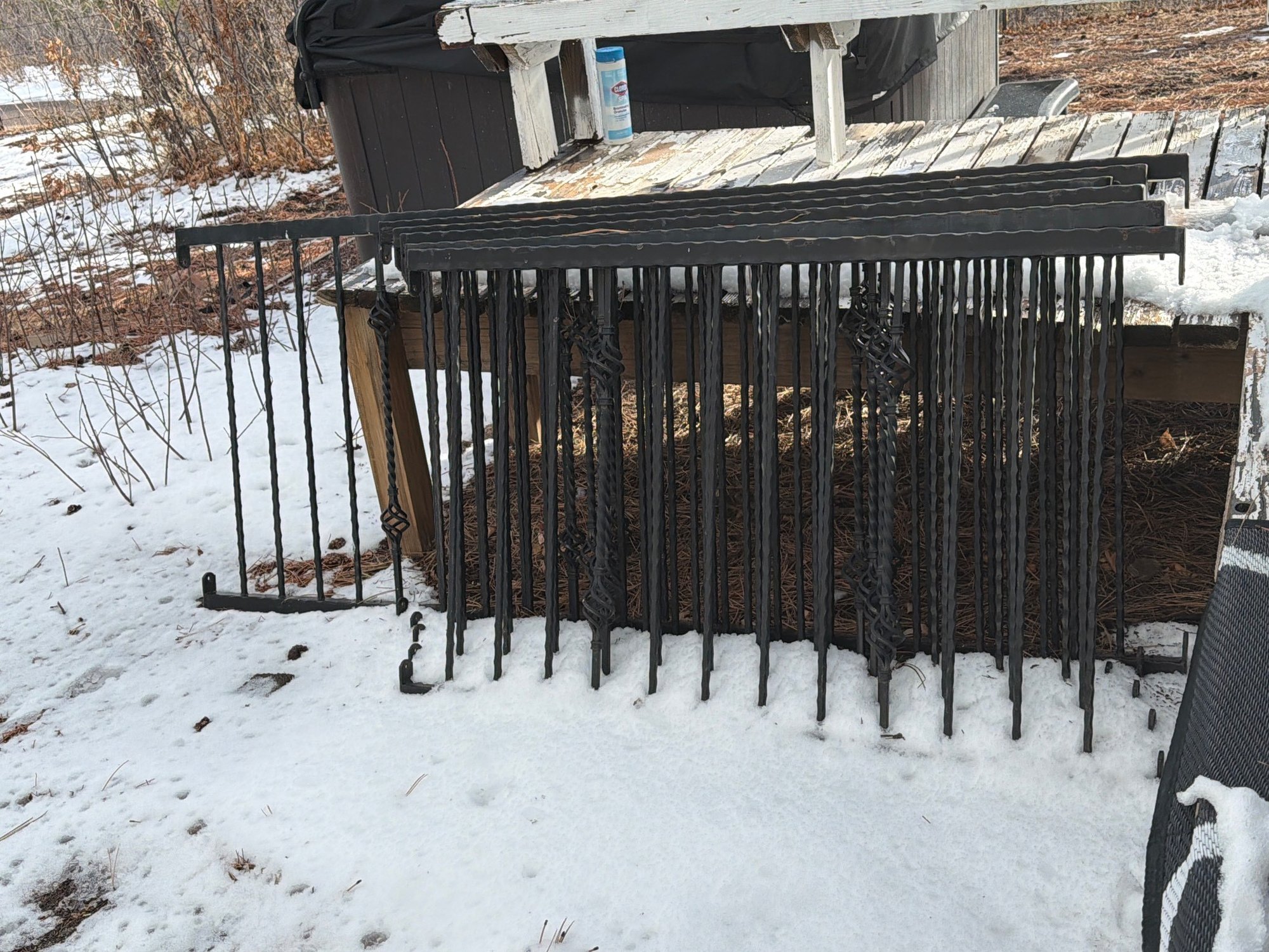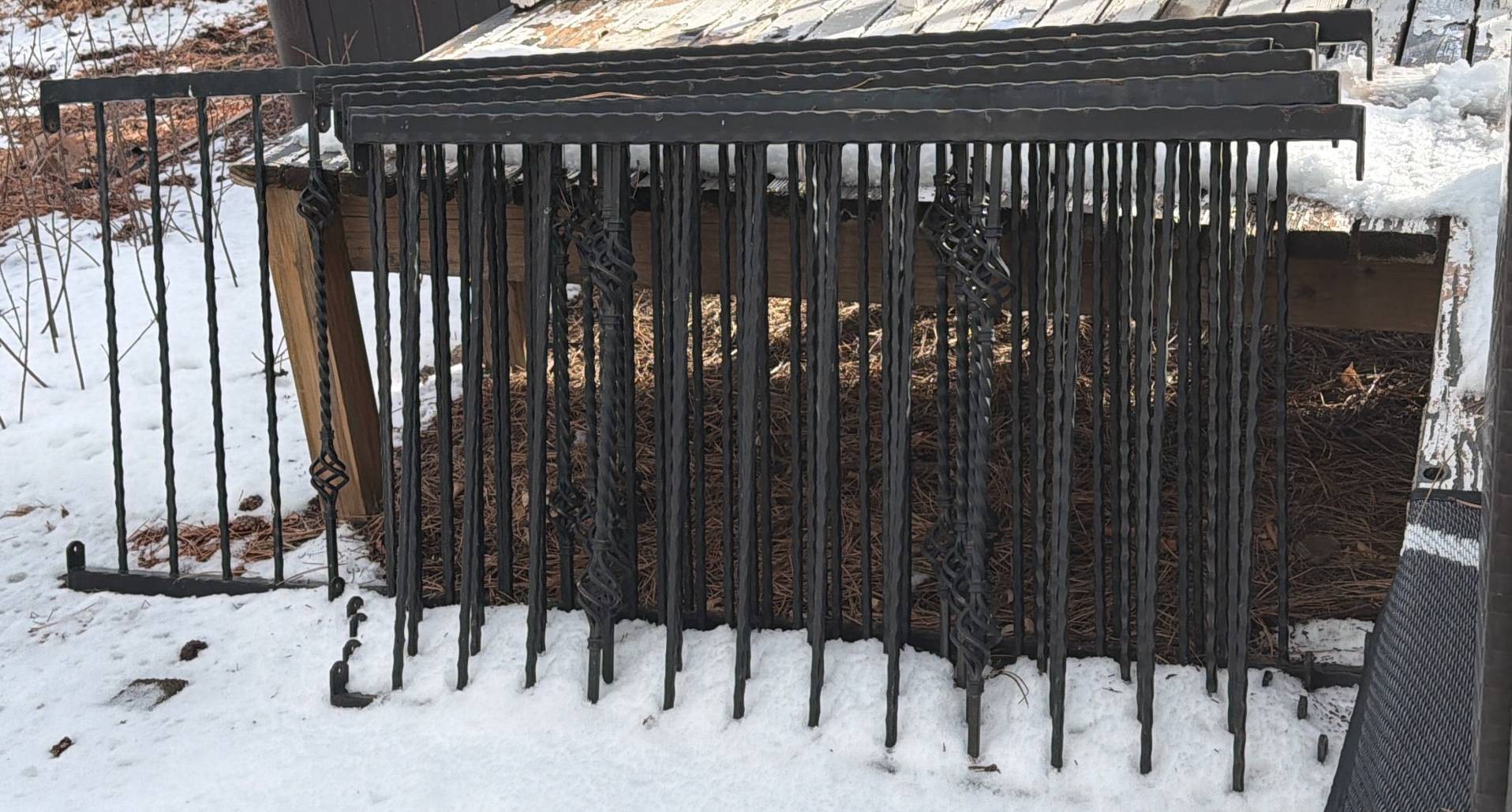 Metal fence panels, including multiple vertical rods with connected horizontal top bars. Each panel features pointed rod tips and brackets at the bottom for potential mounting. Panels appear to be in used condition, with minor wear from outdoor exposure. Dimensions available upon request.