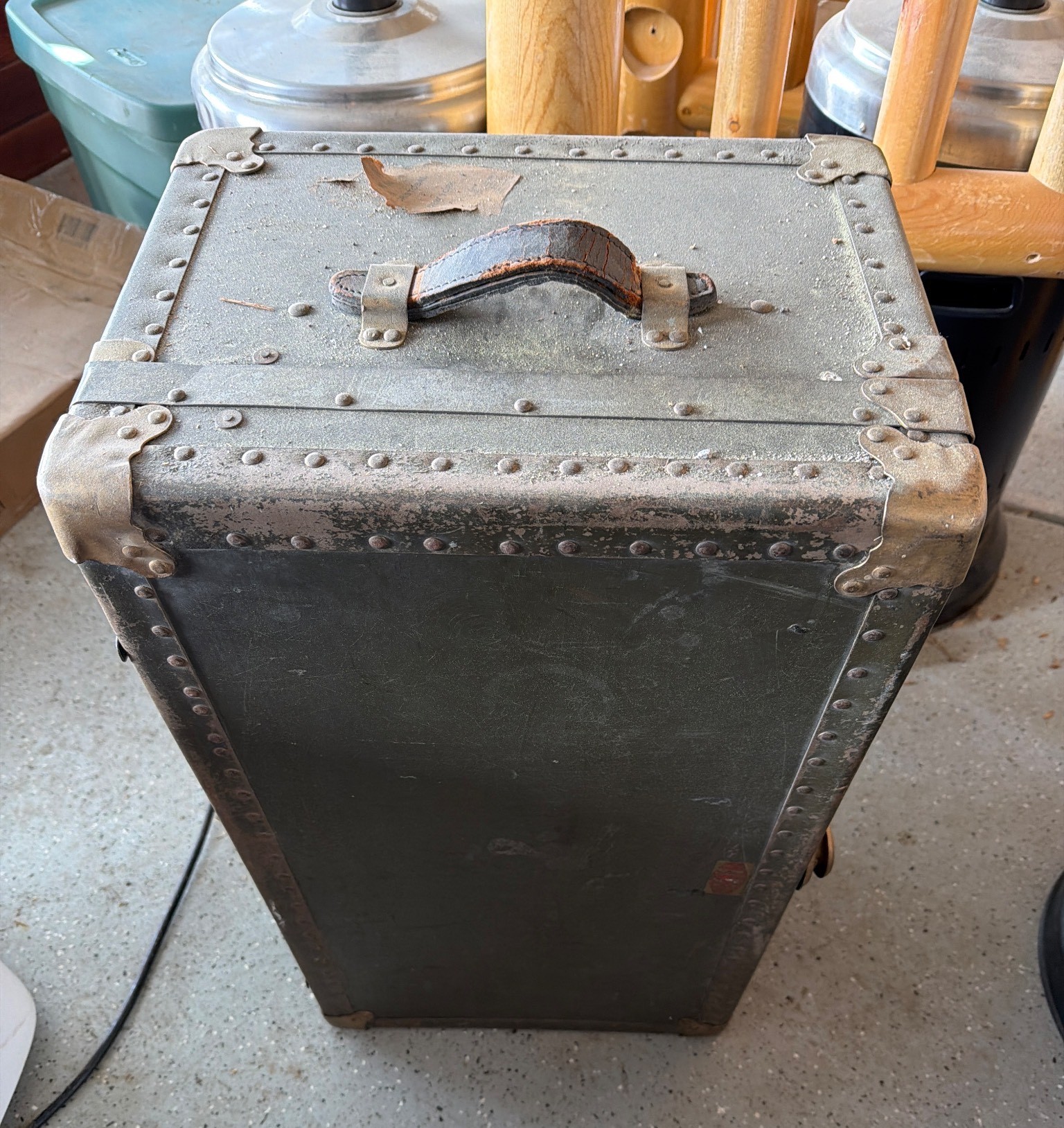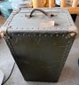 Metal storage trunk featuring a green finish, riveted edges, and reinforced corners. Equipped with a leather handle and functional metal latches. Overall wear, scratches, and patina present throughout, consistent with age and use. Measures approximately 24 inches in height, 13 inches in width, and 8 inches in depth.