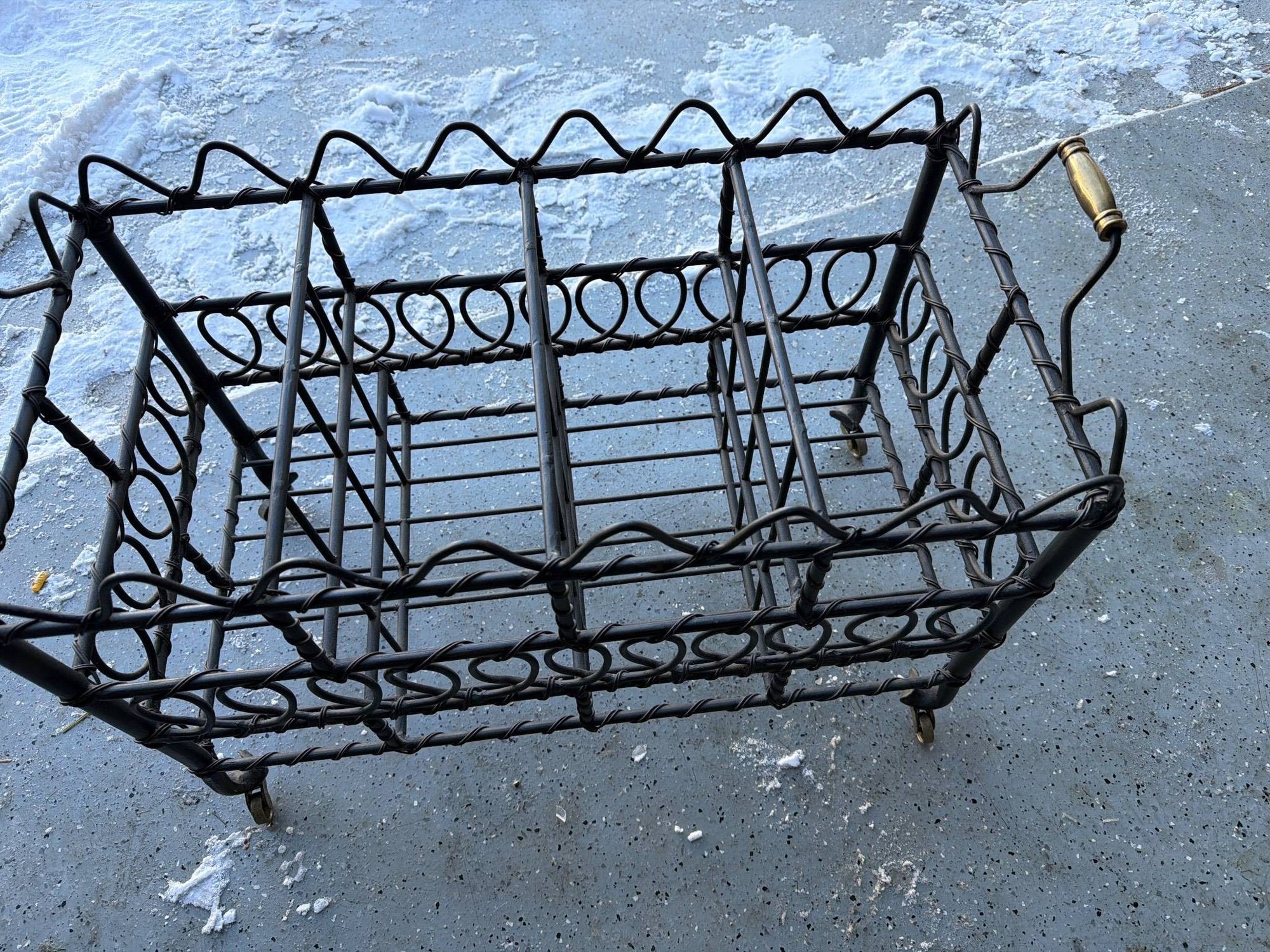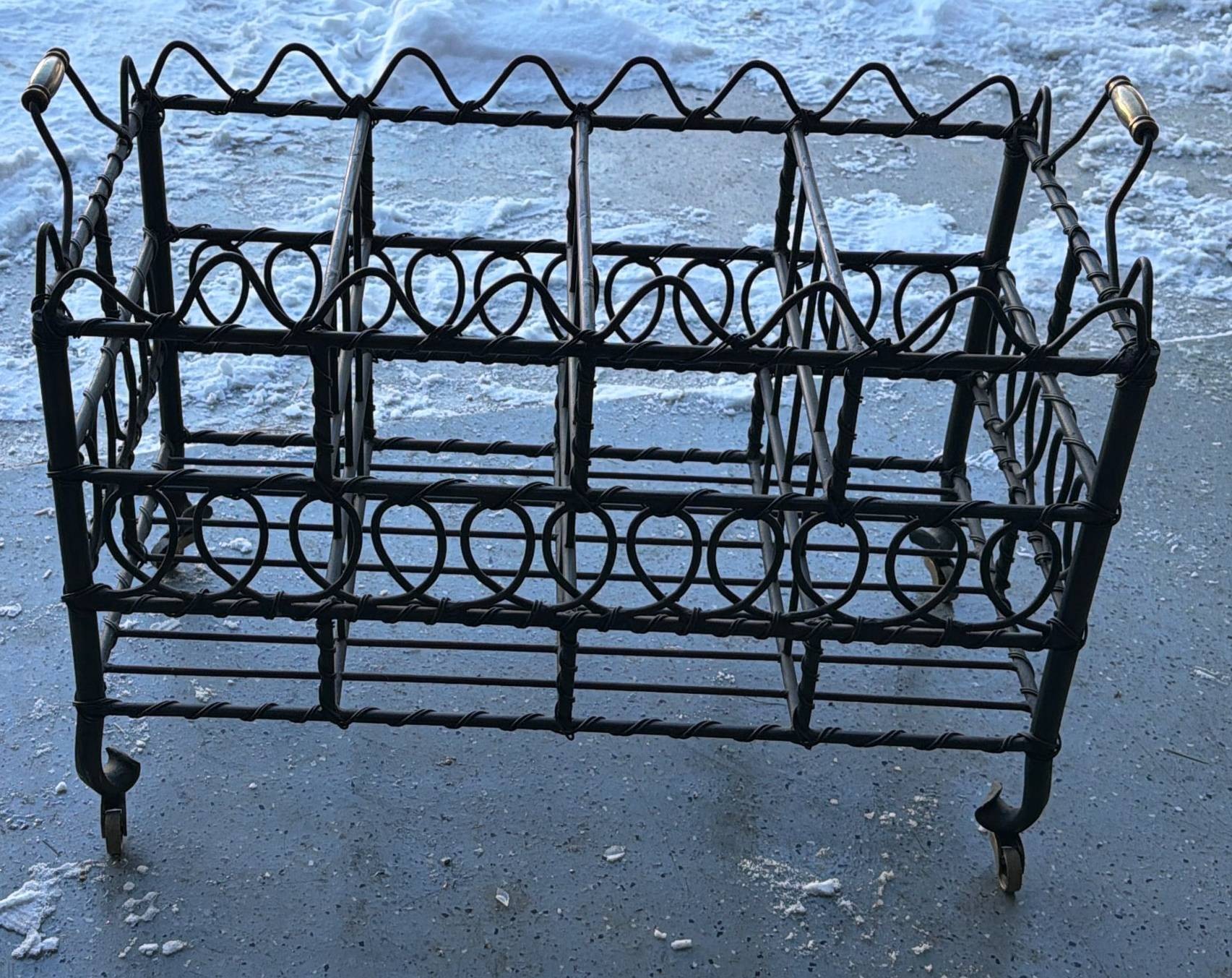 This metal rolling wine rack is designed to store bottles securely within its circular holders. The rack rests on four wheels, allowing it to be easily maneuvered. It features metalwork with a repeating circular pattern and is accented with gold-finished handles. The design includes multiple compartments for wine storage. Dimensions: 20 inches (height) x 29 inches (length) x 15 inches (width).
