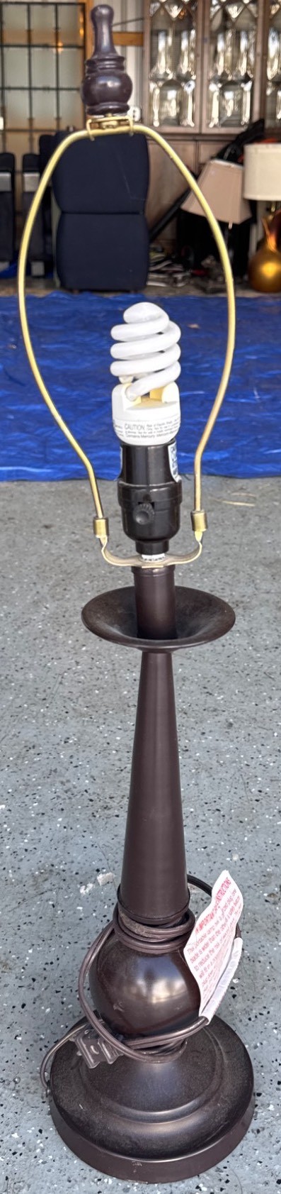 Metal table lamp base featuring a turned design with a bronze-toned finish. Includes a finial and harp for attaching a lampshade. Electrical fixture appears intact and includes a compact fluorescent bulb. Dimensions of the lamp base: approximately 25 inches tall.