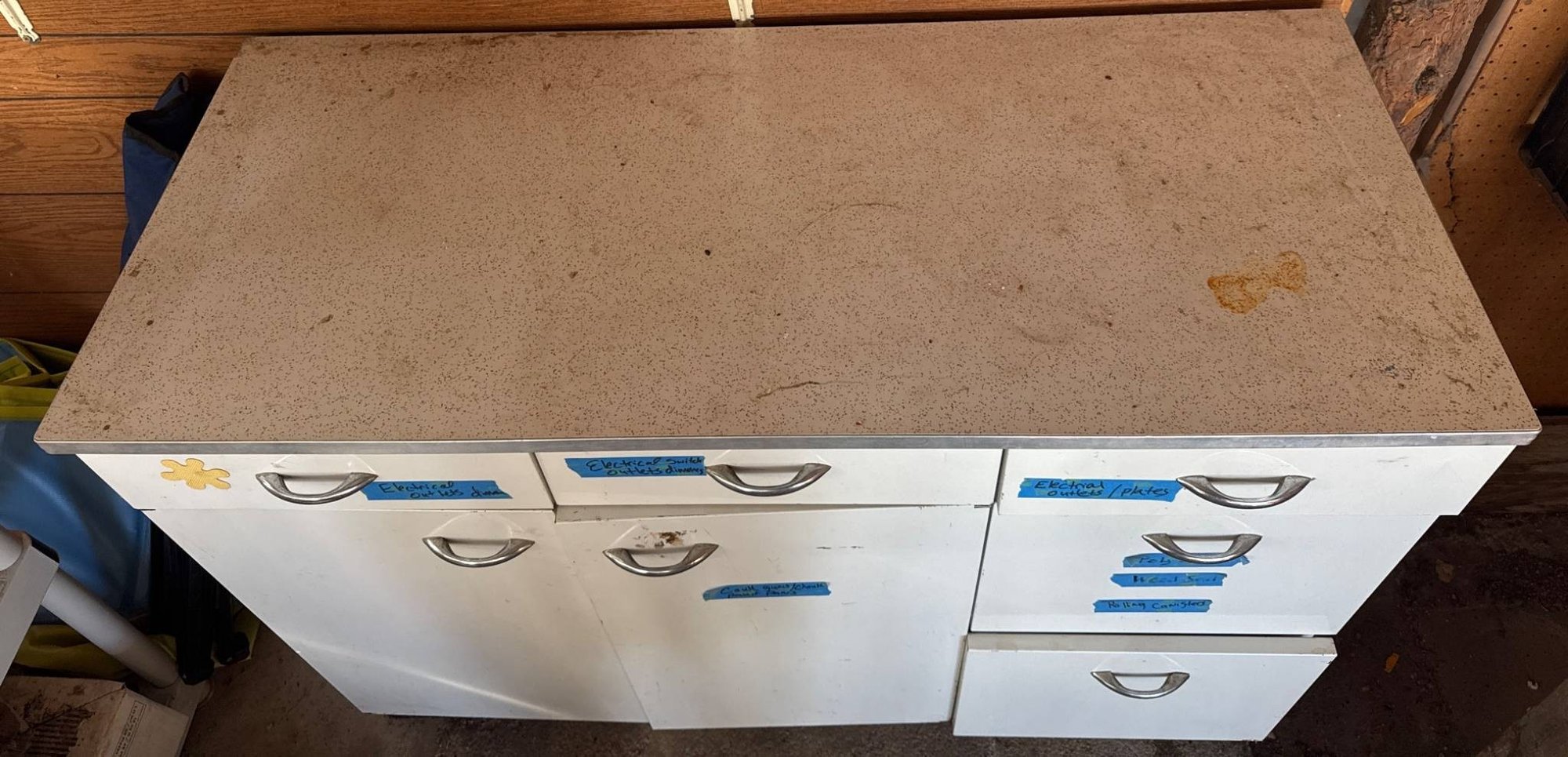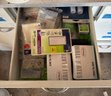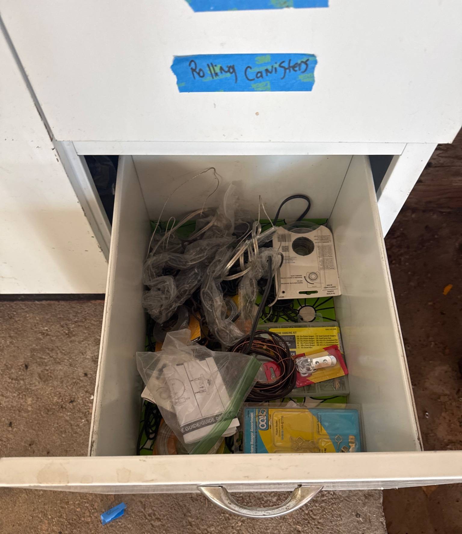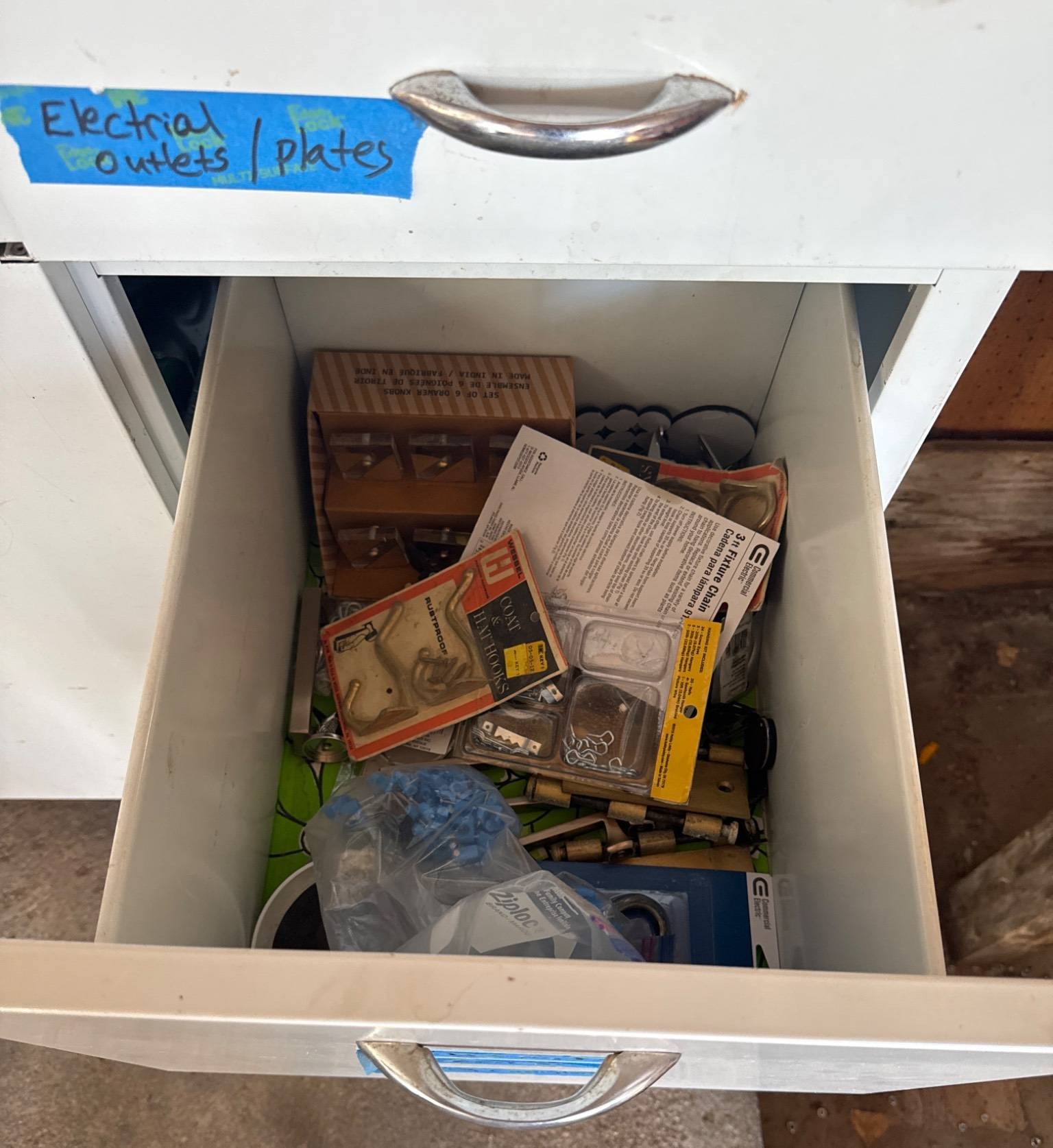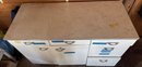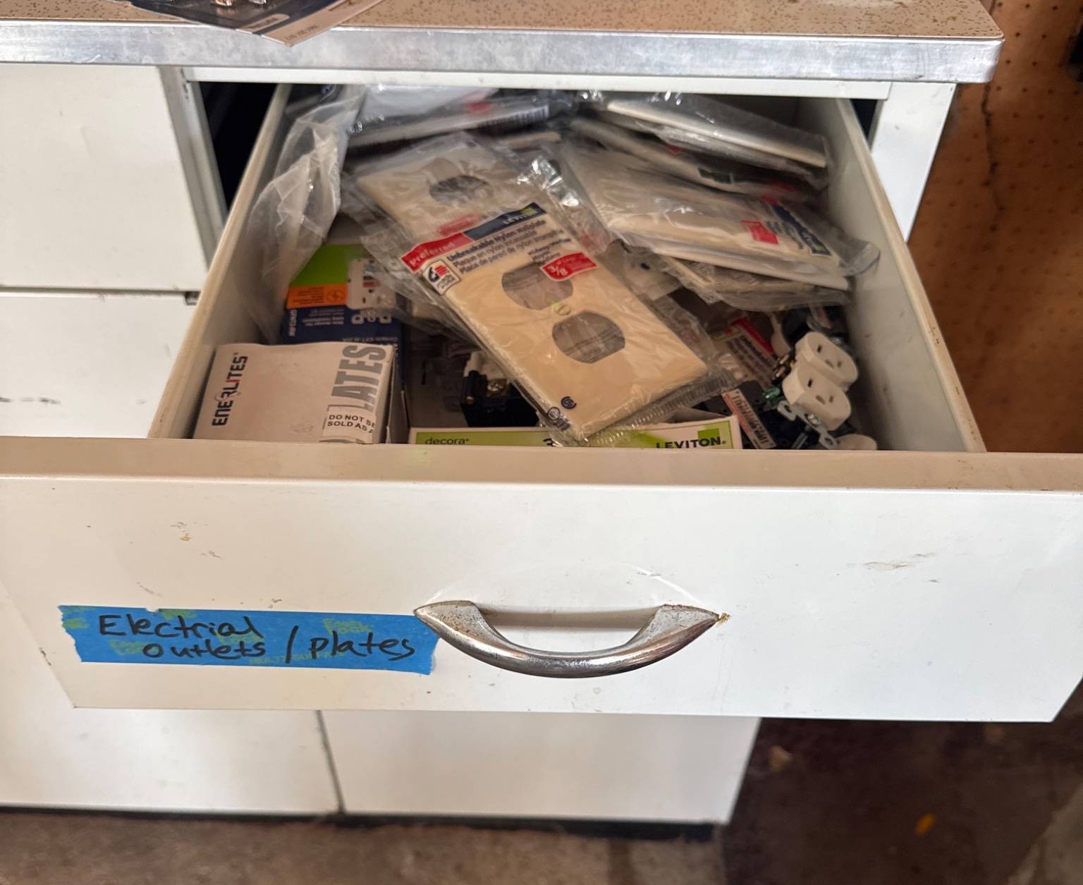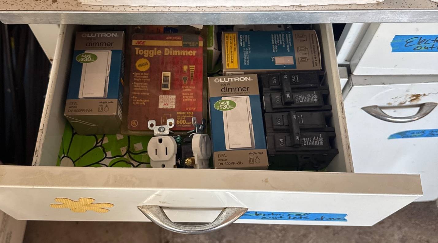 White cabinet containing multiple drawers and storage compartments, filled with assorted electrical components and supplies. Items include electrical outlets, plates, toggle dimmers, light switches, cable ties, and wiring accessories, as well as organizational bins with other miscellaneous parts. Dimensions of the cabinet: approximately 36 inches wide, 18 inches deep, and 34 inches high.