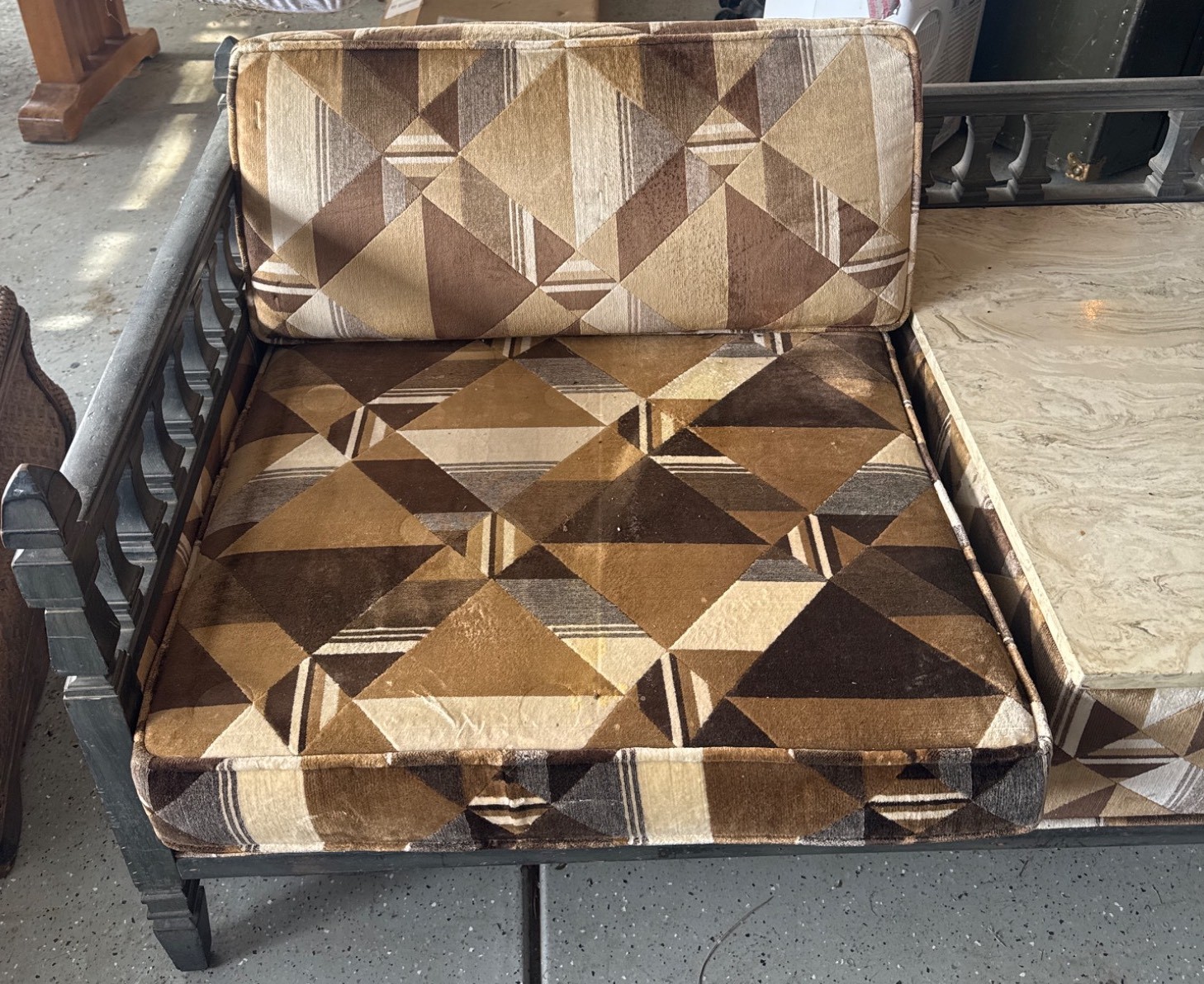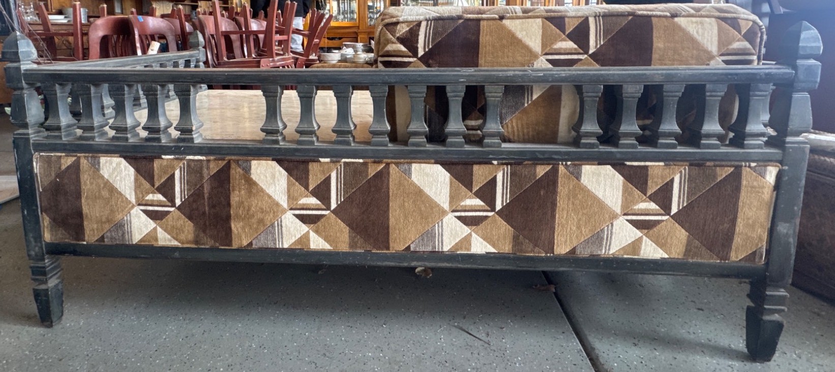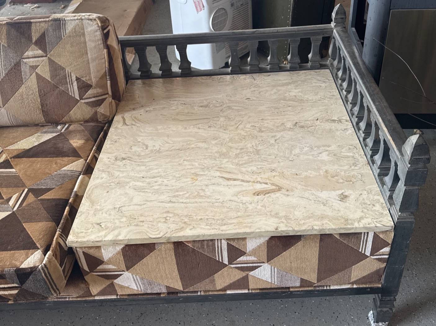 Wood-framed sofa featuring a geometric patterned upholstery in brown, beige, and cream tones. Includes a cushion-backed seating area and an adjacent integrated flat surface with wood paneling. The frame incorporates spindle detailing along the backrest and armrests. Visible wear and fabric discoloration consistent with use. Overall dimensions: Approximately 72 inches wide, 30 inches deep, 32 inches tall.
