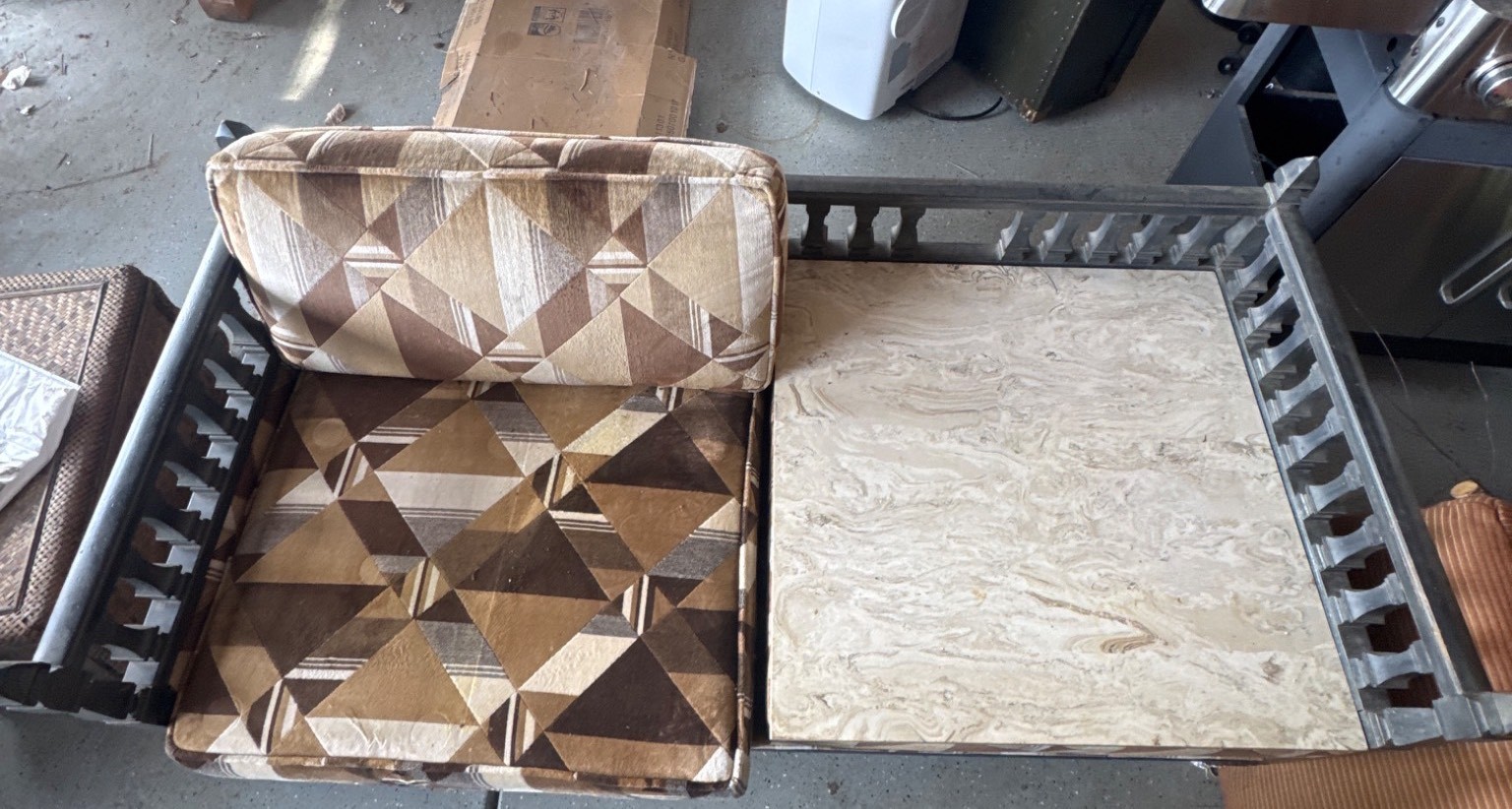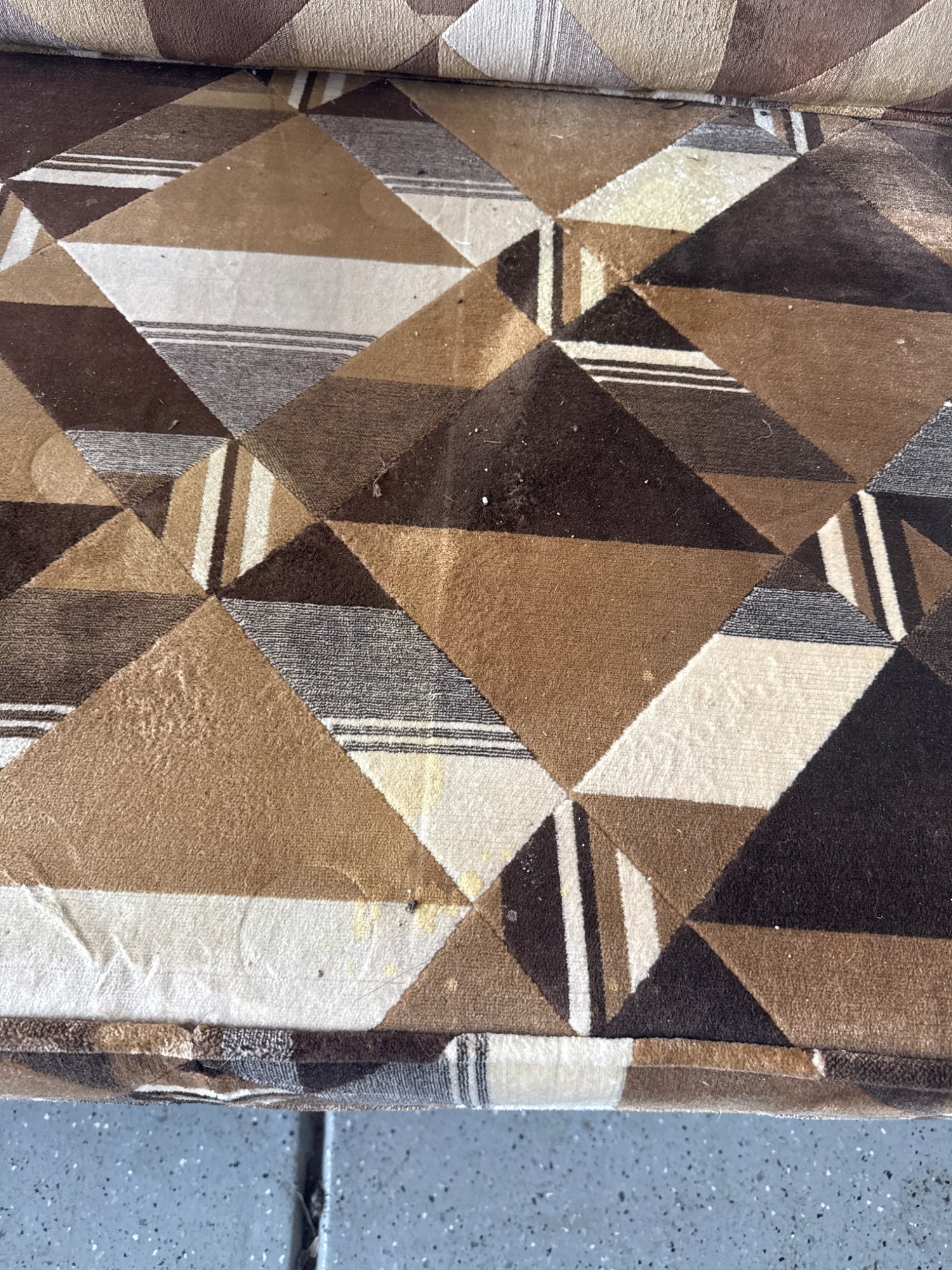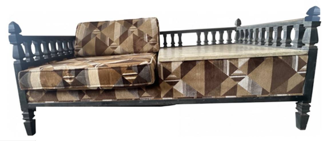 Wood-framed sofa featuring a geometric patterned upholstery in brown, beige, and cream tones. Includes a cushion-backed seating area and an adjacent integrated flat surface with wood paneling. The frame incorporates spindle detailing along the backrest and armrests. Visible wear and fabric discoloration consistent with use. Overall dimensions: Approximately 72 inches wide, 30 inches deep, 32 inches tall.