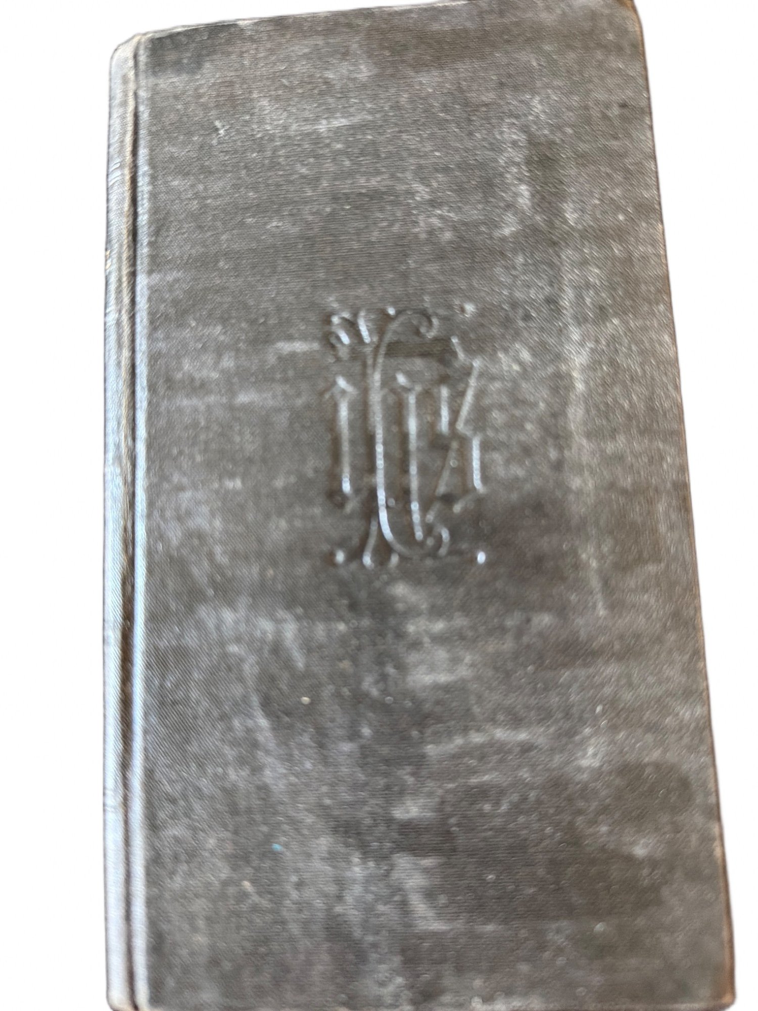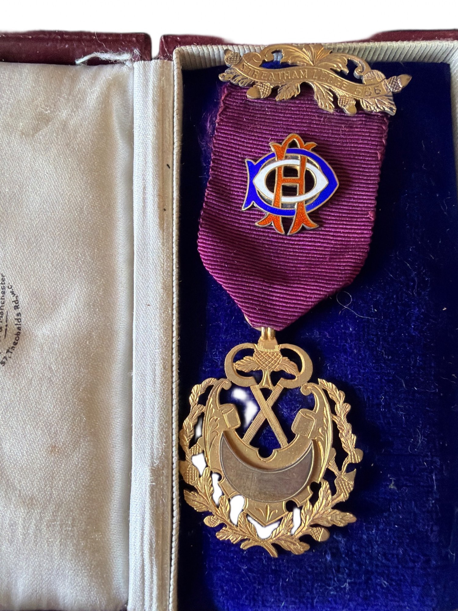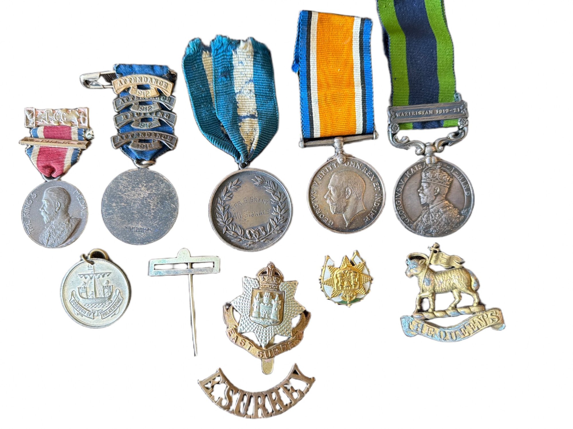 Military medals, ribbons, pins, and a book, along with a decorative presentation case containing a purple ribbon and gold-accented medallion of crossed axes enclosed in a wreath. The medals include various insignias and campaign awards with specific service indicators. The set also includes a vintage tin box labeled Cherry Bark Throat Pastilles. The book has an embossed cover with an unknown monogram.